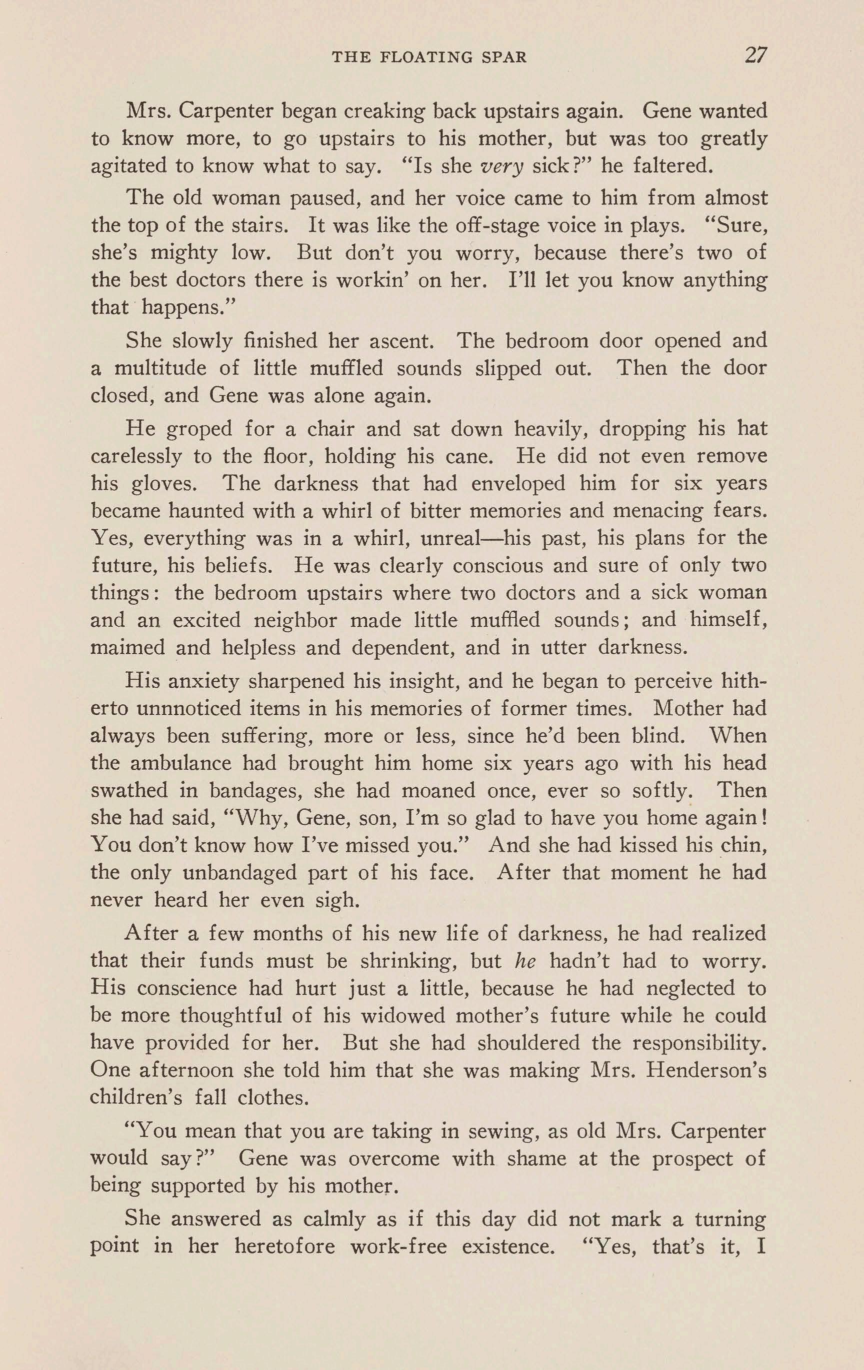 Mrs. Carpenter began creaking back upstairs again. Gene wanted to know more, to go upstairs to his mother, but was too greatly agitated to know what to say. "Is she very sick?" he faltered.