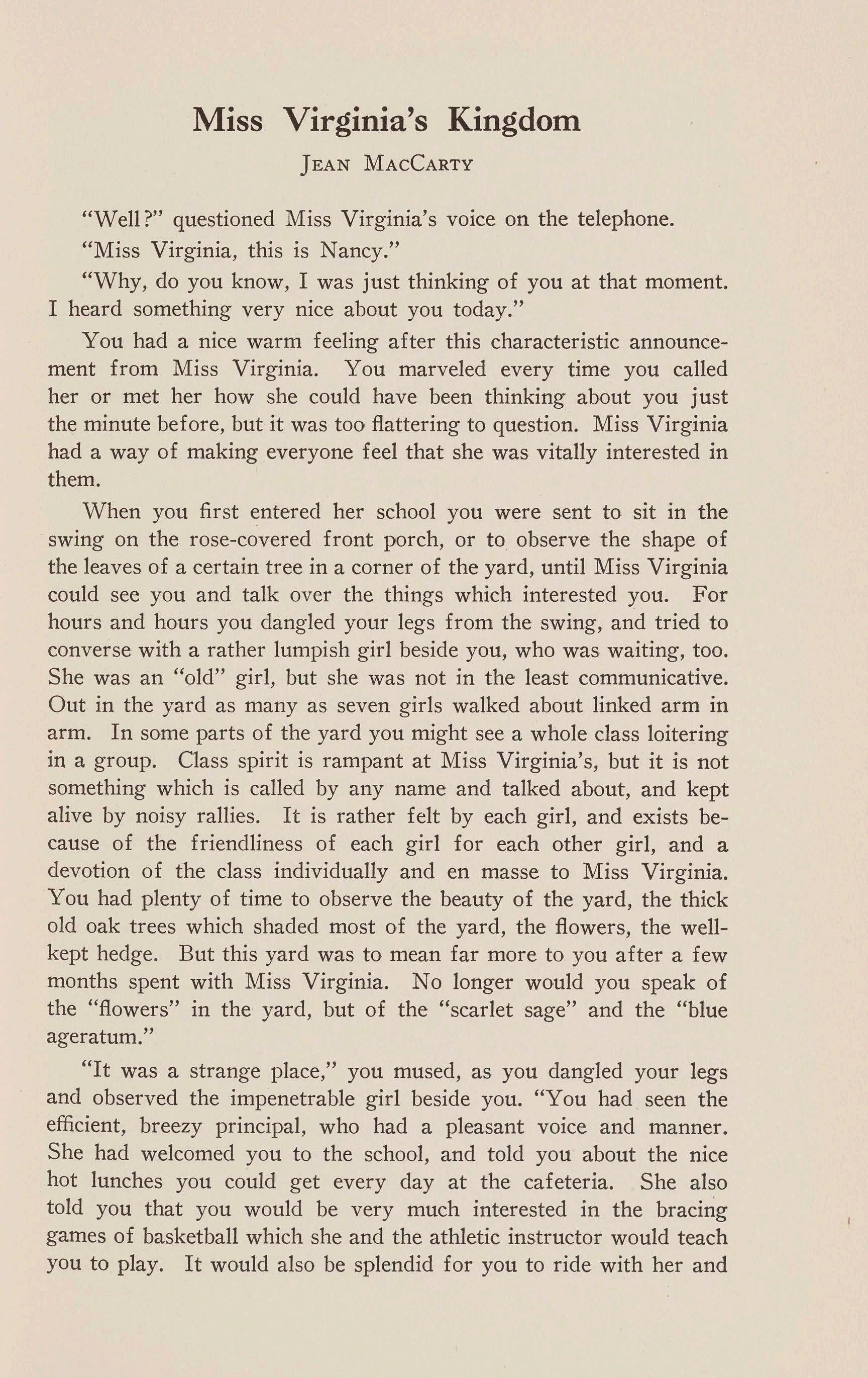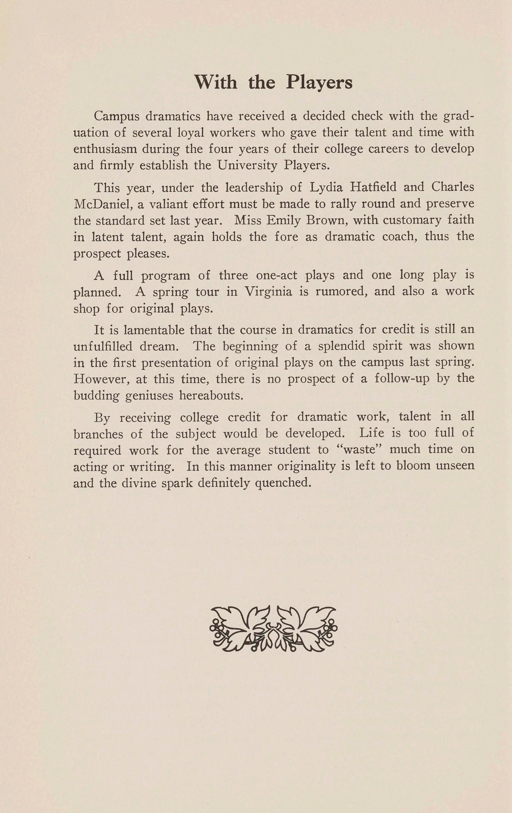 This year, under the leadership of Lydia Hatfield and Charles McDaniel, a valiant effort must be made to rally round and preserve the standard set last year. Miss Emily Brown, with customary faith in latent talent, again holds the fore as dramatic coach, thus the prospect pleases.