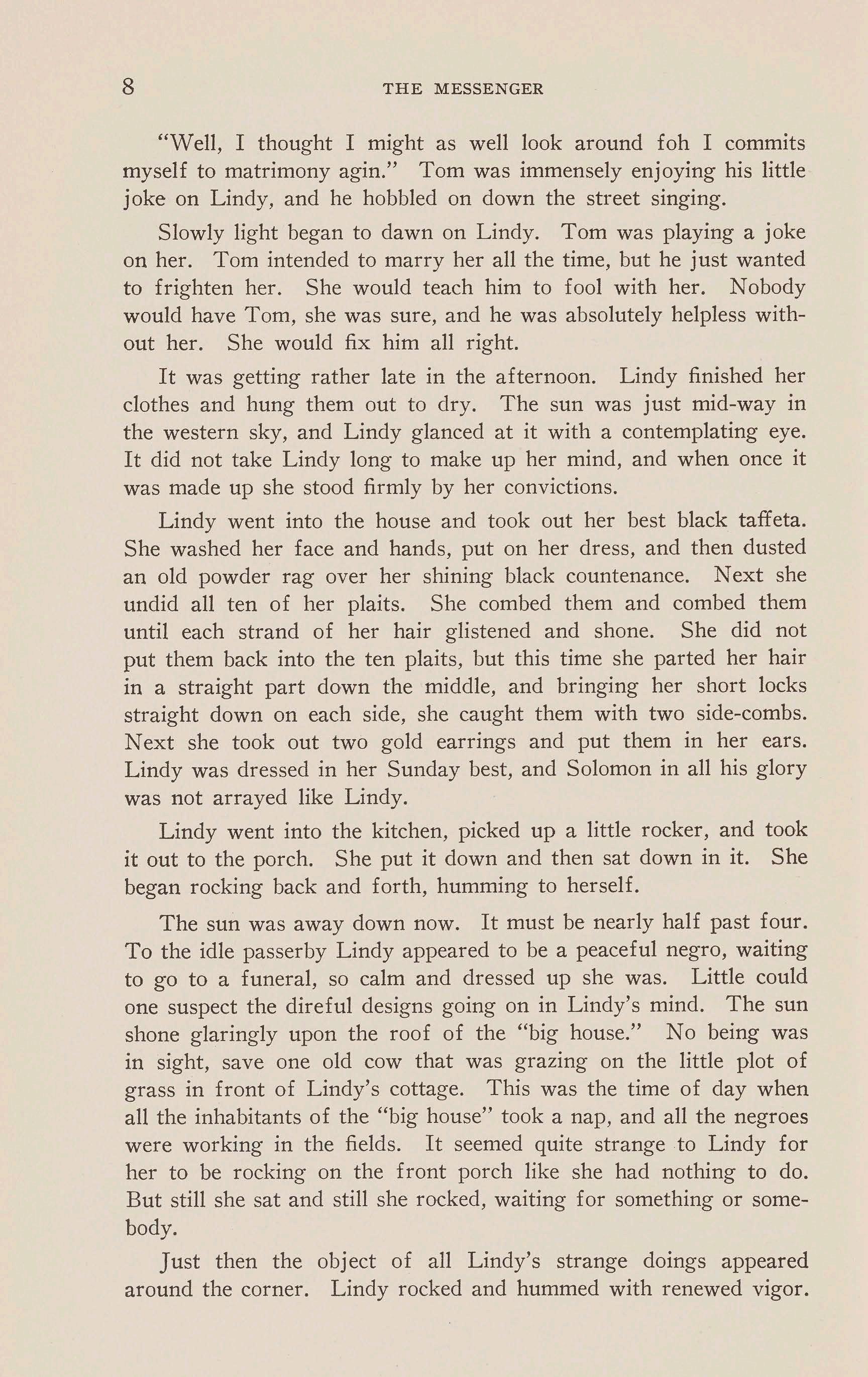 The sun was away down now. It must be nearly half past four. To the idle passerby Lindy appeared to be a peaceful negro, waiting to go to a funeral, so calm and dressed up she was. Little could one suspect the direful designs going on in Lindy's mind. The sun shone glaringly upon the roof of the "big house." No being was in sight, save one old cow that was grazing on the little plot of grass in front of Lindy's cottage. This was the time of day when all the inhabitants of the "big house" took a nap , and all the negroes were working in the fields. It seemed quite strange to Lindy for her to be rocking on the front porch like she had nothing to do. But still she sat and still she rocked, waiting for something or somebody.