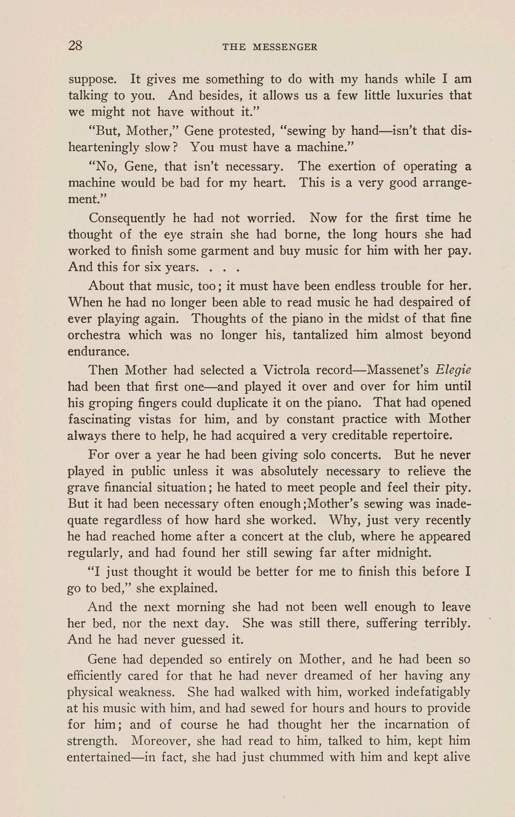 Gene had depended so entirely on Mother, and he had been so efficiently cared for that he had never dreamed of her having any physical weakness. She had walked with him, worked indefatigably at his music with him, and had sewed for hours and hours to provide for him; and of course he had thought her the incarnation of strength. Moreover, she had read to him, talked to him, kept him entertained-in fact, she had just chummed with him and kept alive