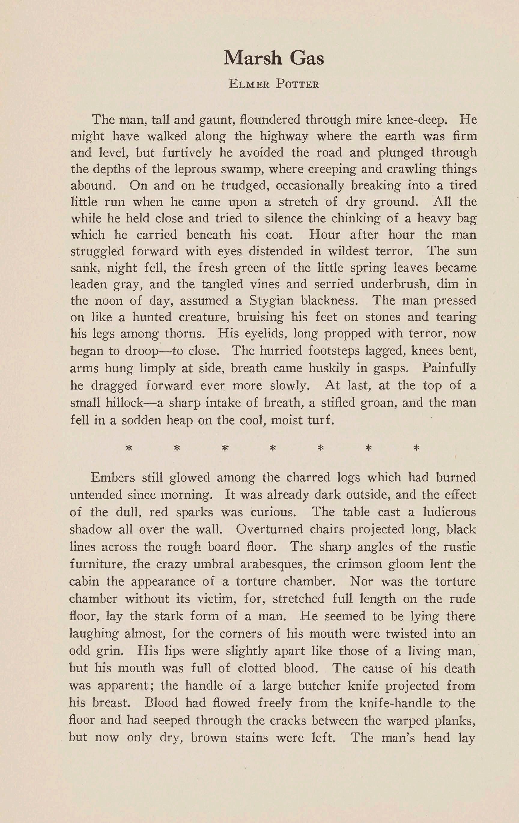 The man, tall and gaunt, floundered through mire knee-deep. He might have walked along the highway where the earth was firm and level, but furtively he avoided the road and plunged through the depths of the leprous swamp, where creeping and crawling things abound. On and on he trudged, occasionally breaking into a tired little run when he came upon a stretch of dry ground. All the while he held close and tried to silence the chinking of a heavy bag which he carried beneath his coat. Hour after hour the man struggled forward with eyes distended in wildest terror. The sun sank, night fell, the fresh green of the little spring leaves became leaden gray, and the tangled vines and serried underbrush, dim in the noon of day, assumed a Stygian blackness. The man pressed on like a hunted creature, bruising his feet on stones and tearing his legs among thorns. His eyelids, long propped with terror, now began to droop-to close. The hurried footsteps lagged, knees bent, arms hung limply at side, breath came huskily in gasps. Painfully he dragged forward ever more slowly. At last, at the top of a small hillock-a sharp intake of breath, a stifled groan, and the man fell in a sodden heap on the cool, moist turf. * * * * * * *