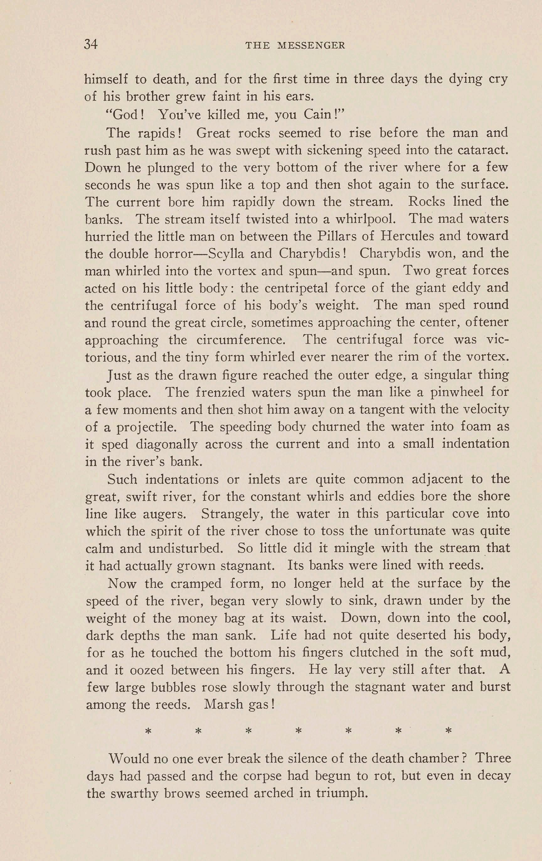 Now the cramped form, no longer held at the surface by the speed of the river, began very slowly to sink, drawn under by the weight of the money bag at its waist. Down, down into the cool, dark depths the man sank. Life had not quite deserted his body, for as he touched the bottom his fingers clutched in the soft mud, and it oozed between his fingers. He lay very still after that. A few large bubbles rose slowly through the stagnant water and burst among the reeds. Marsh gas ! * * * * * * *