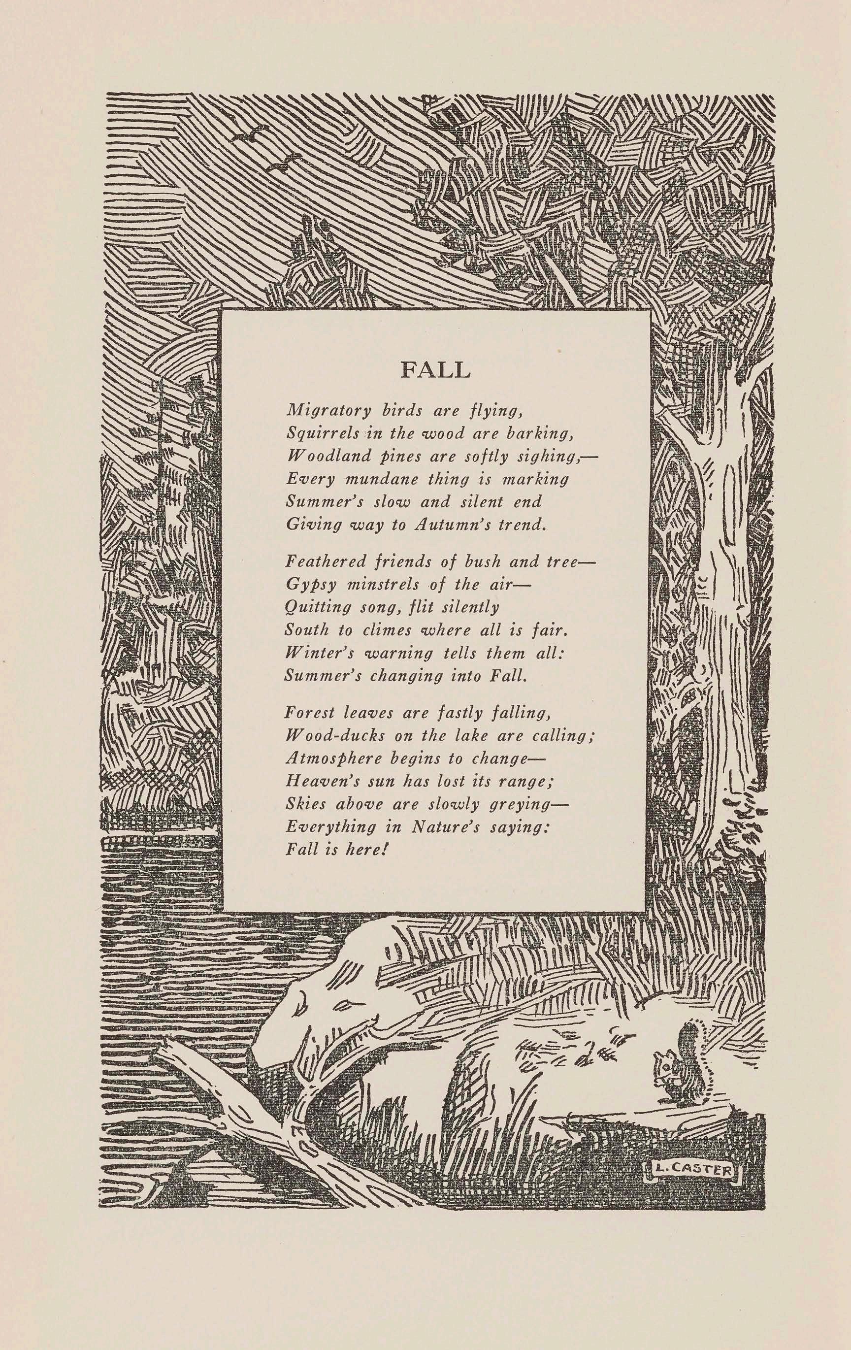 Forest leaves are fastly falling, Wood-ducks on the lake are calling; Atmosphere begins to changeHeaven's sun has lost its range; Skies above are slowly greyingEverything in Nature's saying: Fall is here!