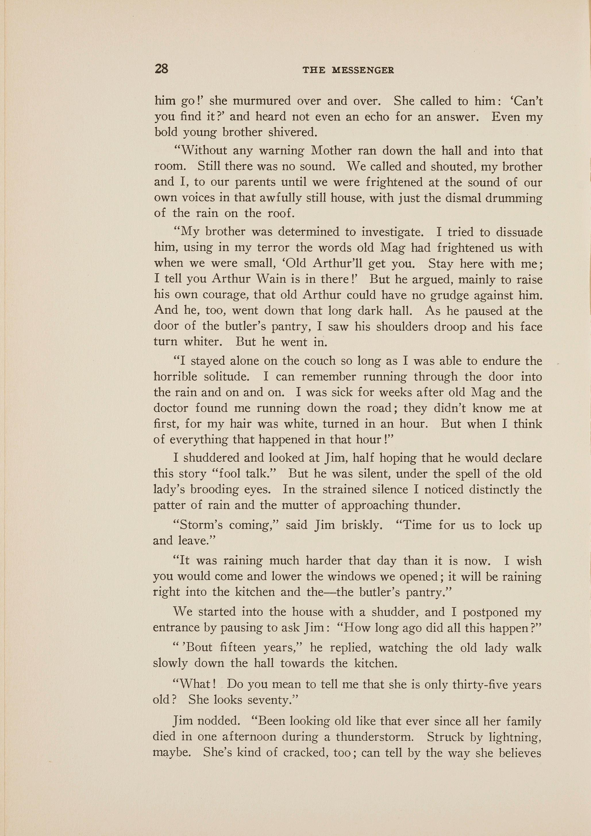 Jim nodded. "Been looking old like that ever since all her family died in one afternoon during a thunderstorm. Struck by lightning, maybe. She's kind of cracked, too; can tell by the way she believes