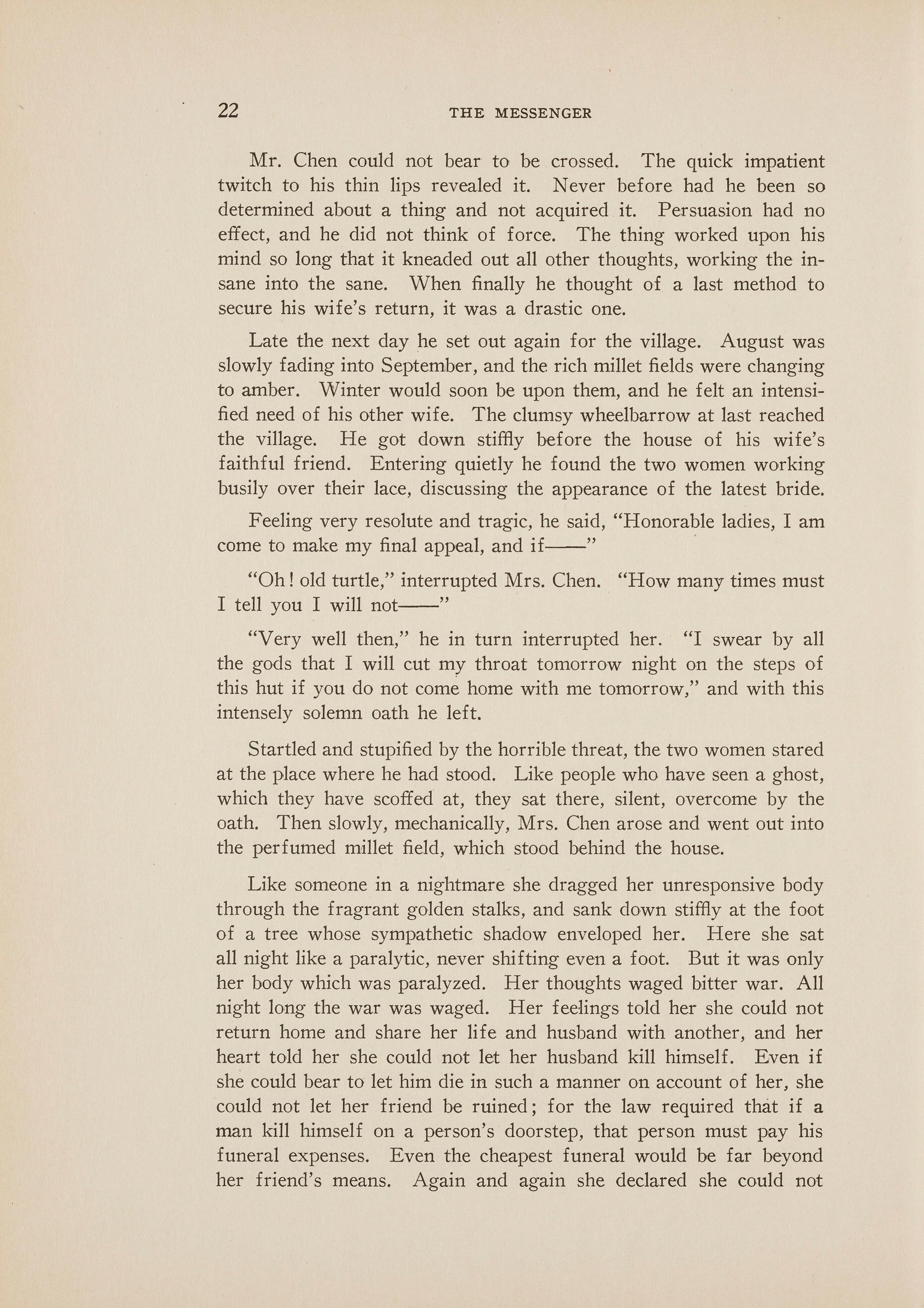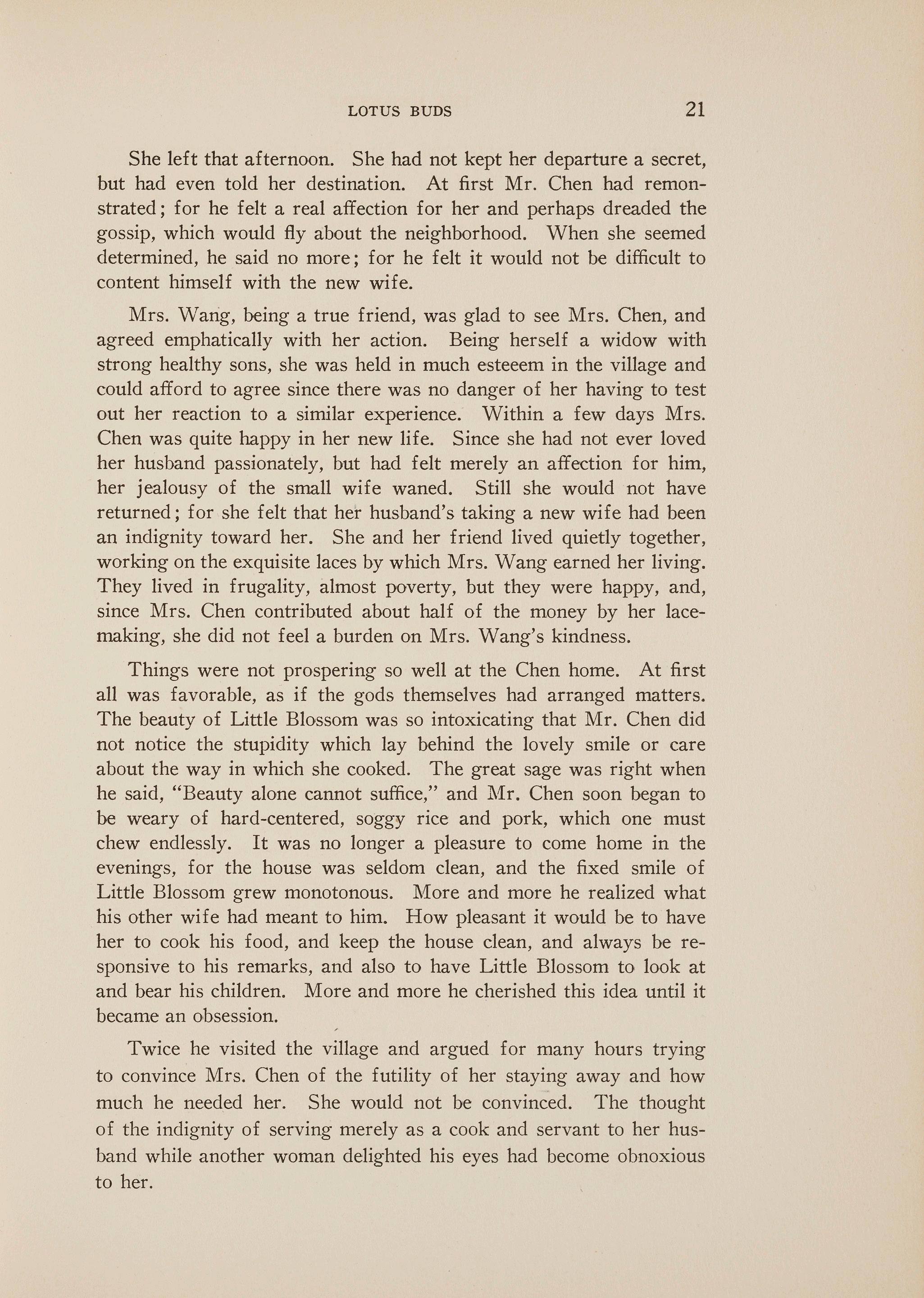 Suddenly the flame of the light began to flicker fitfully, and Mrs. Chen arose quickly to turn down the wick. The light was a luxury. Mr. Chen had gone to a village to buy some new silks for his little shop, as he said, and would not be home until the next morning. Never would he have allowed such a waste of oil as to burn a light in the courtyard even on the blackest night. But Mrs. Chen was deathly afraid of the dark, and so she sat in the flickering light, thinking of h~r husband and their married life.