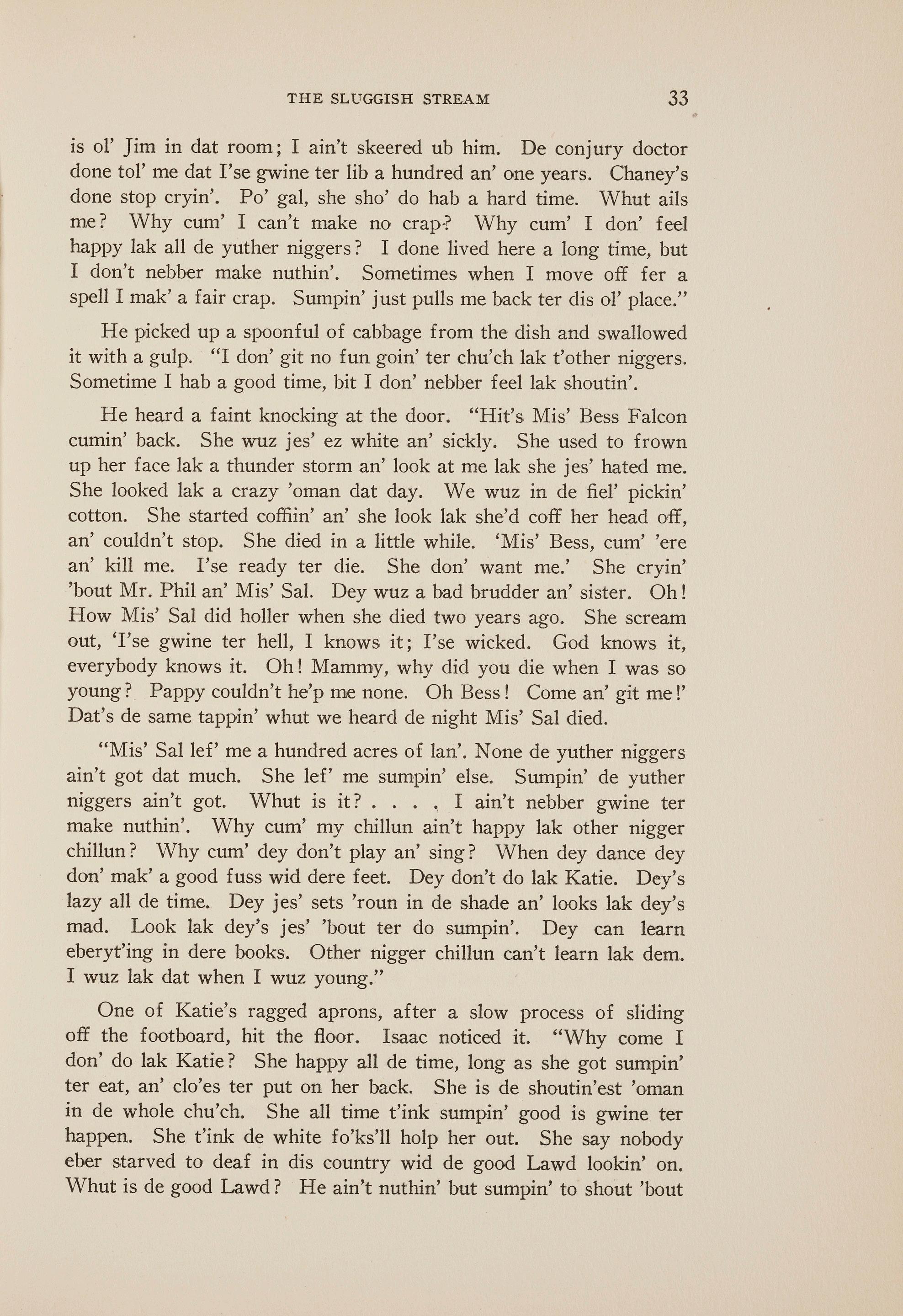 "God! I know whut ails me-all my white fo'ks has done put a spell on me. Dey has cussed me. I ain't lak Katie, but I ain't lak Mister Abraham kaze he is white. He all time t'inkin' 'bout nex 1 winter an' nex' summer. She's happy all de time. Mister Jim an' Mis' Sal has lef' me sumpin' whut is wuss clan all de conjurin' in worl'. I'se got mixed blood. 'Tain't right."