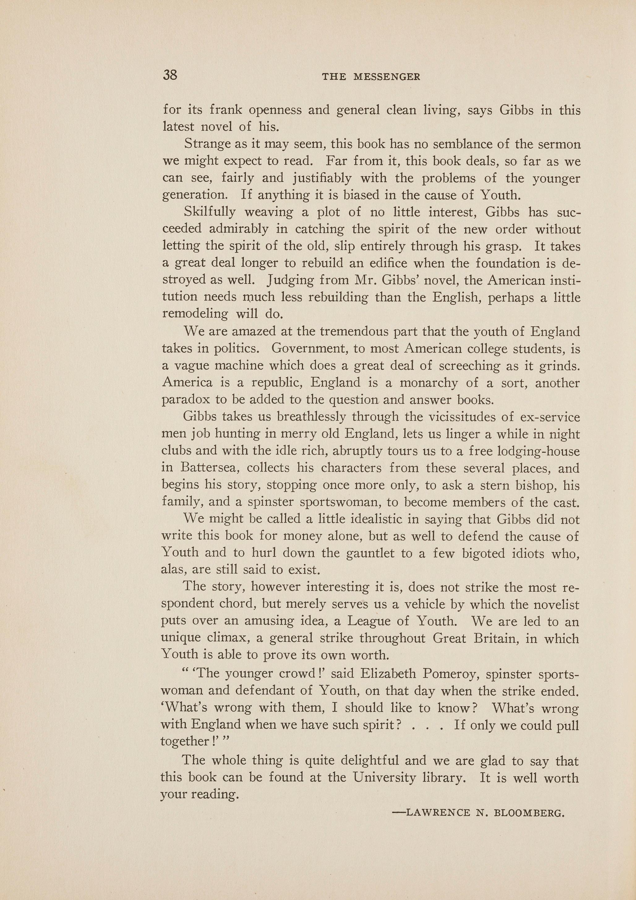 Skilfully weaving a plot of no little interest, Gibbs has succeeded admirably in catching the spirit of the new order without letting the spirit of the old, slip entirely through his grasp. It takes a great deal longer to rebuild an edifice when the foundation is destroyed as well. Judging from Mr. Gibbs' novel, the American institution needs n:mch less rebuilding than the English, perhaps a little remodeling will do.