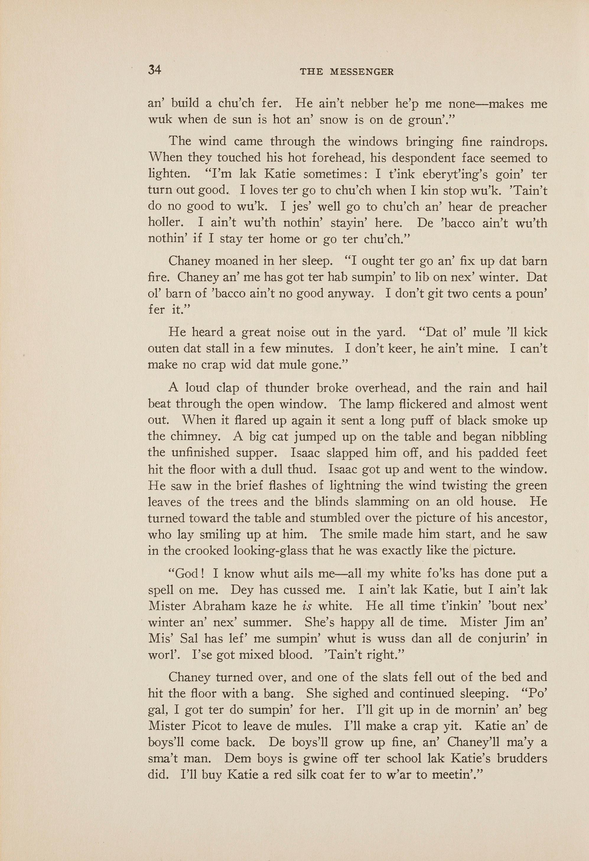 Chaney flung herself down on the dingy bed and began crying. Isaac heard the fading voices of Katie and the boys-and their bare feet swishing in the gravels, above Chaney's muffled sobs. He sat down by the unfinished supper . The oil lamp sent forked flames up into the smutty chimney. Thunder rumbled far in the west and heat lightning flashed back and forth. Chaney continued crying. He thought, "Whut's de matter wid me; whut is I got le£'? My ol' 'oman an' two boys is le£' me. Why come I'se always reachin' out atter sumpin' an' can't niver git it?" A sharp flash of lightning zig-zagged across the room. Thunder broke the awful monotony of Chaney's crying. "Why come she don't stop?" The lamp gave a fitful flicker. He heard something tapping up stairs on the floor. "Whut is it? Is it ol' man Jim Falcon cum' back to pester me? He died in <lat very room. His shoes is dere whar he le£' dem, wid the ribber mud stickin' on dem. He took dem off fifty years ago ter crawl up in his ol' dirty bed an' die." He heard the tapping grow louder. "Hit sho'