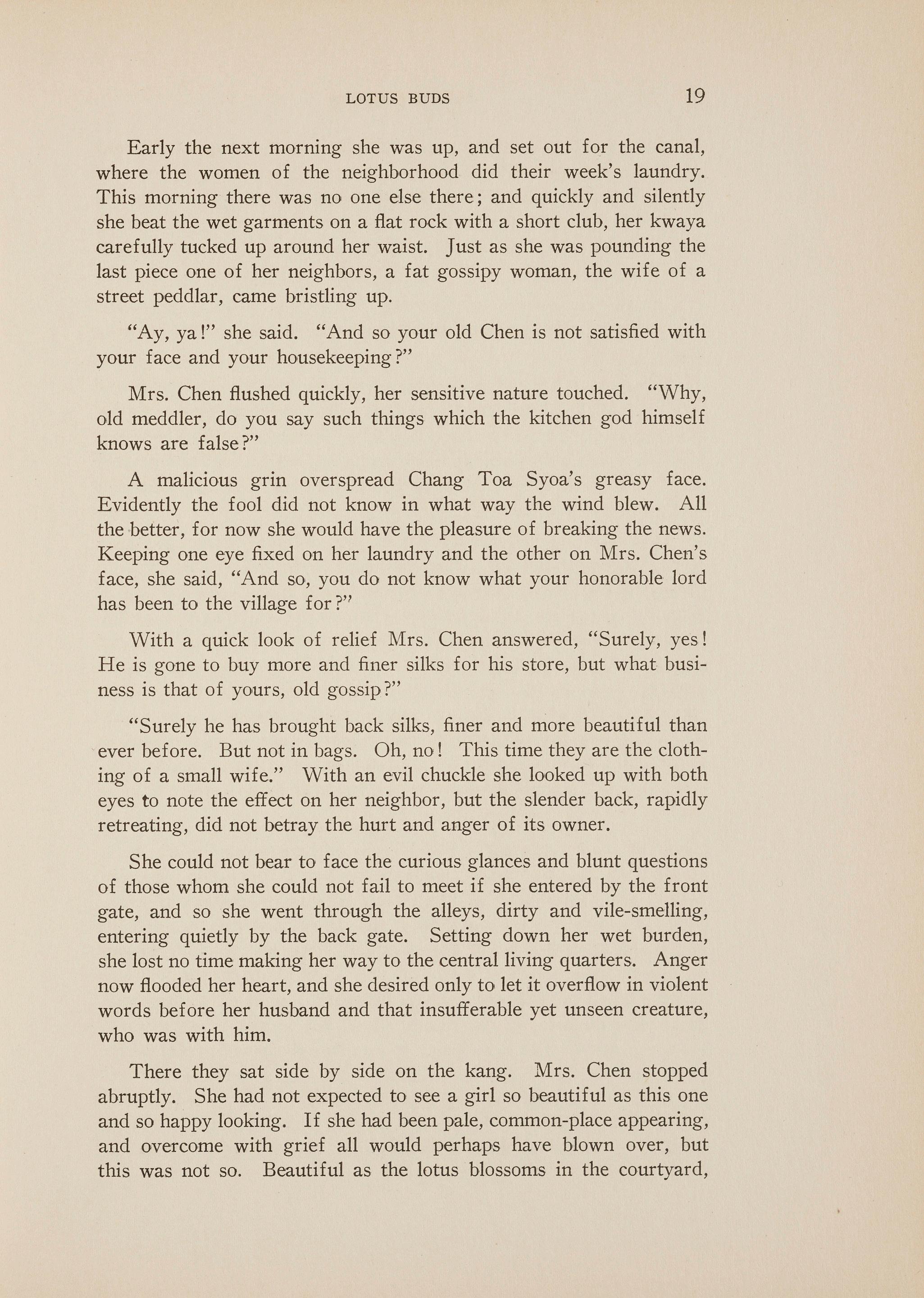 Mrs. Chen sat heavily on the hard bench, her hands crossed neatly on her lap and her coarse blue cotton garment smoothed out beneath them. The bright starlight lighted up the distant end of the court, softening the harshness of the outlines, just as the artist smoothes away the hard edgings of the picture he loves. The kerosene lantern, hung above Mrs. Chen's head, intensified every detail of her appearance. Its dirty yellow light outlined boldly the many deep wrinkles of the weary face. ' One knew that these wrinkles were not those of age; for a single glance at the tiny tortured feet told of