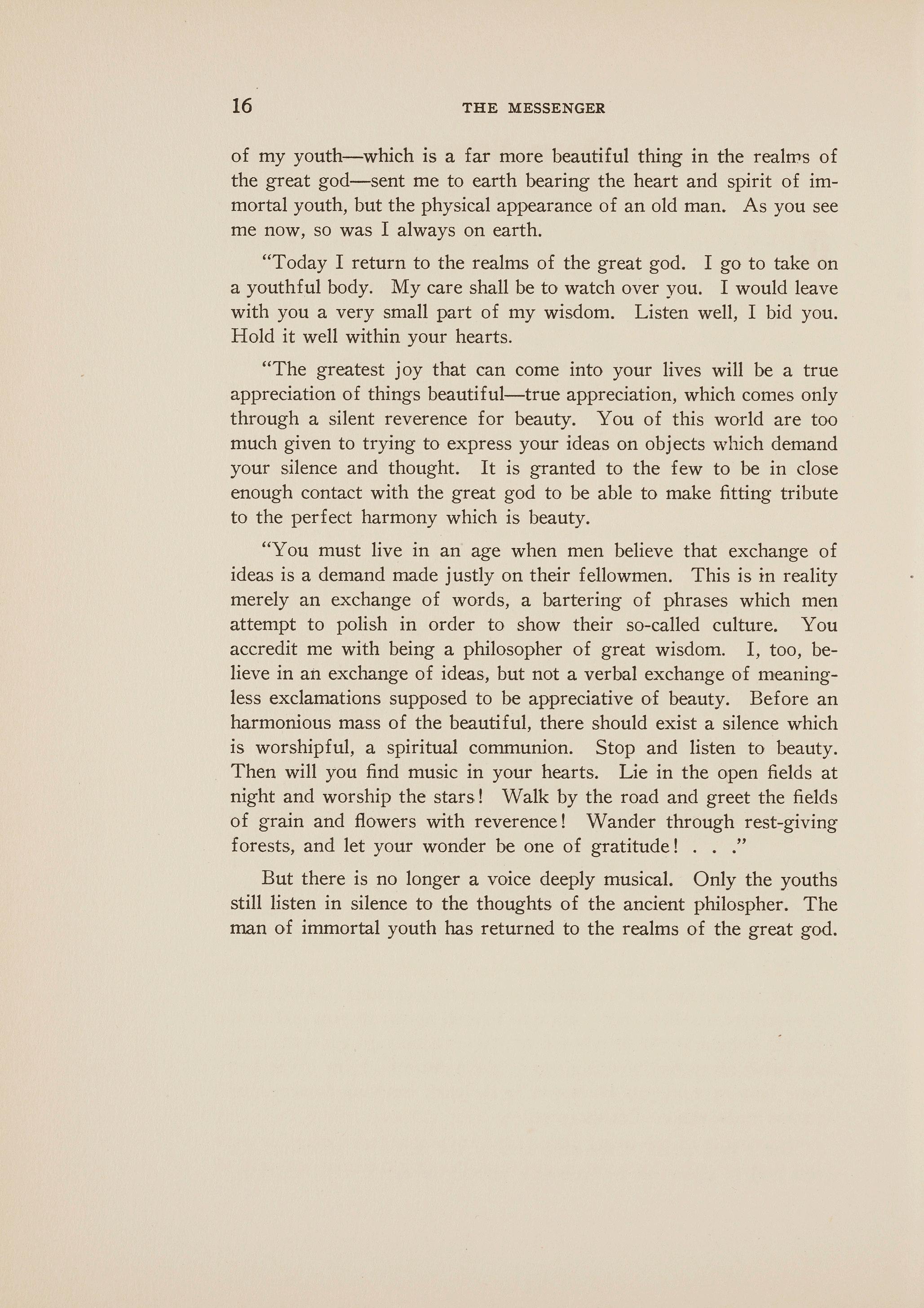 "You must live in an age when men believe that exchange of ideas is a demand made justly on their fellowmen. This is in reality merely an exchange of words, a bartering of phrases which men attempt to polish in order to show their so-called culture. You accredit me with being a philosopher of great wisdom. I, too, believe in art exchange of ideas, but not a verbal exchange of meaningless exclamations supposed to be appreciative of beauty. Before an harmonious mass of the beautiful, there should exist a silence which is worshipful, a spiritual communion Stop and listen to beauty. Then will you find music in your hearts. Lie in the open fields at night and worship the stars! Walk by the road and greet the fields of grain and flowers with reverence! Wander through rest-giving forests, and let your wonder be one of gratitude! . . ."