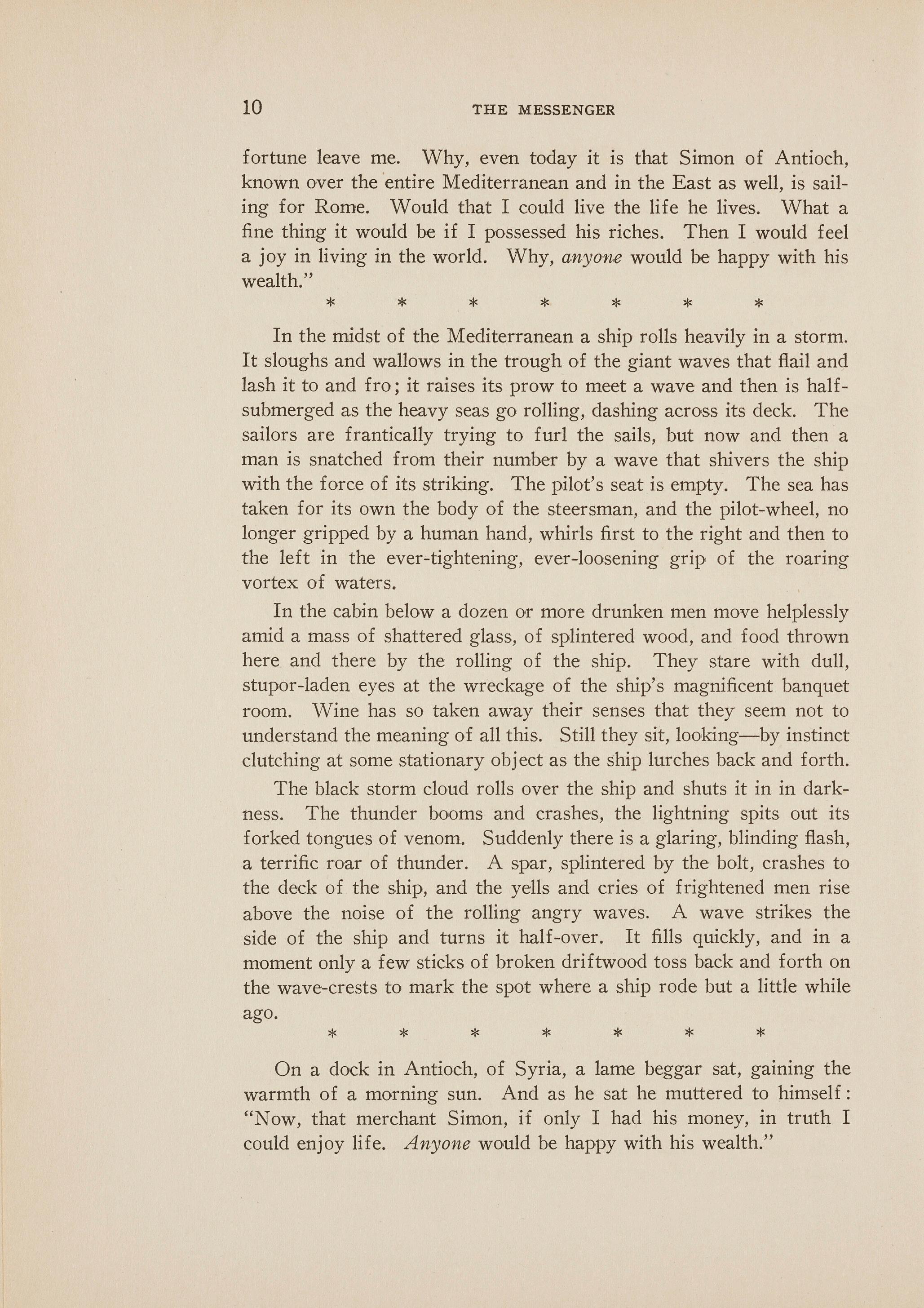 In the midst of the Mediterranean a ship rolls heavily in a storm . It sloughs and wallows in the trough of the giant waves that flail and lash it to and fro; it raises its prow to meet a wave and then is halfsubmerged as the heavy seas go rolling, dashing across its deck. The sailors are frantically trying to furl the sails, but now and then a man is snatched from their number by a wave that shivers the ship with the force of its striking. The pilot's seat is empty. The sea has taken for its own the body of the steersman, and the pilot-wheel, no longer gripped by a human hand, whirls first to the right and then to the left in the ever-tightening, ever-loosening grip of the roaring vortex of waters.