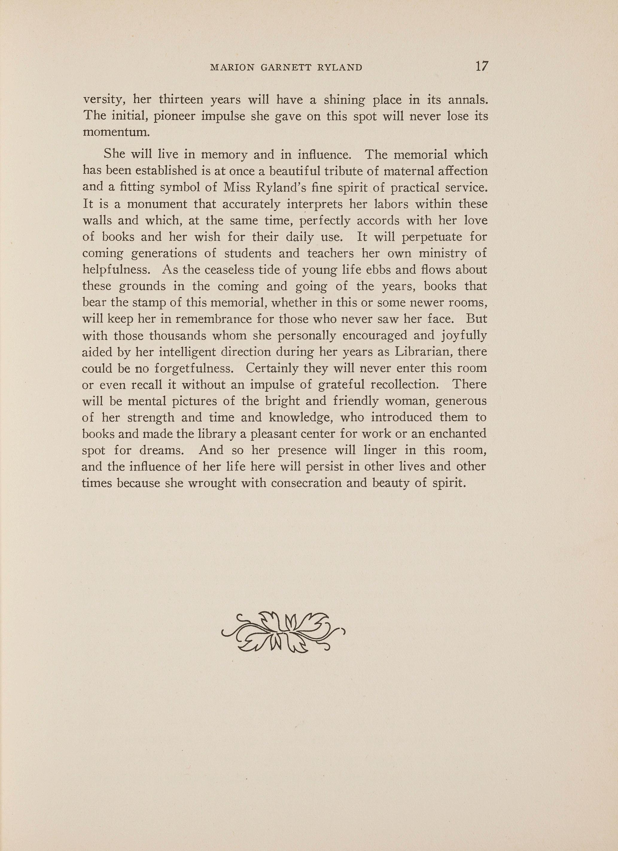 She will live in memory and in influence. The memorial which has been established is at once a beautiful tribute of maternal affection and a fitting symbol of Miss Ryland's fine spirit of practical service. It is a monument that accurately interprets her labors within these walls and which, at the same time, perfectly accords with her love of books and her wish for their daily use. It will perpetuate for coming generations of students and teachers her own ministry of helpfulness. As the ceaseless tide of young life ebbs and flows about these grounds in the coming and going of the years, books that bear the stamp of this memorial, whether in this or some newer rooms, will keep her in remembrance for those who never saw her face. But with those thousands whom she personally encouraged and joyfully aided by her intelligent direction during her years as Librarian, there could be no forgetfulness. Certainly they will never enter this room or even recall it without an impulse of grateful recollection. There will be mental pictures of the bright and friendly woman, generous of her strength and time and knowledge, who introduced them to books and made the library a pleasant center for work or an enchanted spot for dreams. And so her presence will linger in this room, and the influence of her life here will persist in other lives and other times because she wrought with consecration and beauty of spirit.