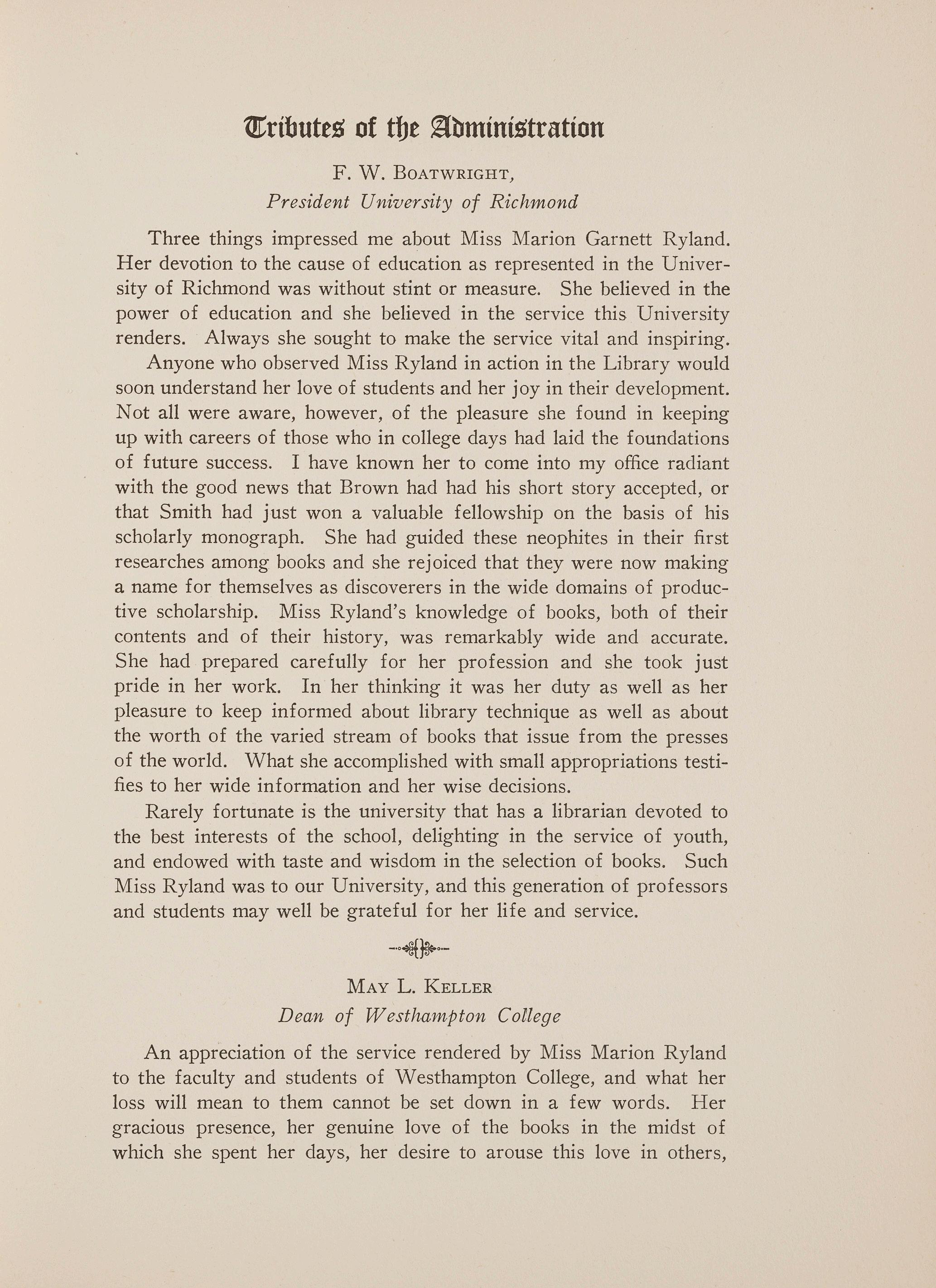 Three things impressed me about Miss Marion Garnett Ryland. Her devotion to the cause of education as represented in the University of Richmond was without stint or measure. She believed in the power of education and she believed in the service this University renders. Always she sought to make the service vital and inspiring. Anyone who observed Miss Ryland in action in the Library would soon understand her love of students and her joy in their development. Not all were aware, however, of the pleasure she found in keeping up with careers of those who in college days had laid the foundations of future success. I have known her to come into my office radiant with the good news that Brown had had his short story accepted, or that Smith had just won a valuable fellowship on the basis of his scholarly monograph. She had guided these neophites in their first researches among books and she rejoiced that they were now making a name for themselves as discoverers in the wide domains of productive scholarship. Miss Ryland's knowledge of books, both of their contents and of their history, was remarkably wide and accurate. She had prepared carefully for her profession and she took just pride in her work. In her thinking it was her duty as well as her pleasure to keep informed about library technique as well as about the worth of the varied stream of books that issue from the presses of the world. What she accomplished with small appropriations testifies to her wide information and her wise decisions.