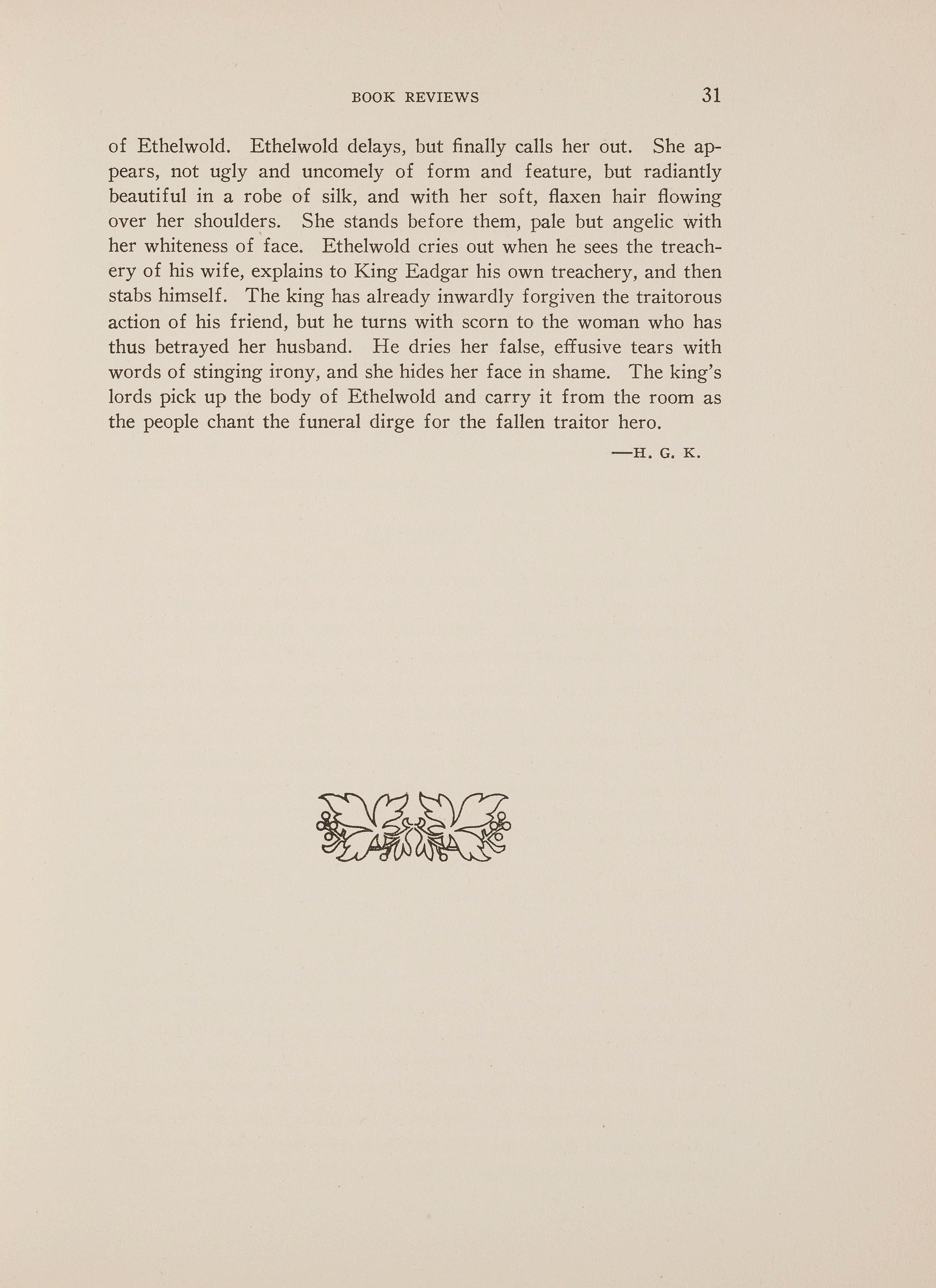 The story: King Eadgar is betrothed to a fair lady of genteel birth who lives in the neighboring shire of Devon. The season is winter and the king is so tied up with the affairs of the kingdom that he must needs send his favorite henchman, Ethel wold, to fetch the damsel, Elfrida by name, to court. The lady herself does not know of the betrothal which is to be settled by her father, Ordgar. Ethelwold goes to Devon, meets Elfrida in the forest when he is lost, falls in love with her at once, and marries her, sending back word to the king that she was but an ugly country wench, unsuited for the position of Queen of England. The scene then shifts to the home of Ordgar in the following spring. Elfrida has by now settled down to the dreary reality of keeping house for her husband and for her father as well. Romance ( more the pity!) has quite faded from the scene. Maccas, Ethelwold's body servant, enters and announces the coming of the king. Ethelwold quickly tells Elfrida of the way he has deceived her into marrying him and asks her to go to her room, stain her face and otherwise disguise her beauty that the king may not suspect. She goes. The king comes in and greets Ethelwold with the accustomed brotherly affection, which Ethelwold finds hard to render mutual. The king then asked to see the wife