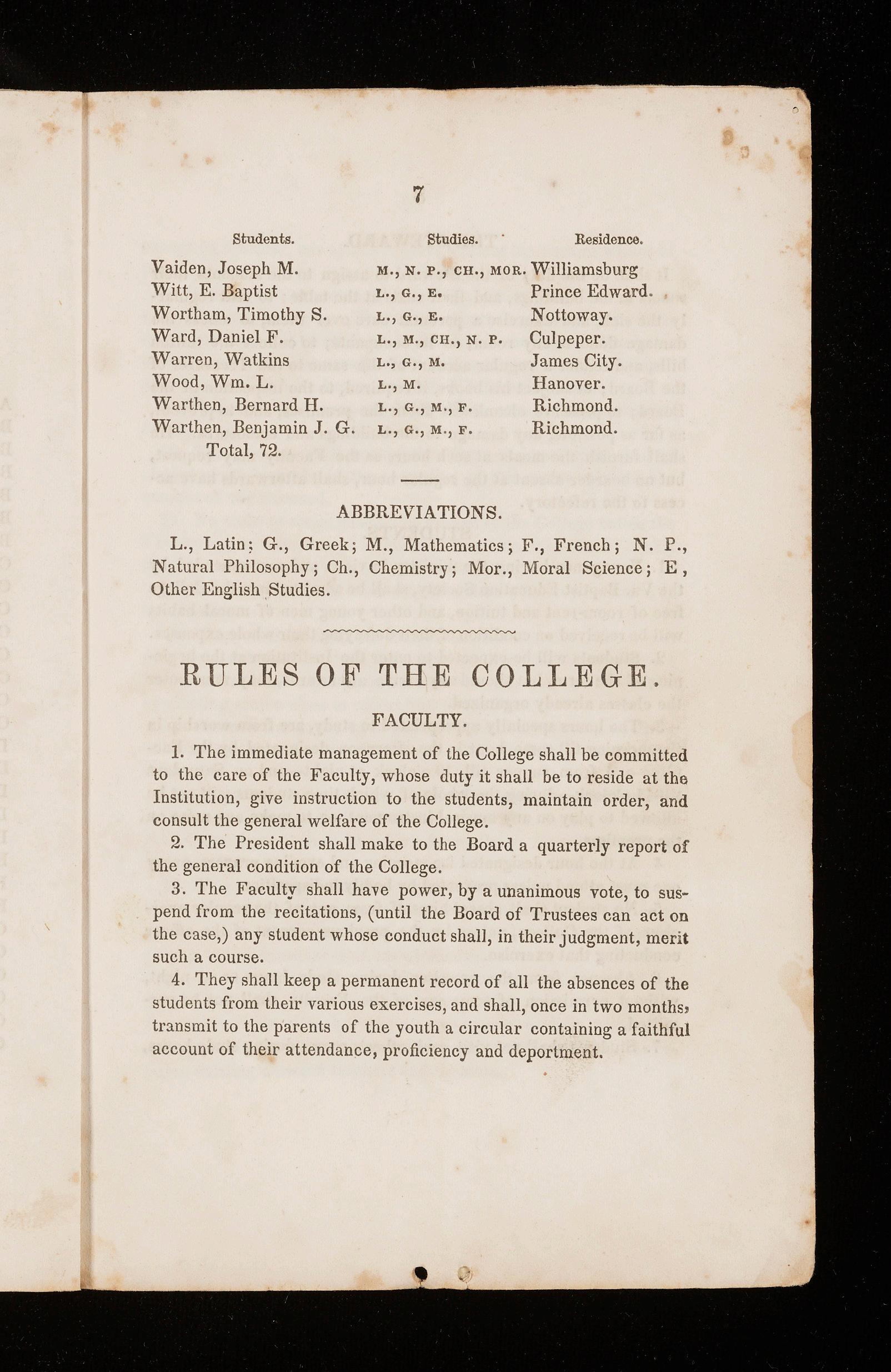 1. The immediate management of the College shall be committed to the care of the Faculty, whose duty it shall be to reside at the Institution, give instruction to the students, maintain order, and consult the general welfare of the College.