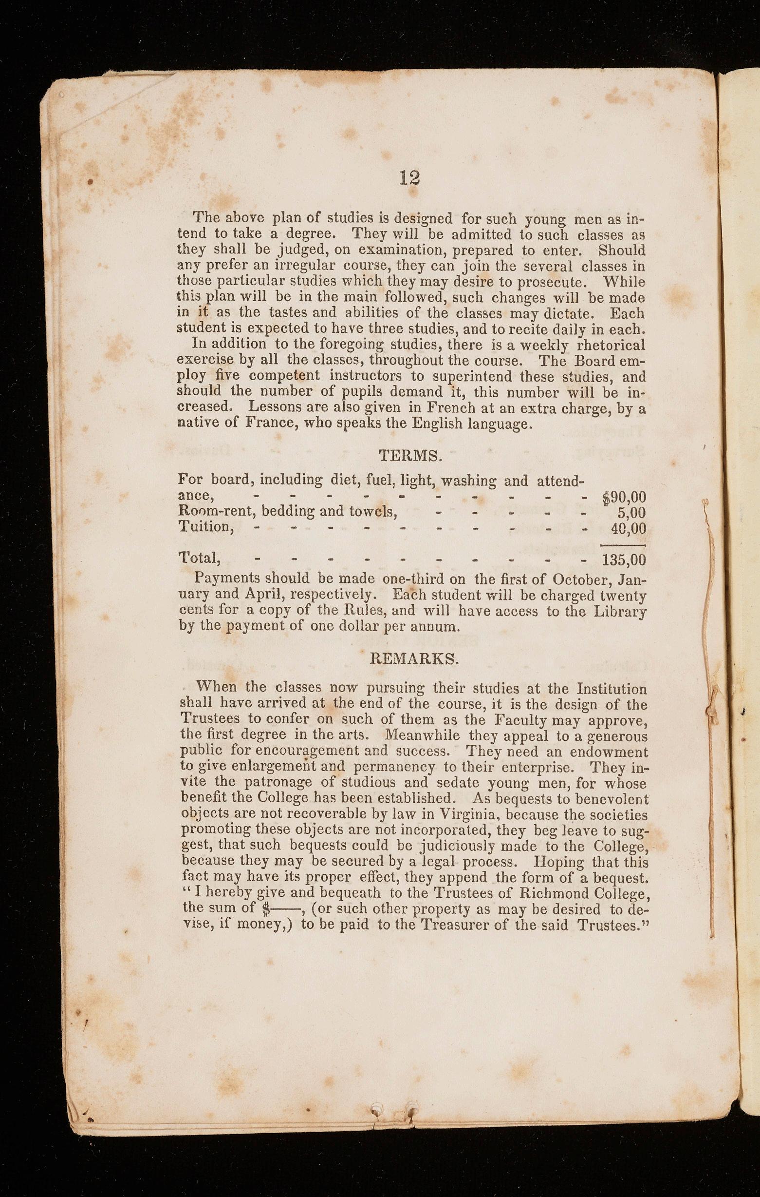 When the classes now pursuing their studies at the Institution shall have arrived at the end of the course, it is the design of the Trustees to confer on such of them as the Faculty may approve, the first degree in the arts. Meanwhile they appeal to a generous public for encouragement and success. They need an endowment to give enlargement and p ermanency to their enterprise. They invite the patronage of studious and sedate young men, for whose benefit the College has been establish e d. As bequ ests to benevolent objects are not recoverable by law in Virginia, because the societies promoting these objects are not incorporated, they beg leave to suggest, that such bequests could be judiciously made to the College, because they may be secured by a legal process. Hoping that this fact may have its proper effect, they append the form of a bequest.