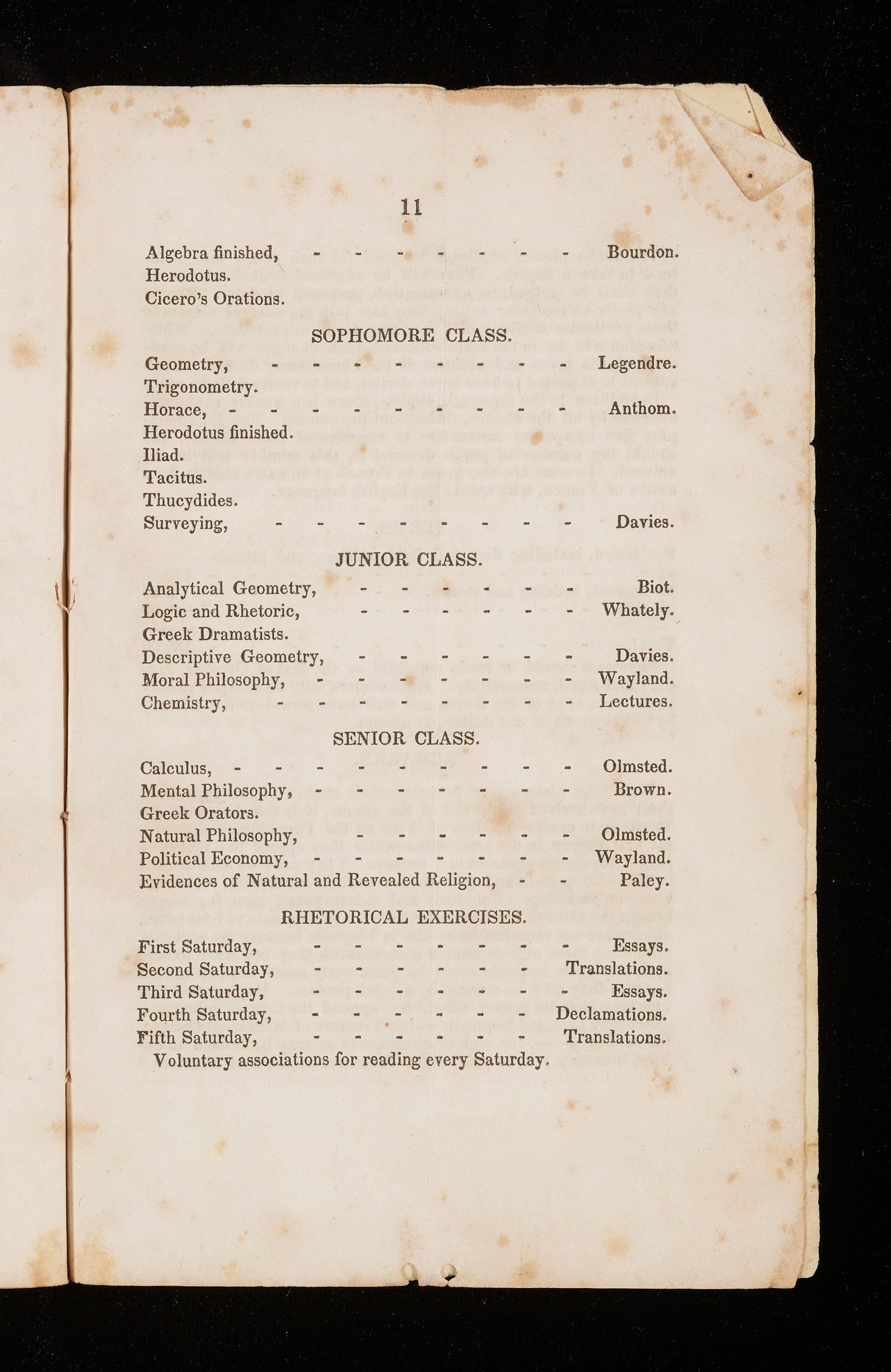 Davies. Wayland. Lectures. Olmsted. Brown. Olmsted. Wayland. Paley. Essays. Translations. Essays. Declamations. Translations.
