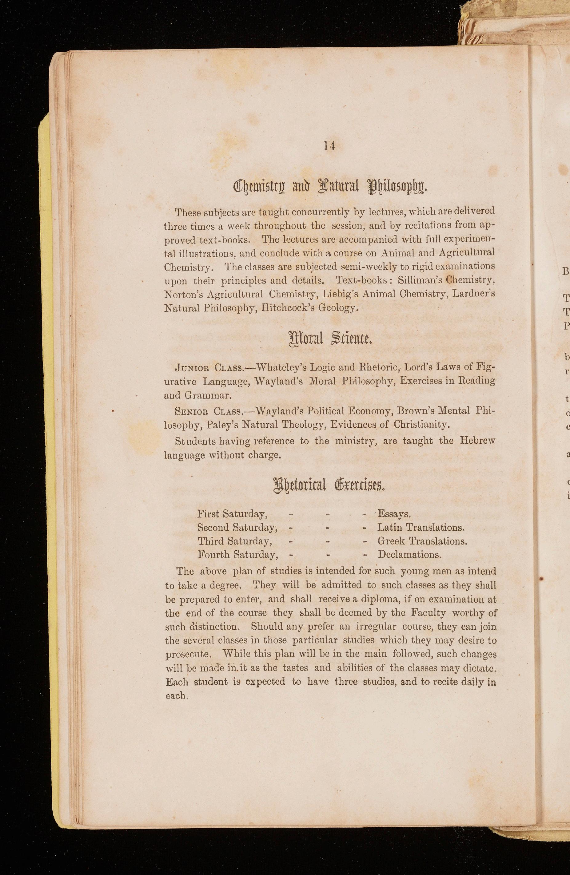 'l'hese subjects are taught concurrently by lectures, which are delivereJ three times a week throughout the session, and by recitations from approved text-books. The lectures are accomp,mied with full experimental illustrations, and conclude with :i course on Animal and Agricultural Chemistry. The ch1sses are subjected semi-we ekly to rigid examinations upon their principles and details. Text-books: Silliman 's Chemistry, Norton's Agricultural Chemist1:y, Liebig ' s Animal Chemistry, Lardner's Natural Philosophy, Hitchcock's Geology.
