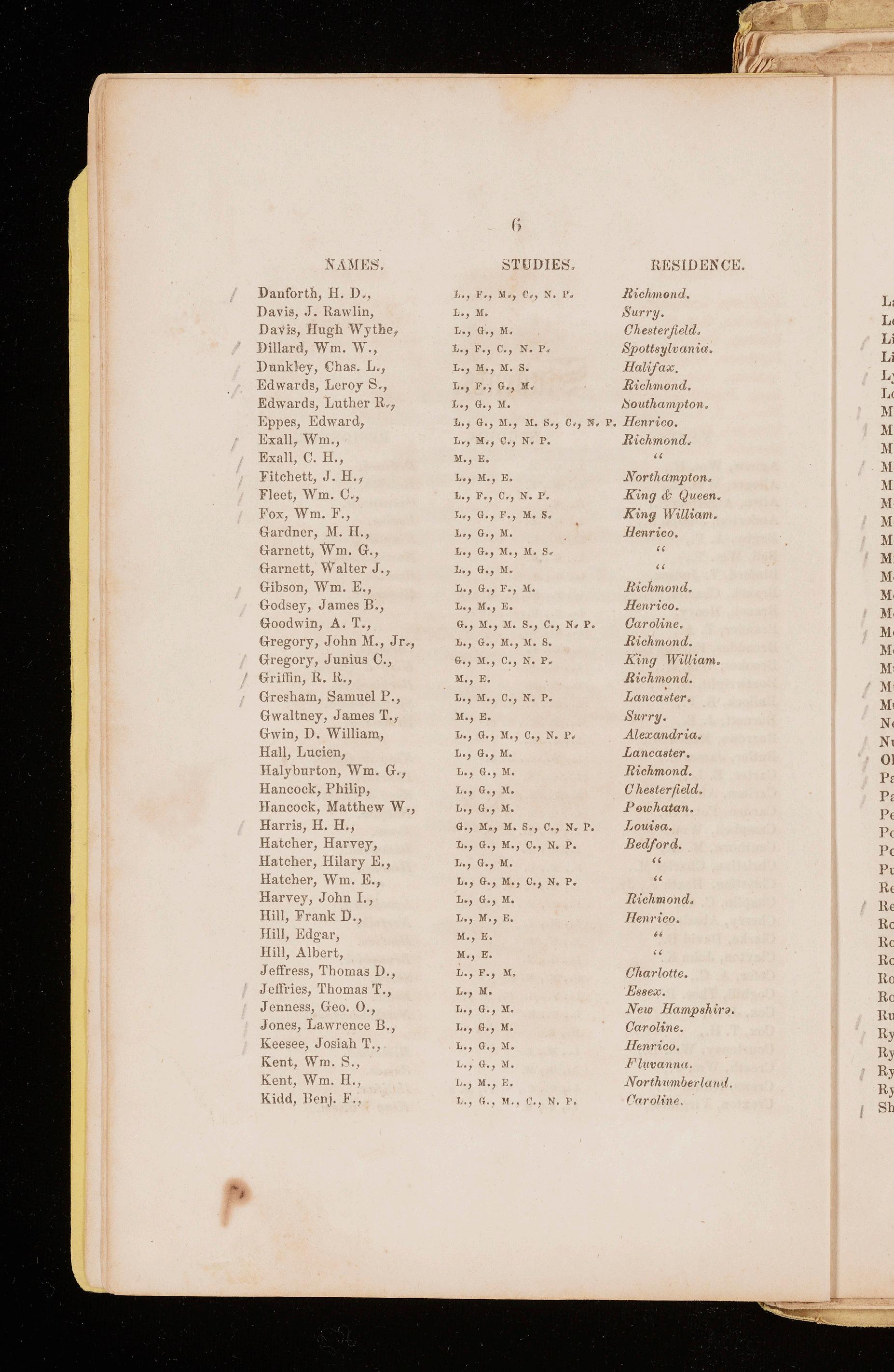 Danforth, II. D., Davis, J. Rawlin, Davis, Hugh ·wythe, Dillard, Wm. W., Dunkley, Chas. L., Edwards, Leroy S., Edwards, Luther R., Eppes, Edward, Exall, Wm., Exall, C. II., Fitchett, J. H., Fleet, \Ym. C., l?ox, Wm. P., Gardner, M. R., Garnett, Wm. G., Garnett, Walter J., Gibson, Wm. E., Godsey, James B., Goodwin, A. T., Gregory, John 1if., Jr., Gregory, Junius C., Griffin, R. lt., Gresham, Samuel P., Gwaltney, James T., Gwin, D. William, Hall, Lucien, llalyburton, Wm. G., Hancock, Philip, Hancock, Matthew W., Harris, II. H., Hatcher, Harvey, Hatcher, Hilary E., Hatcher, Wm. E., Harvey, John I., Hill, Frank D., Hill, Edgar, Hill, Albert, Jeffress, Thomas D., J etfries, Thomas 'l'., J enncss, Geo. 0., Jones, Lawrence B., Keesee, Josiah 'l'., Kent, Wm. S., Kent, Wm. H., Kidd, Benj .F