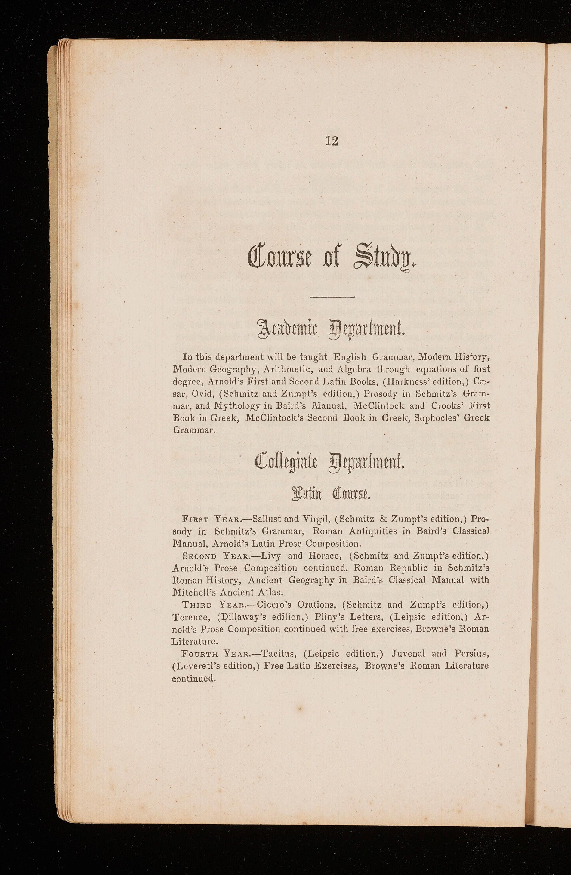 In this department will be taught English Grammar, Modern History, Modern Geography, Arithmetic, and Algebra through equations of first degree, Arnolrl's First and Second Latin Books, (Harkness' edition,) Cresar, Ovid, (Schmitz and Zumpt's edition,) Prosody in Schmitz's Grammar, and Mythology in Baird's Manual, McClintock and Crooks' First Book in Greek, McClintock's Second Book in Greek, Sophocles' Greek Grammar.