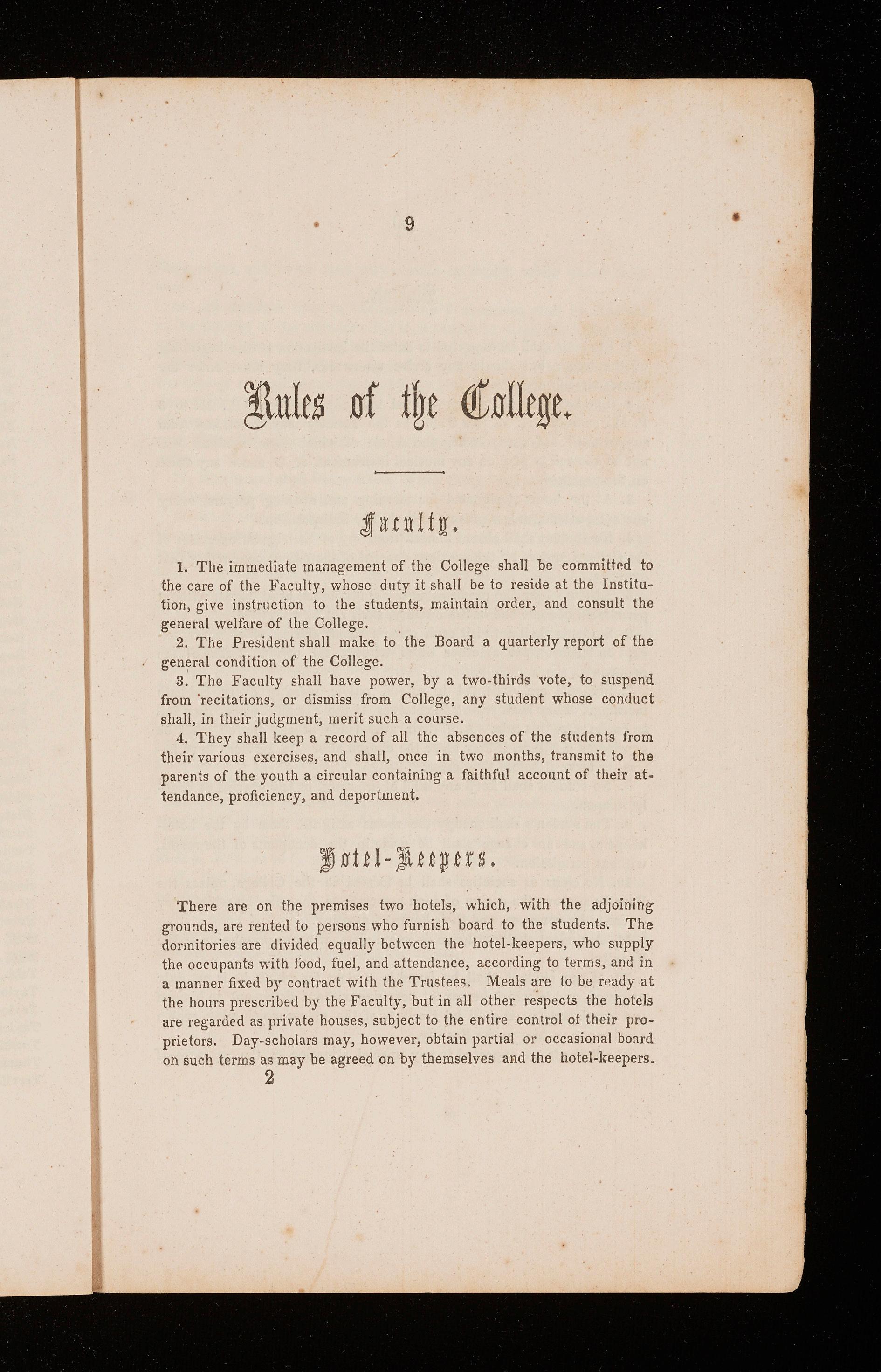 1. The immediate management of the College shall be committP.d to the care of the Faculty, whose duty it shall be to reside at the Institution, give instruction to the students, maintain order, and consult the general welfare of the College.