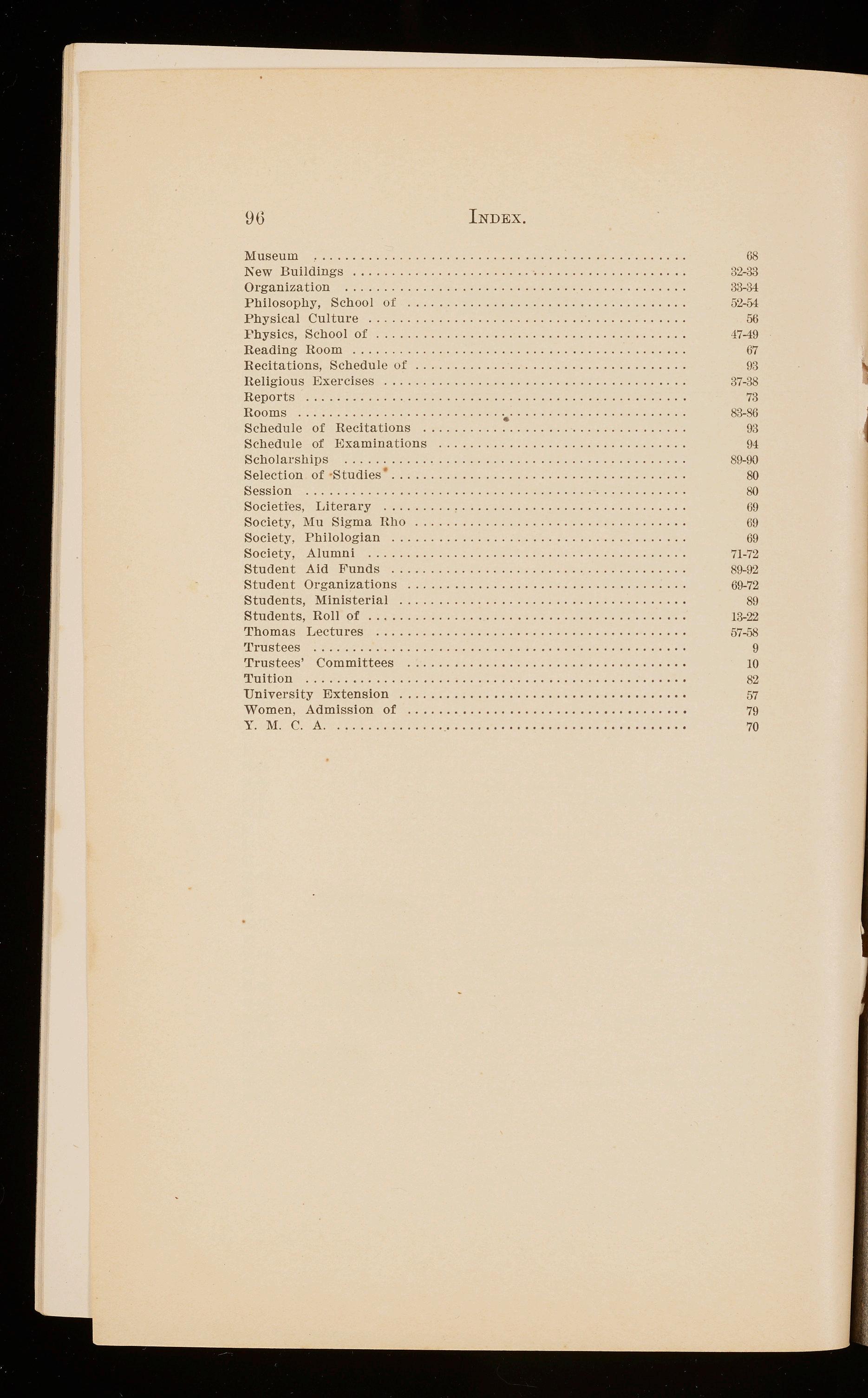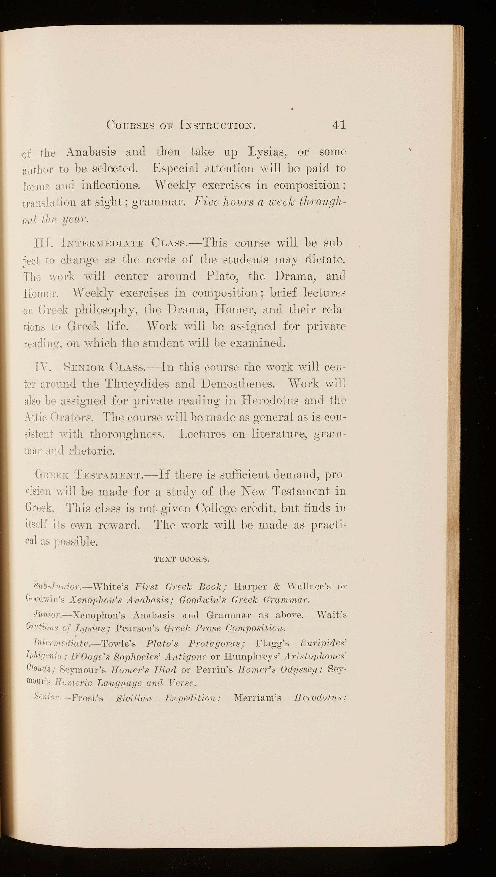 SATURDAY. Phys., Sen. Phil .. Int . Phil., Sen. Greek, Int English, Int. Liter at ure . . . . Math , Int. Latin, Sen. Latin , Int . . . . . . NOTES . .... I. Some or the smaller classes may be moved to suit special cases . II . Four hours a week additional in each class will be assigned by the Profes so rs of Chemistry and Physics for laboratory work. III. The class in Astronomy will meet at hours to be designated by the Professor IV. Junior Law meets 4:30 to 5:30 P . M. Senior Law meets 5:30 to 7 P. M.