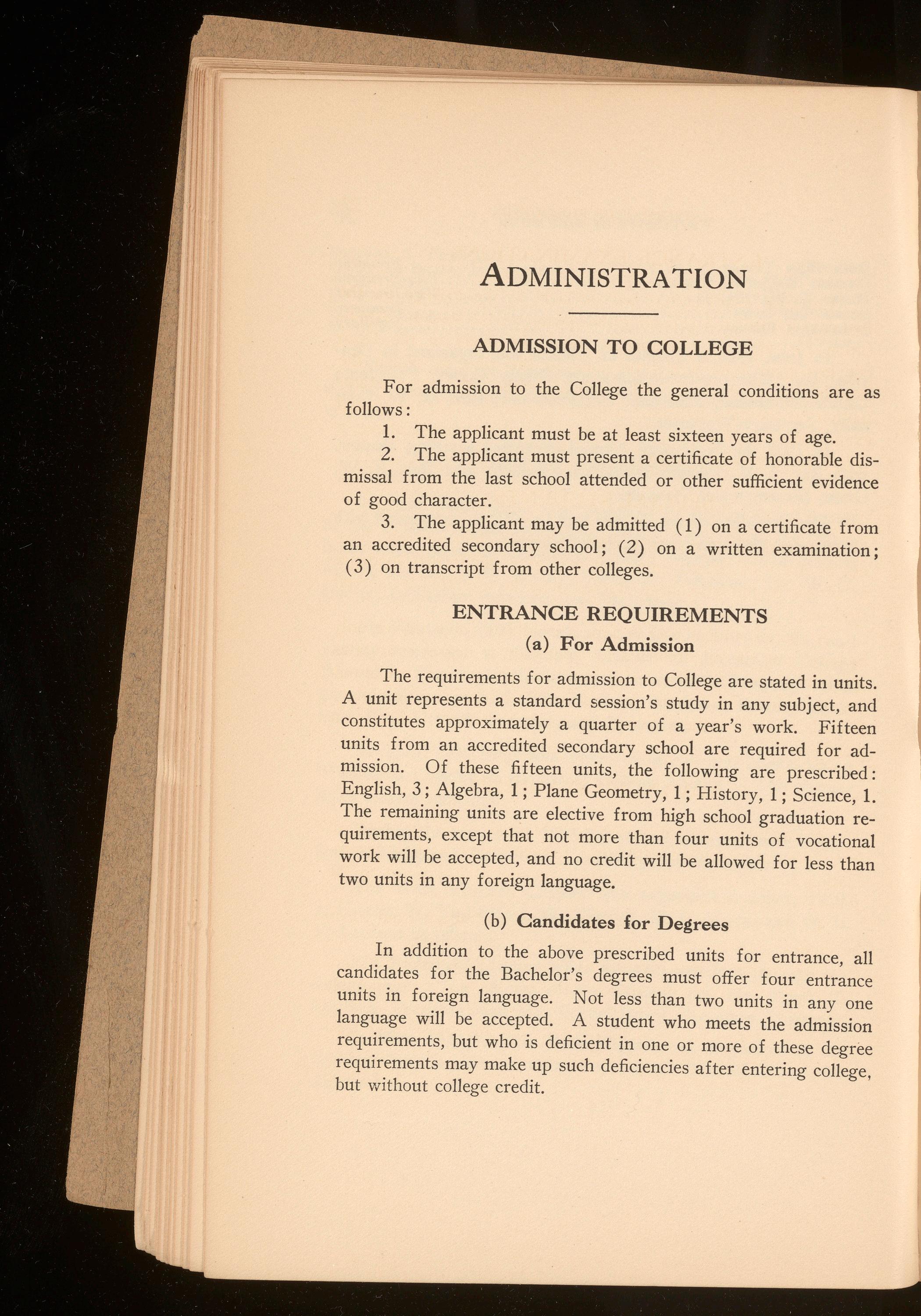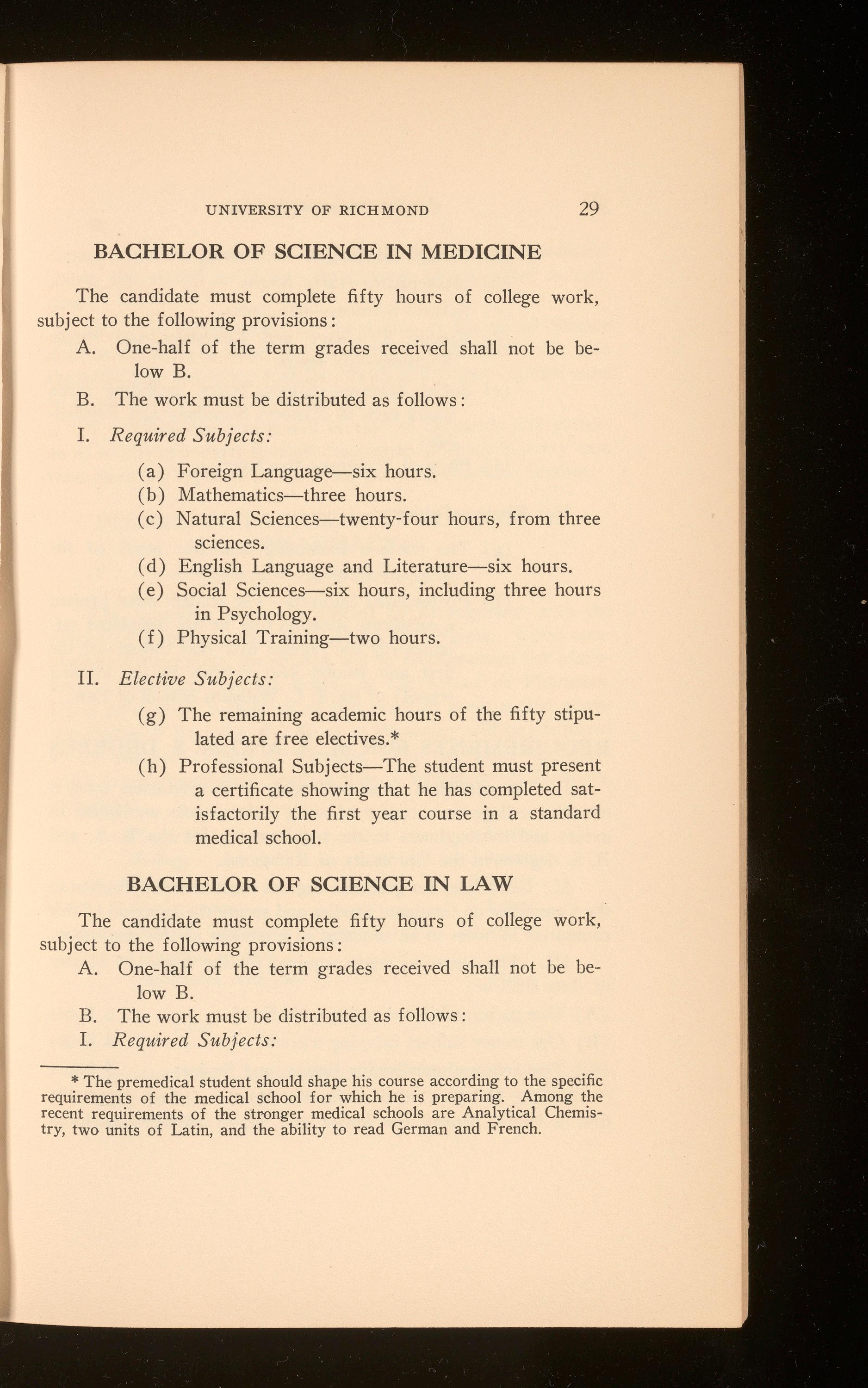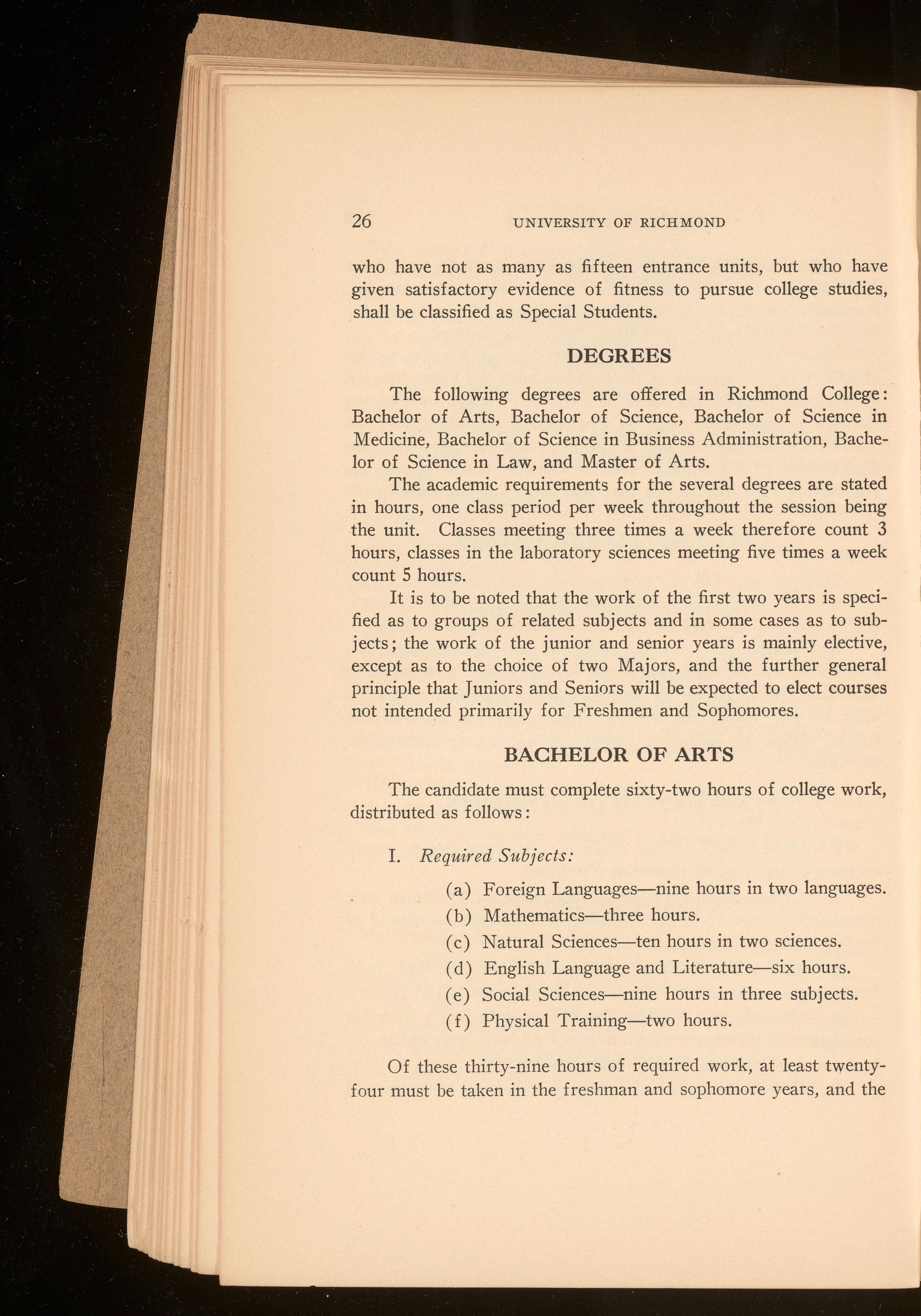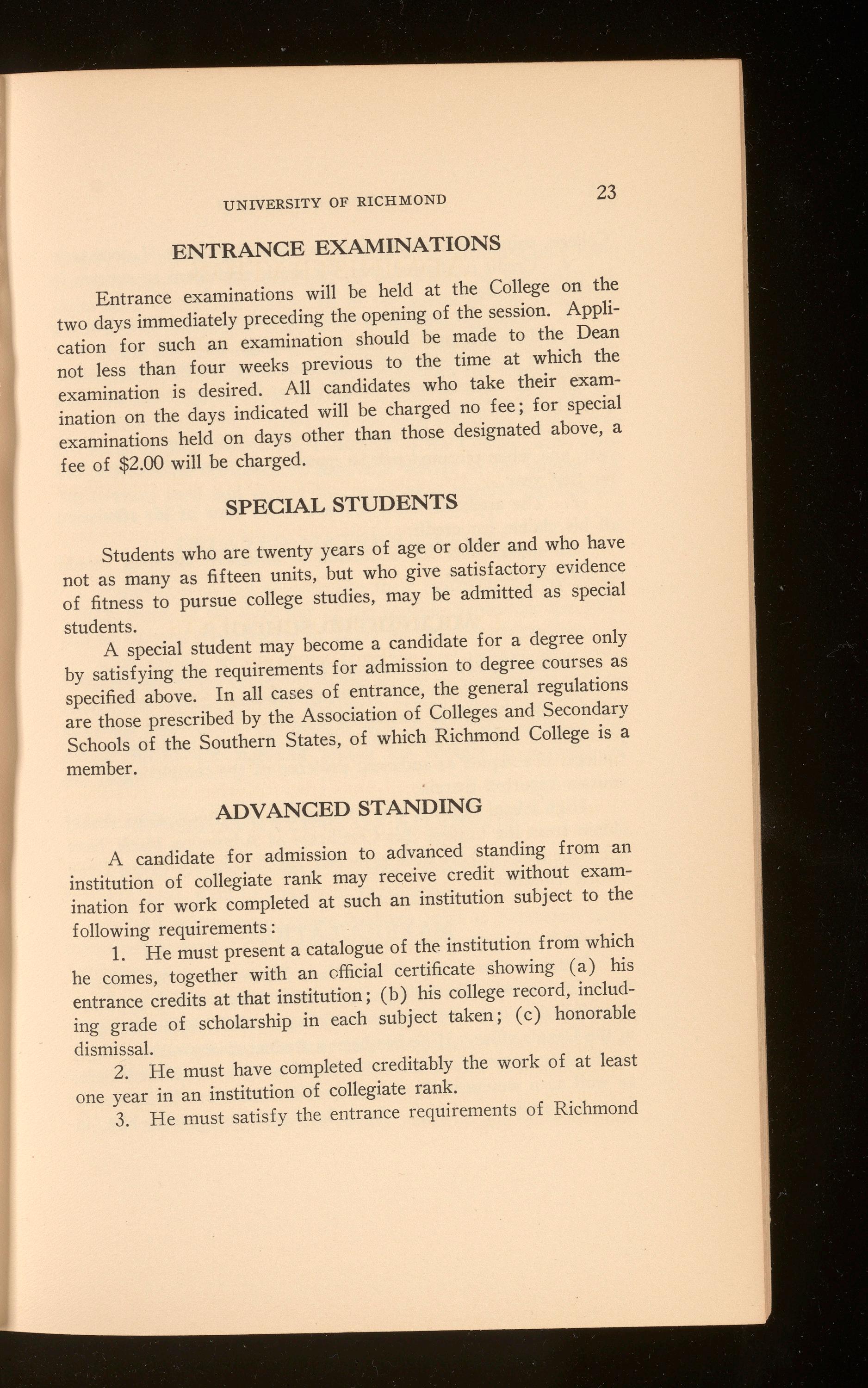 Beginning in 1924-1925 two years of college work will be required of all candidates for the law degree. Special students will be admitted to the School, not to candidacy for the degree, under special regulations. In every case the applicant for admission should communicate with James H. Barnett, Jr., Secretary of the Law School, 601 North Lombardy Street, Richmond, Virginia.