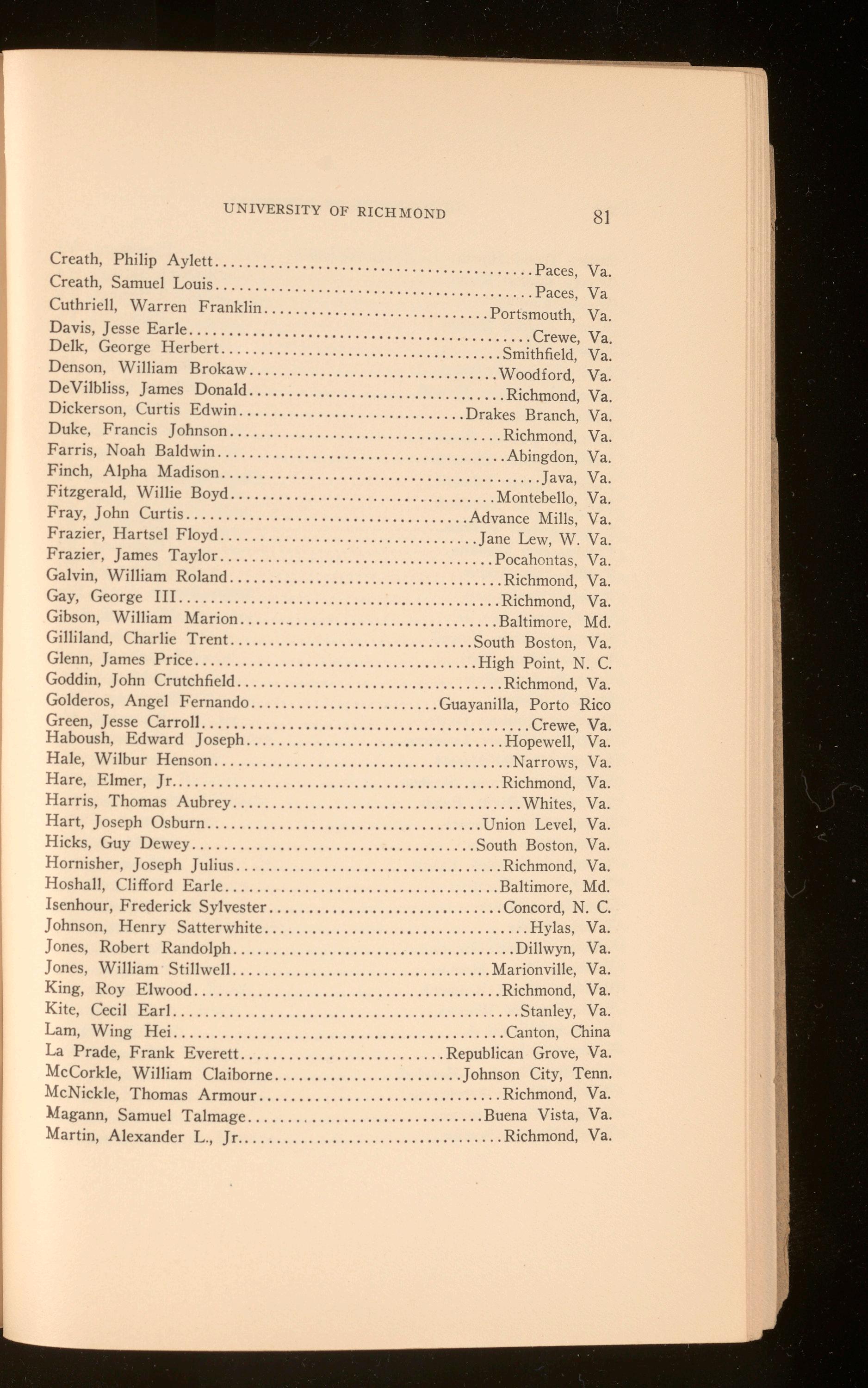 ... Richmond , Va. Jones, Leslie Leftwich .................................... Richmond, Va. King , Earle Rudolph ..................................... Richmond, Va. Lam, Dick ................................................. Norfolk, Va . Lillard, Basil Wallace ..