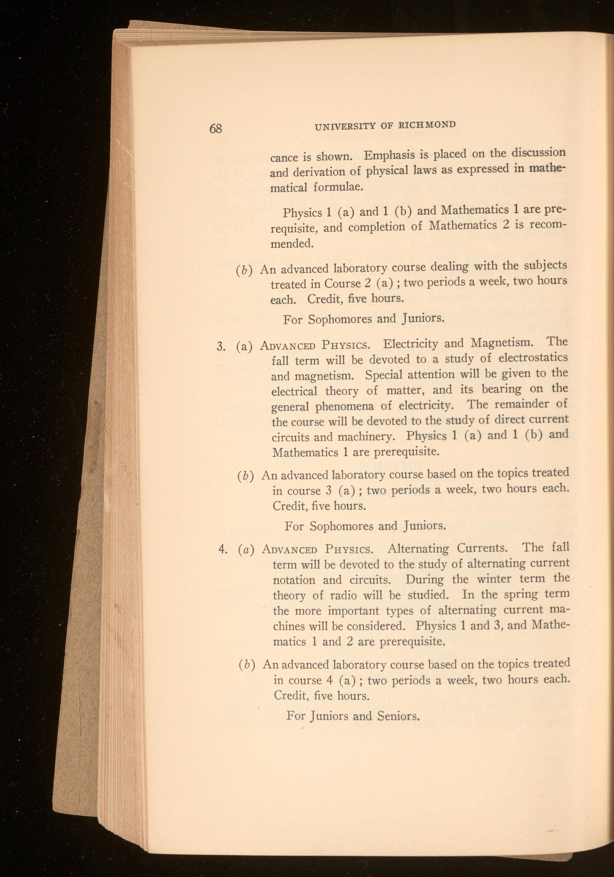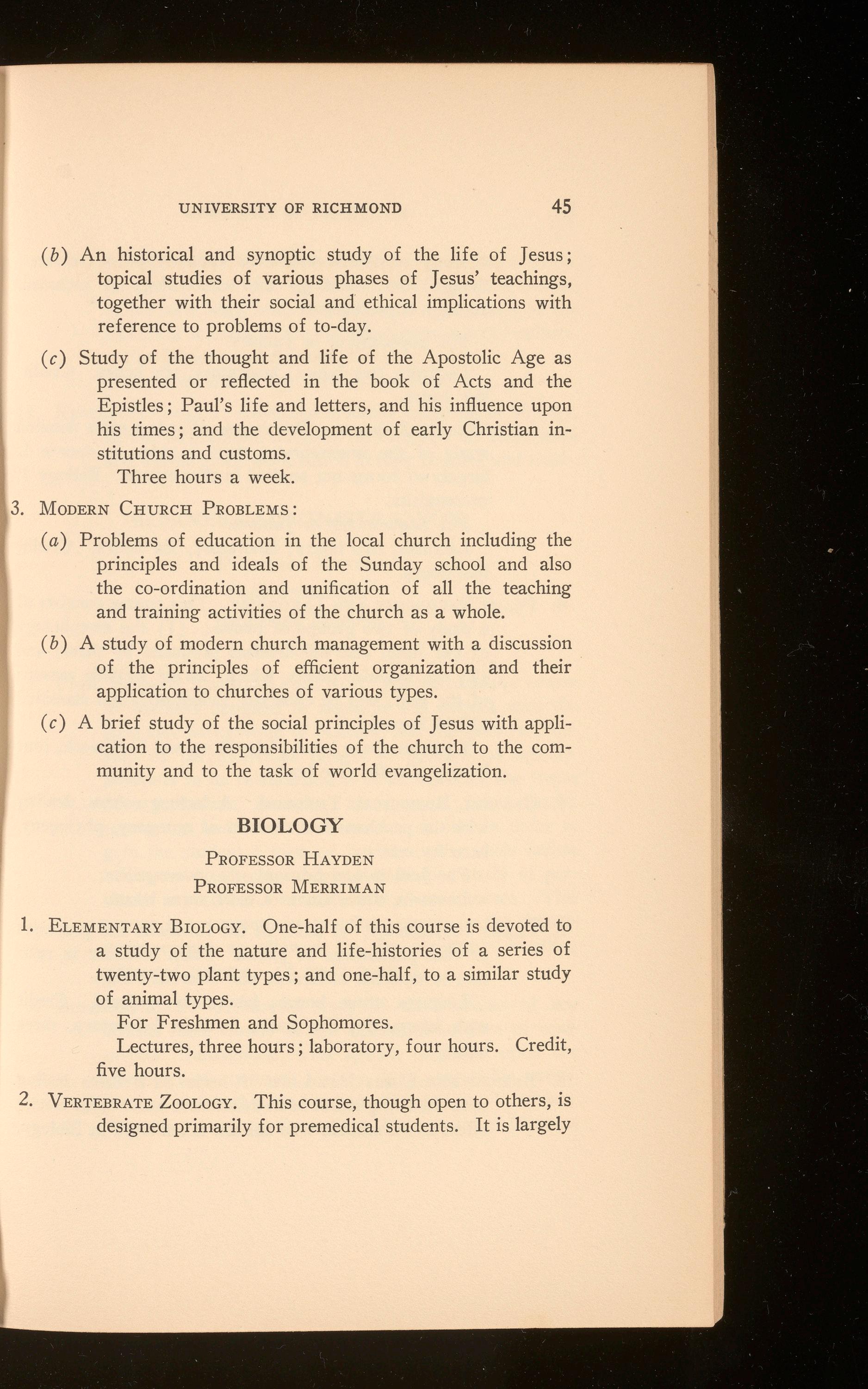 Biology I, Laboratory, Tuesday and Thursday, 11:00-1:00; 2 :00-4:00. Chemistry I, Laboratory, Tuesday and Thursday, 2 :00-4:00; Monday and Wednesday, 2 :00-4 :00. Physics I, Laboratory, Tuesday and Thursday, 9 :00-11:00, 11 :00-1:00; 2 :00-4 :00.