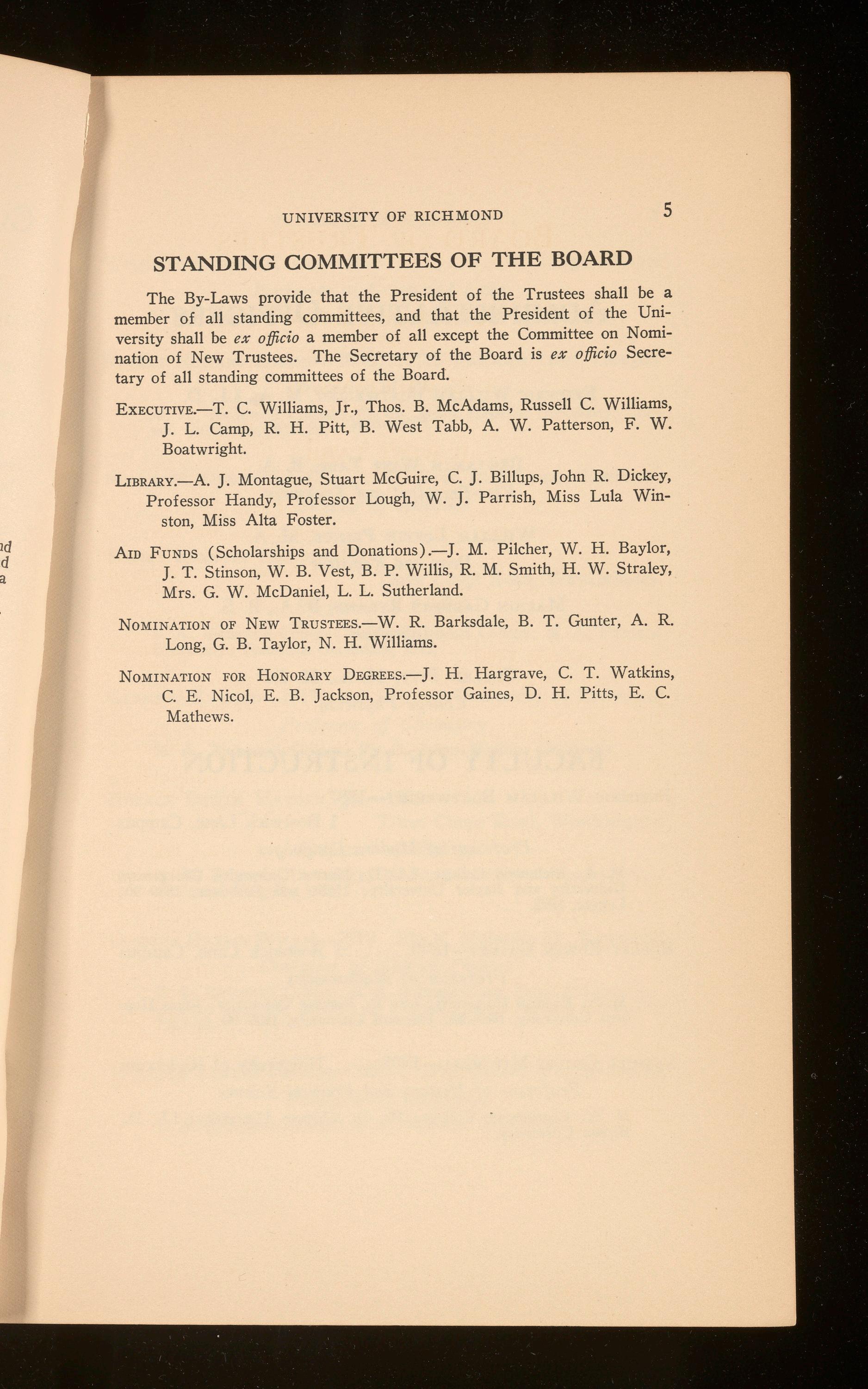 The By-Laws provide that the President of the Trustees shall be a member of all standing committees, and that the President of the University shall be ex officio a member of all except the Committee on Nomination of New Trustees. The Secretary of the Board is ex officio Secretary of all standing committees of the Board.