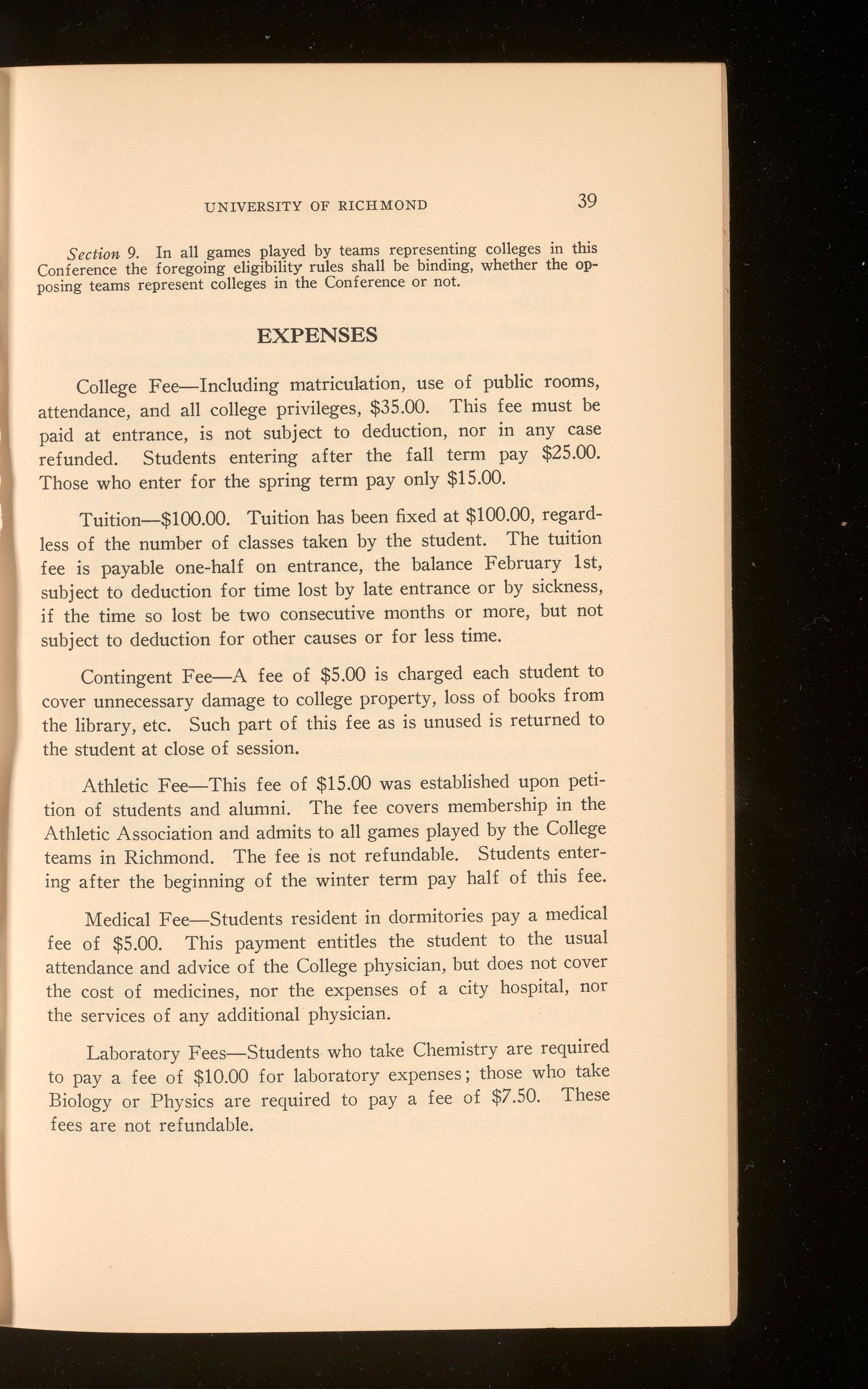The matriculation fee, the contingent fee, and one-half of the tuition fee in the Forenoon and Evening divisions are payable at entrance; the second half of the tuition fee is payable February 1st of each session; and all fees in the Summer division are payable in advance. No honors are announced until all fees are paid in full.