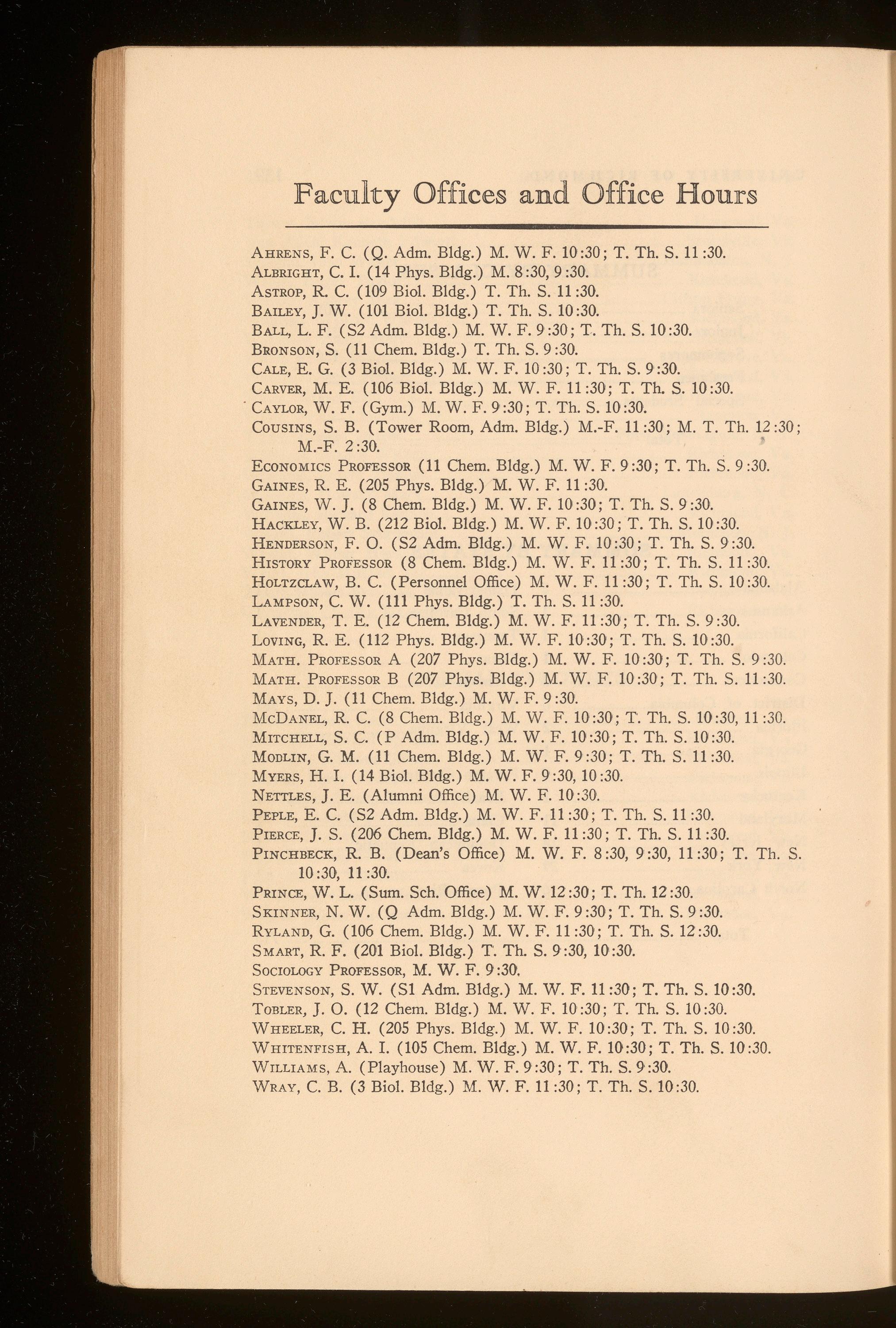 PINCHBECK,R. B. (Dean's Office) M. W. F. 8 :30, 9 :30, 11 :30; T. Th S. 10 :30, 11 :30.