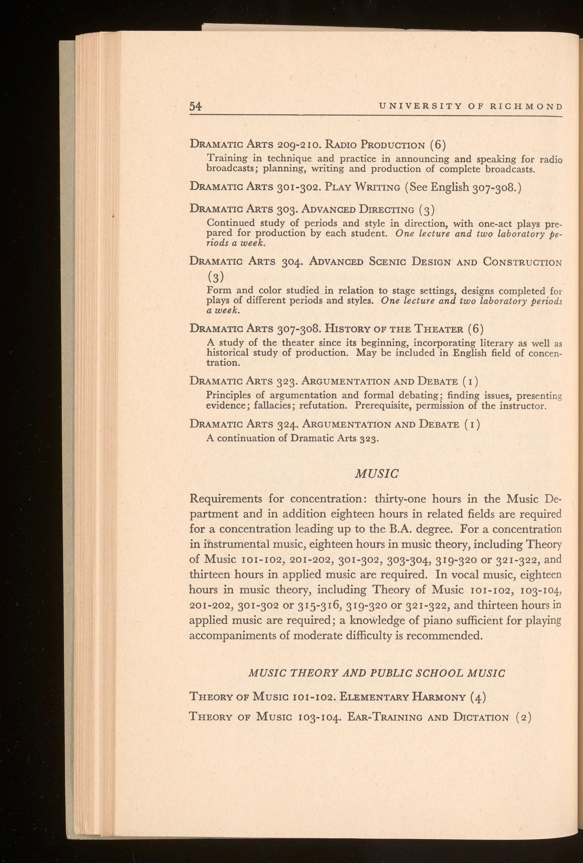 Requirements for concentration: forty-two hours, of which twenty-four hours must be in dramatic arts, exclusive of Dramatic Arts 101-102, and including Dramatic Arts 207-208, and either Dramatic Arts 307-308 or English 311-3 r 2, and eighteen hours in closely related fields approved by the department.