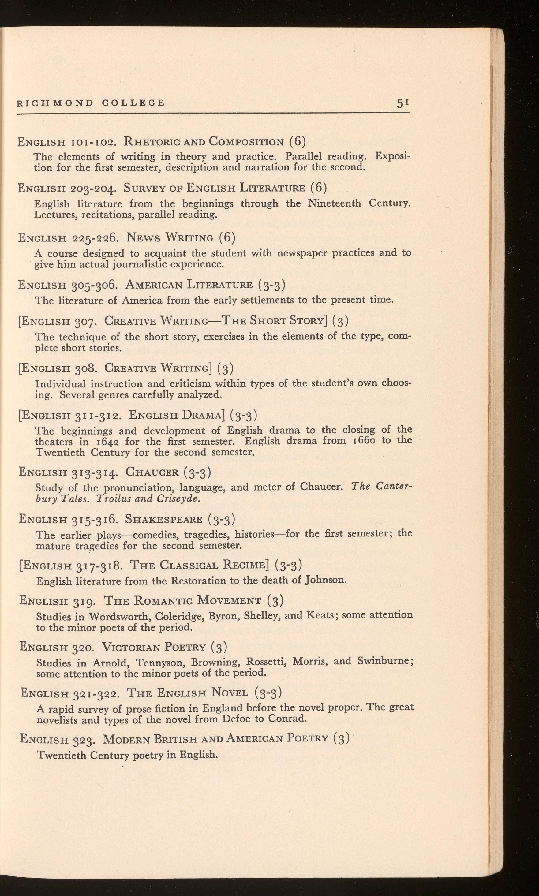 The following courses are offered in the School of Business Administration and may be elected by non-business students in Richmond College with the necessary prerequisites. Students who expect to become candidates for the degree of B.S. in Business Administration should apply, prior to the end of their second year in Richmond College, directly to the School of Business Administration for admission.