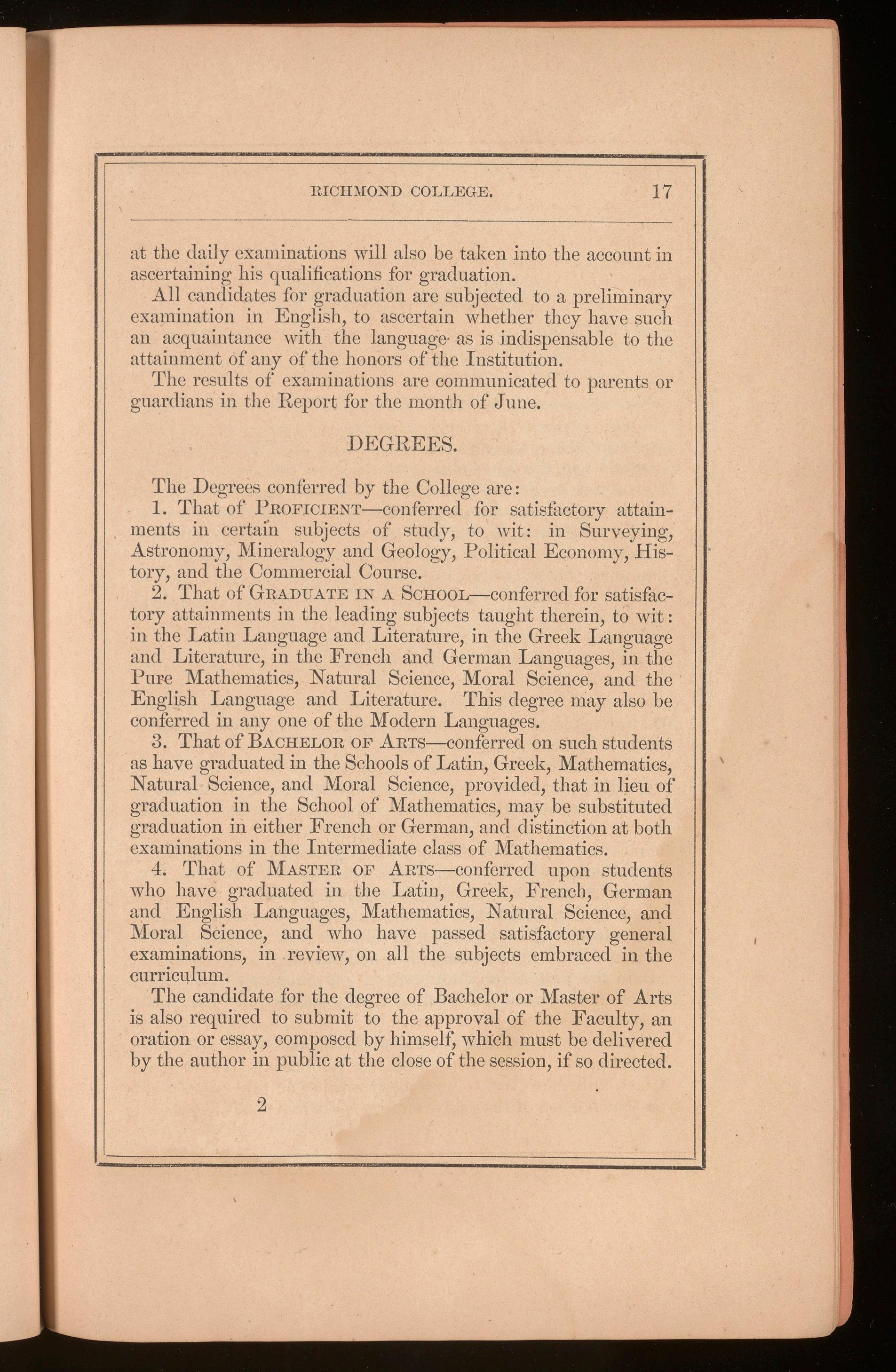 The candidate for the degree of Bachelor or Master of Arts is also required to submit to the approval of the Faculty, an oration or essay, composed by himself, which must be delivered by the author in public at the close of the session, if so directed.