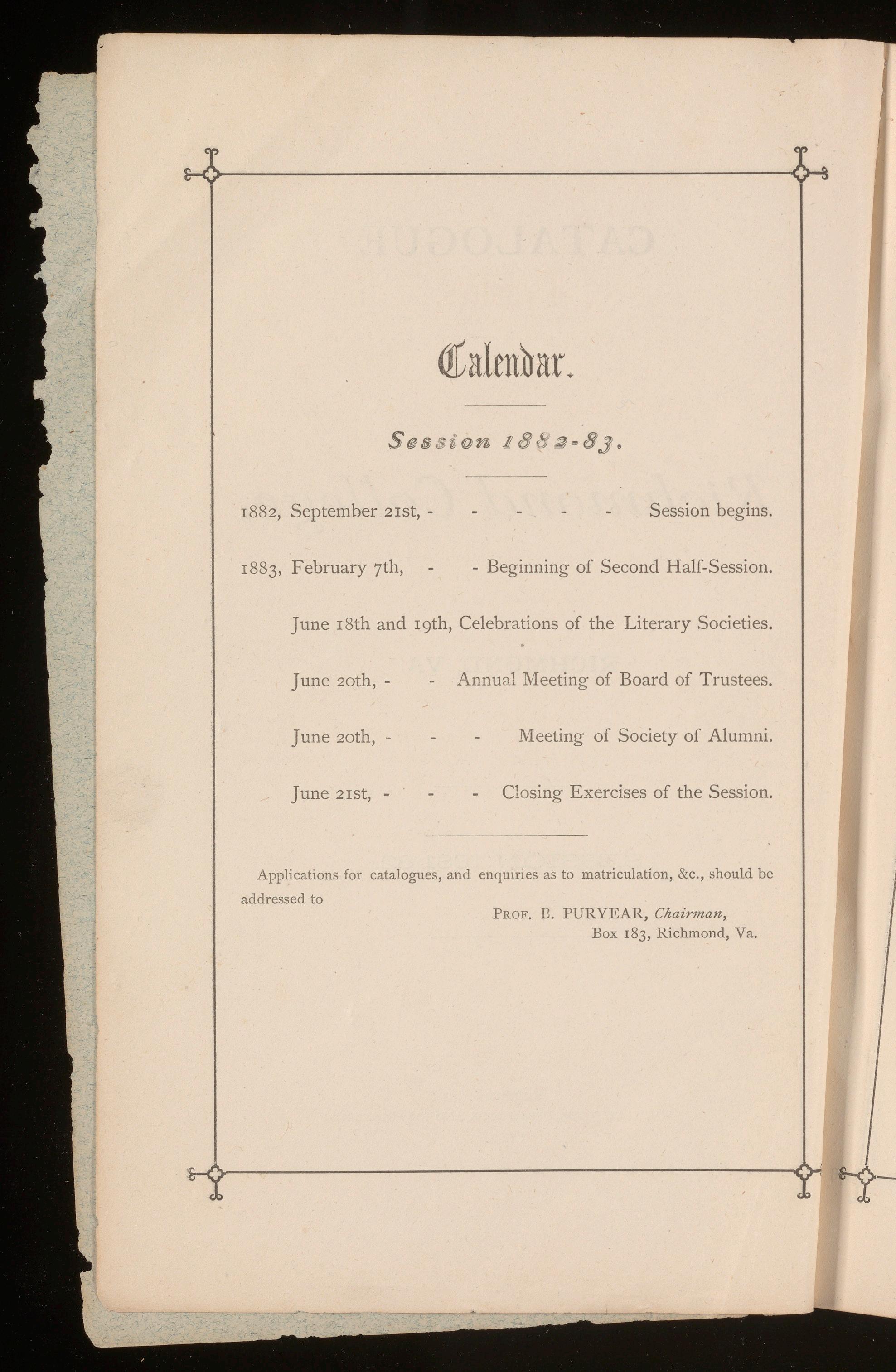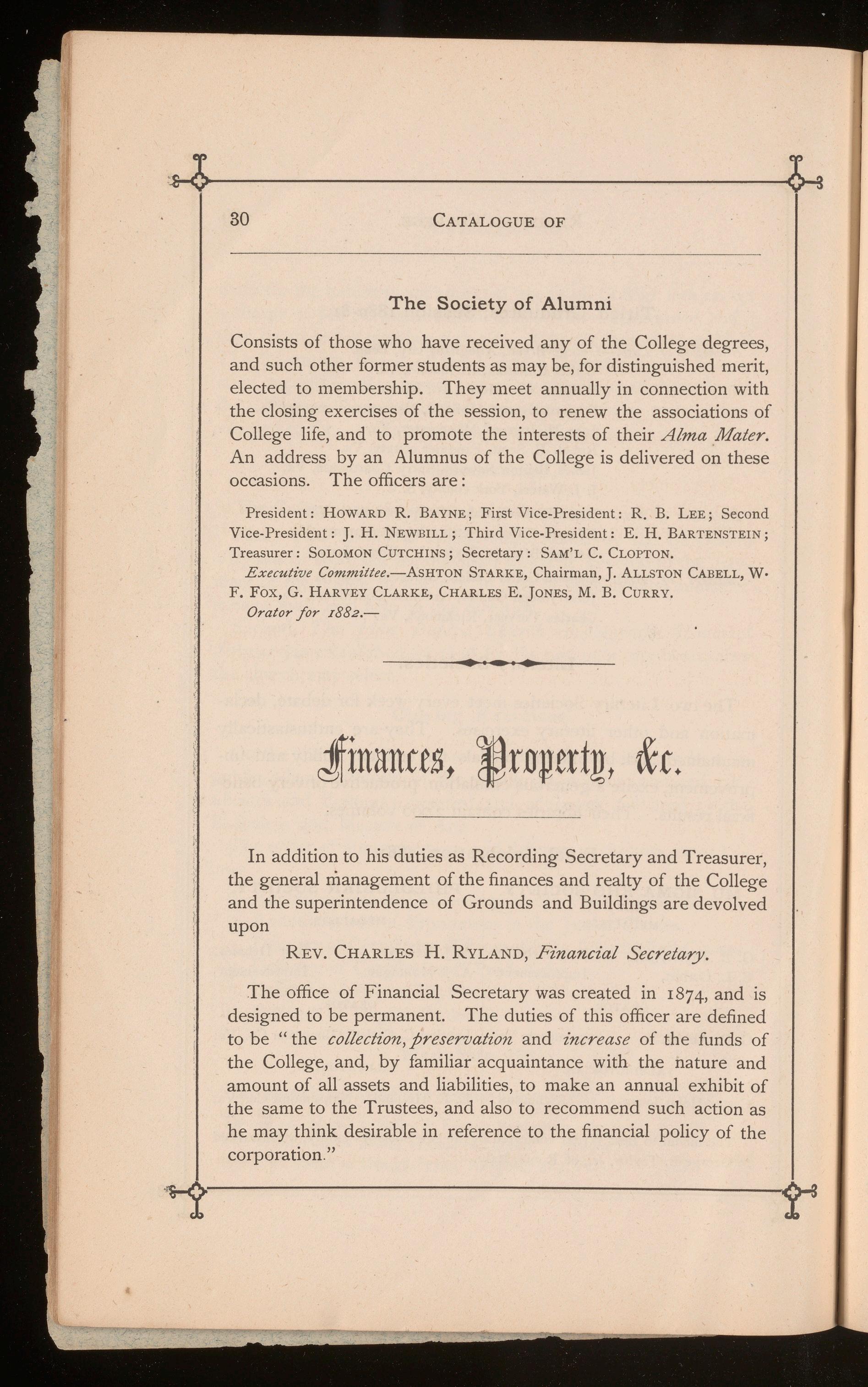 President: HOWARD R. BAYNE; First Vice-President: R. B. LEE; Second Vice-President: J. H. NEWBILL; Third Vice-President: E. H. BARTENSTEIN; Treasurer: SOLOMONCUTCHINS; Secretary: SAM'L C. CLOPTON. Executive Committee.-ASHTON STARKE, Chairman, J. ALLSTON CABELL,W• F. Fox, G. HARVEY CLARKE, CHARLES E. JONES, M. B. CURRY. Orator for I882.-