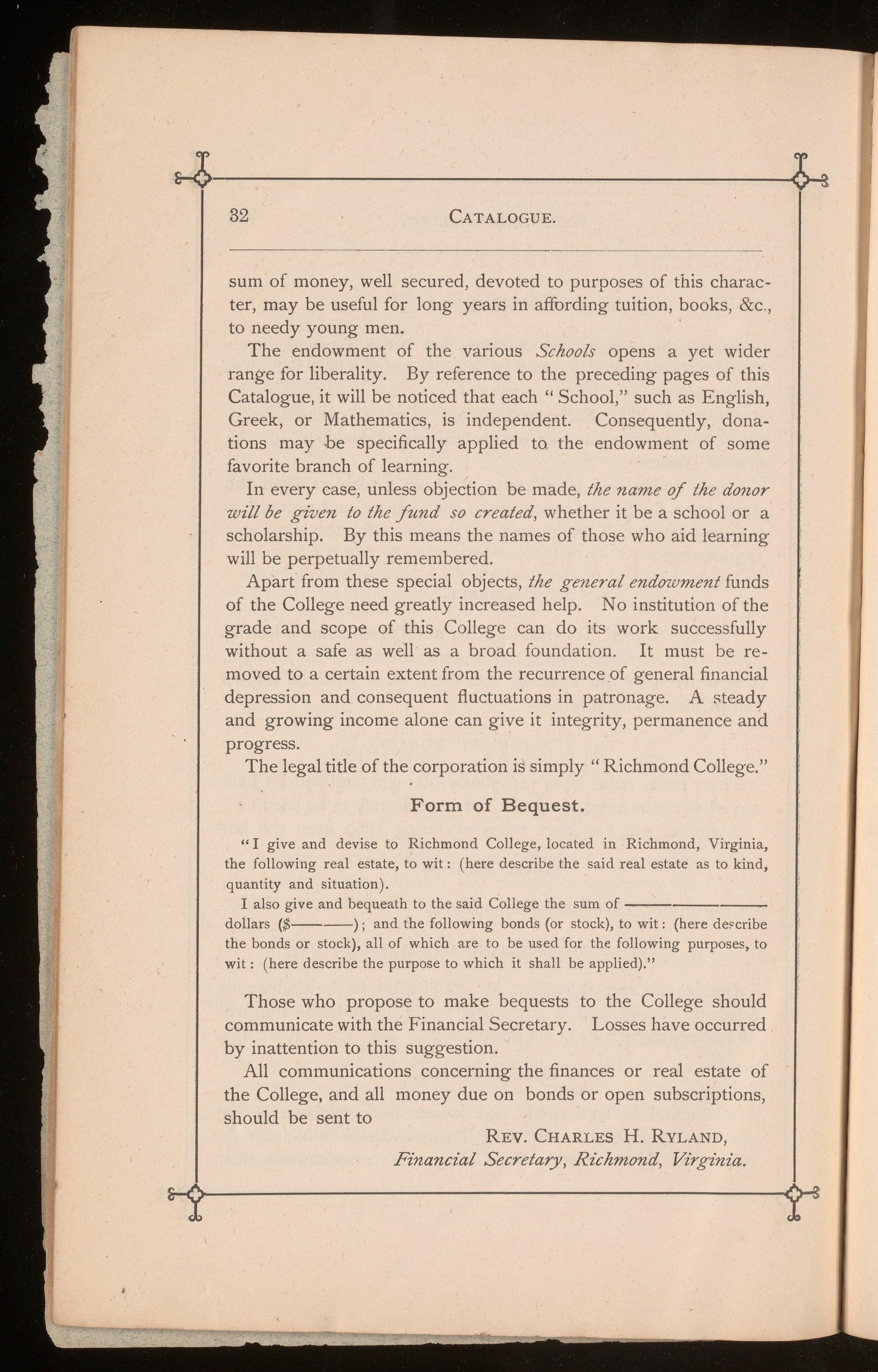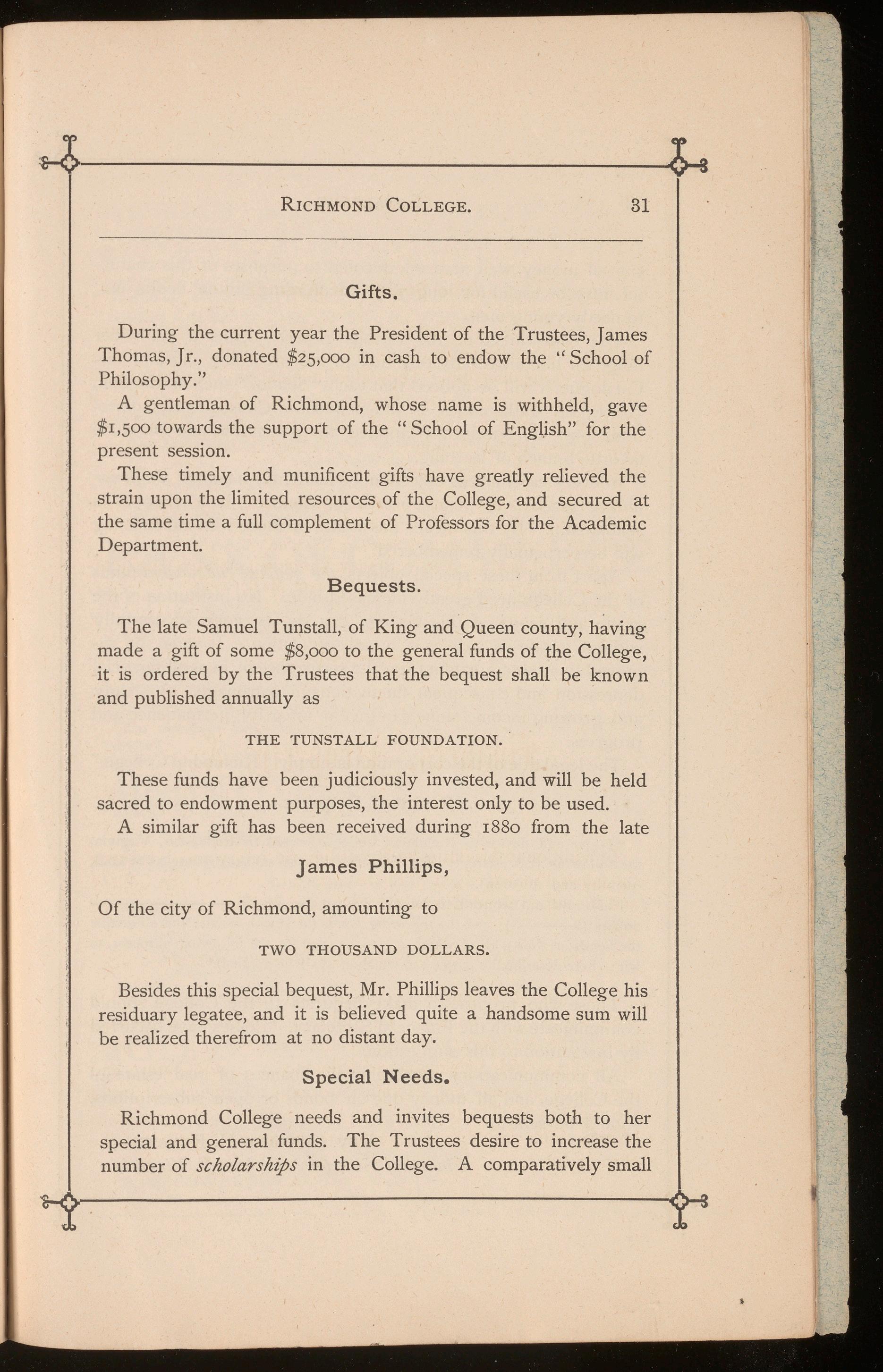 Richmond College needs and invites bequests both to her special and general funds. The Trustees desire to increase the number of scholarships in the College. A comparatively small