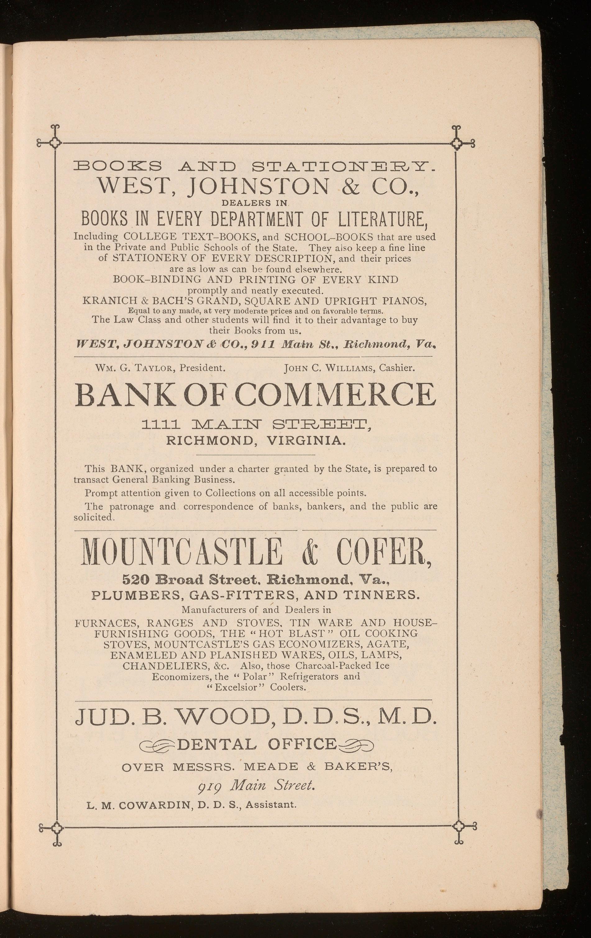 College, Public, Sunday School & Miscellaneous Books, STATIONERY AND FANCY GOODS, PIANOS AND ORGANS, 405 EASTBROADSTREET,RICHMOND,VA.