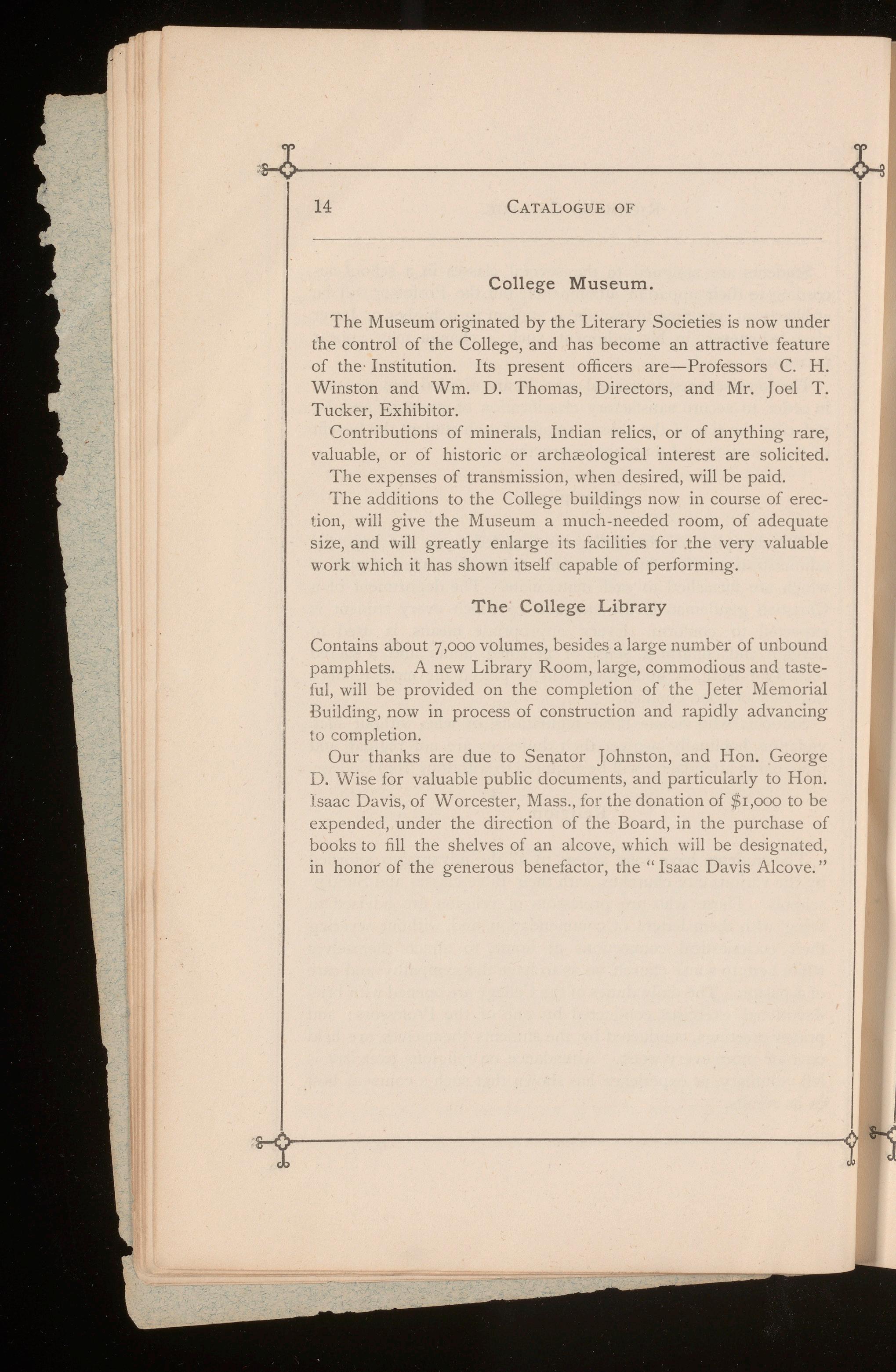 These timely and munificent gifts have greatly relieved the strain upon the limited resources of the College, and secured at the same time a full complement of Professors for the Academic Department.