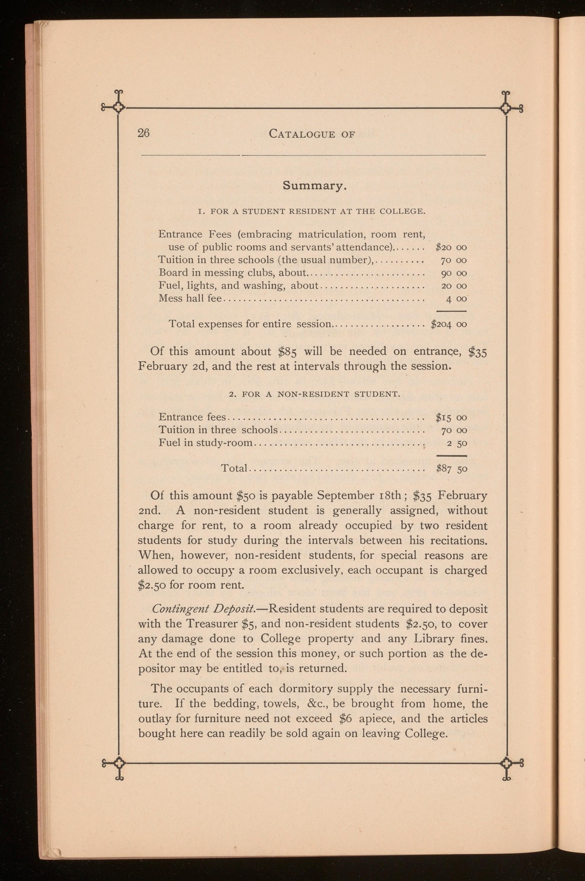 Of this amount $50 is payable September 18th; $35 February 2nd. A non-resident student is generally assigned, without charge for rent, to a room already occupied by two resident students for study during the intervals between his recitations. When, however, non-resident students, for special reasons are allowed to occupy a room exclusively, each occupant is charged $2.50 for room rent.