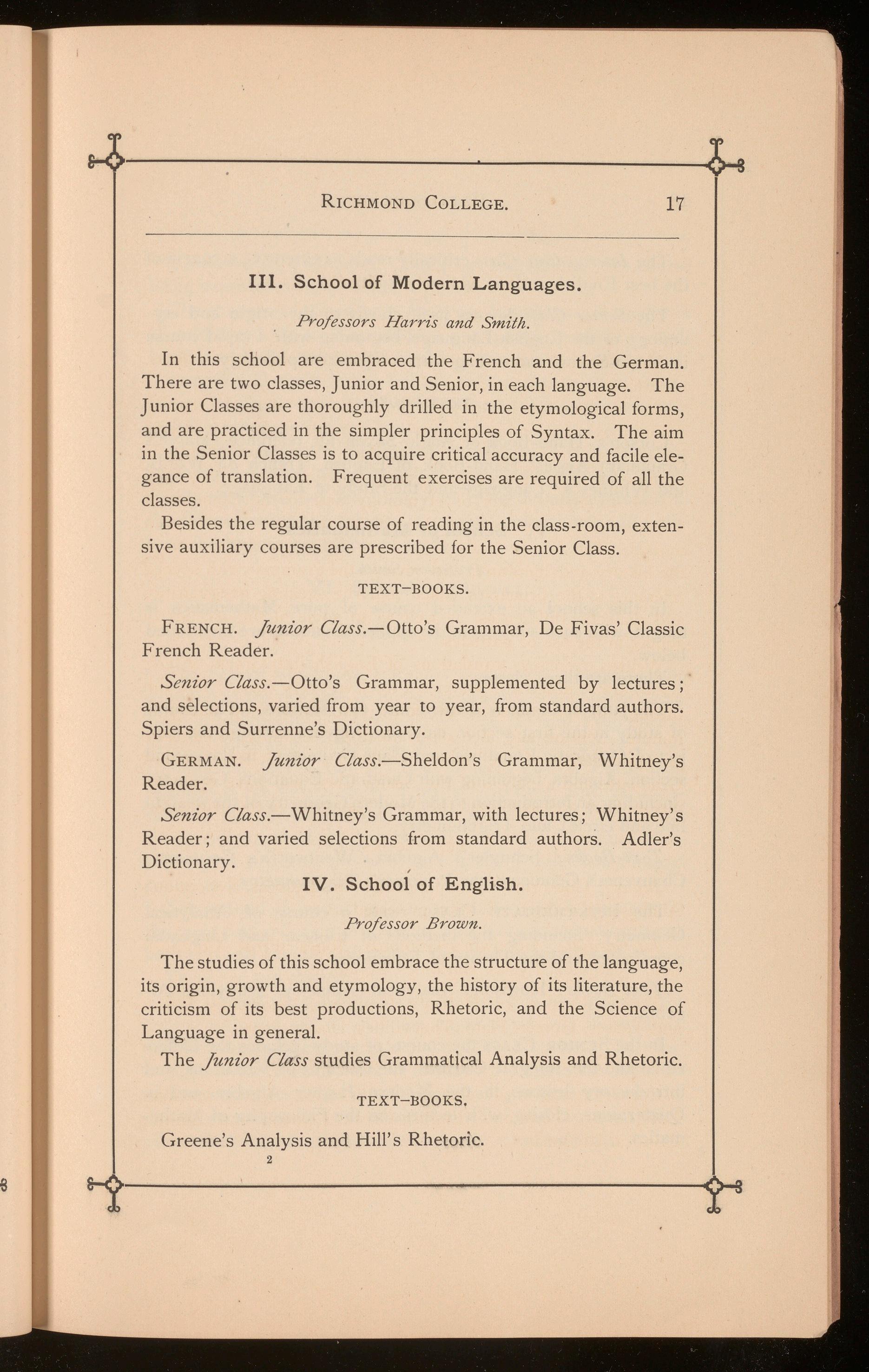 Richmond College needs and invites bequests both to her special and general funds. The Trustees desire to increase the number of scholarships in the College. A comparatively small sum of money, well secured, devoted to purposes of this character, may be useful for long years in affording tuition, books, &c., to needy young men.