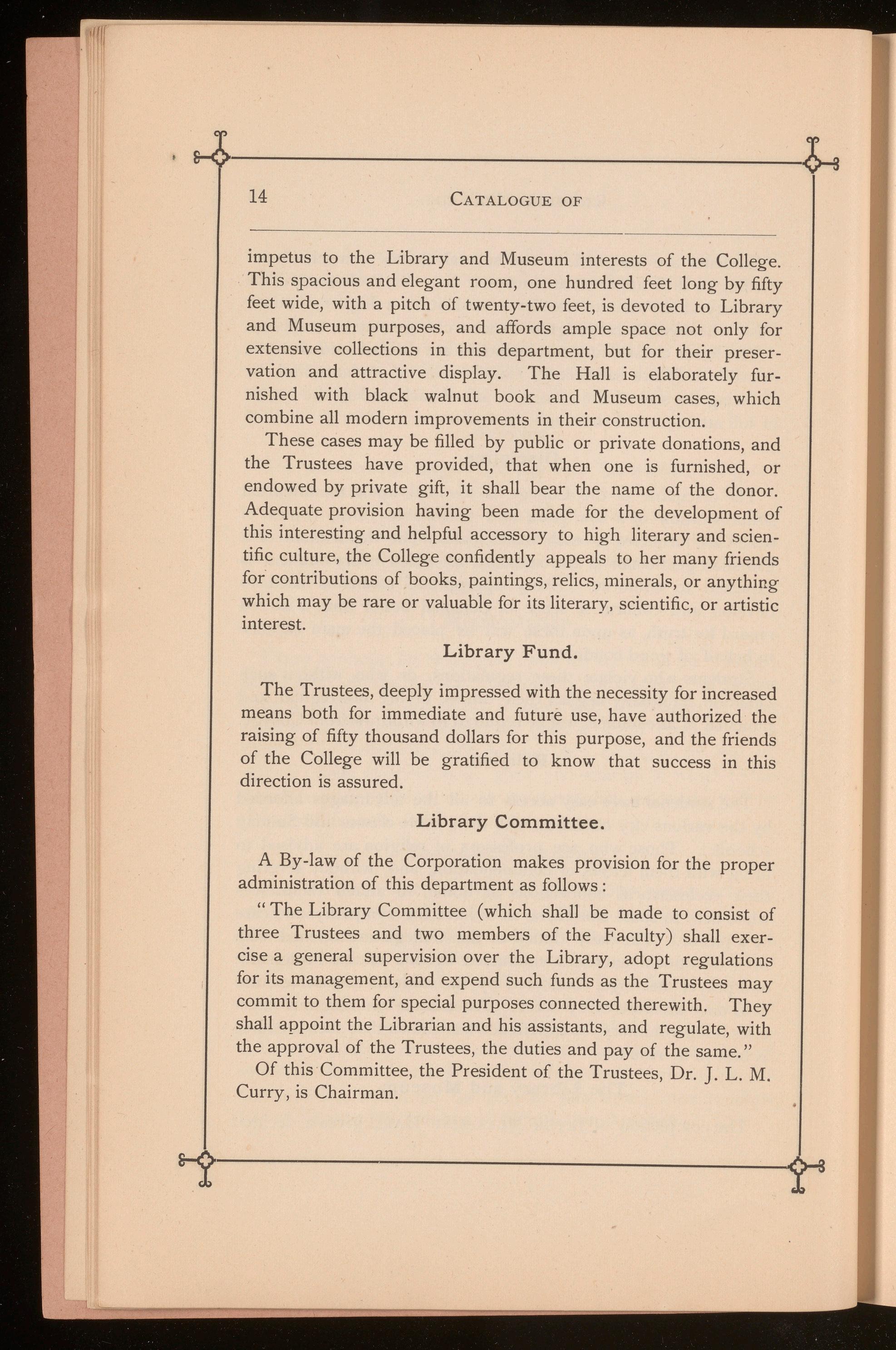 Large and timely gifts have been received from kind and generous friends, North and South, as well as in Virginia, for the library fund of the College. These have enabled the Trustees to place the Library on an independent and generous footing.