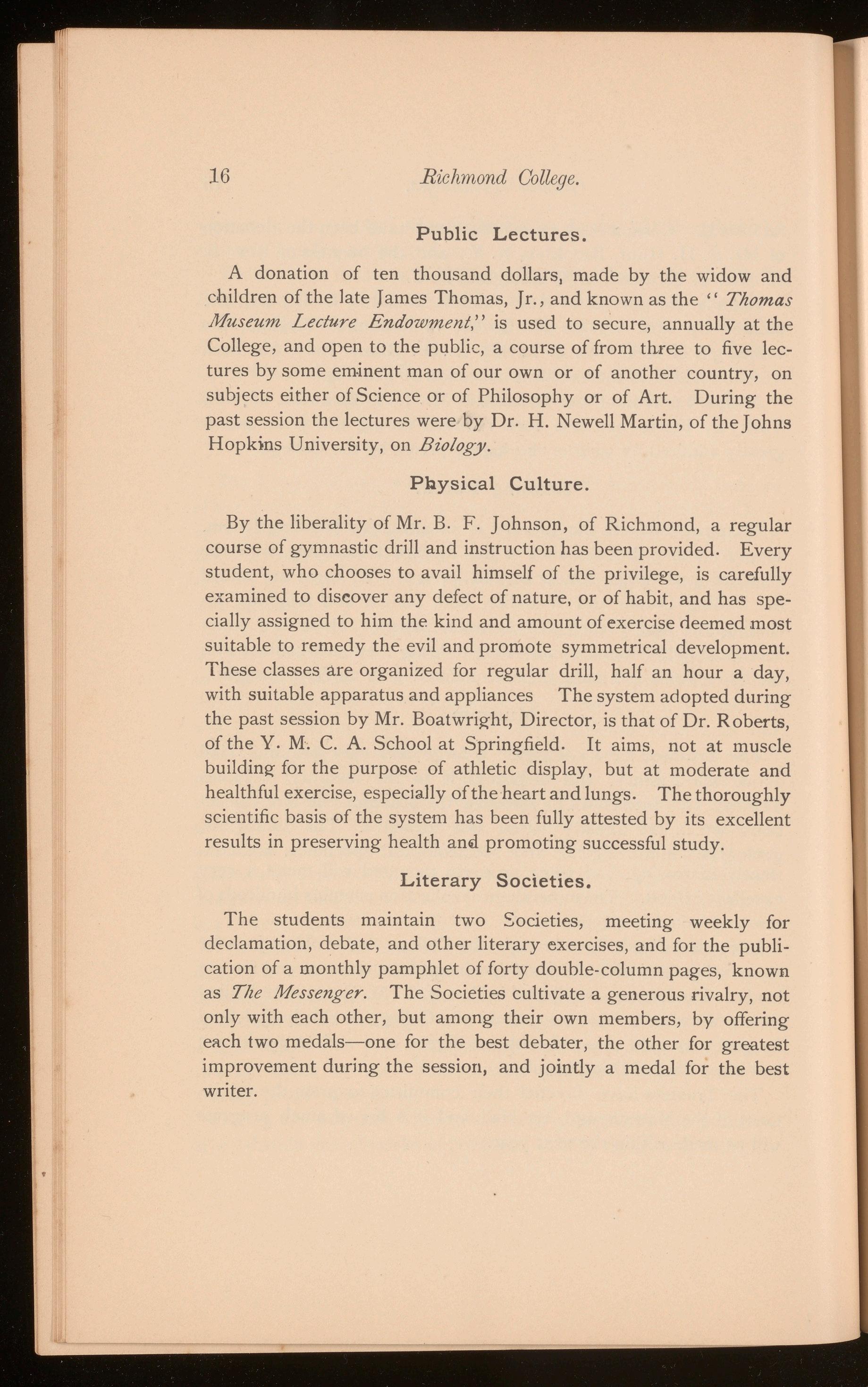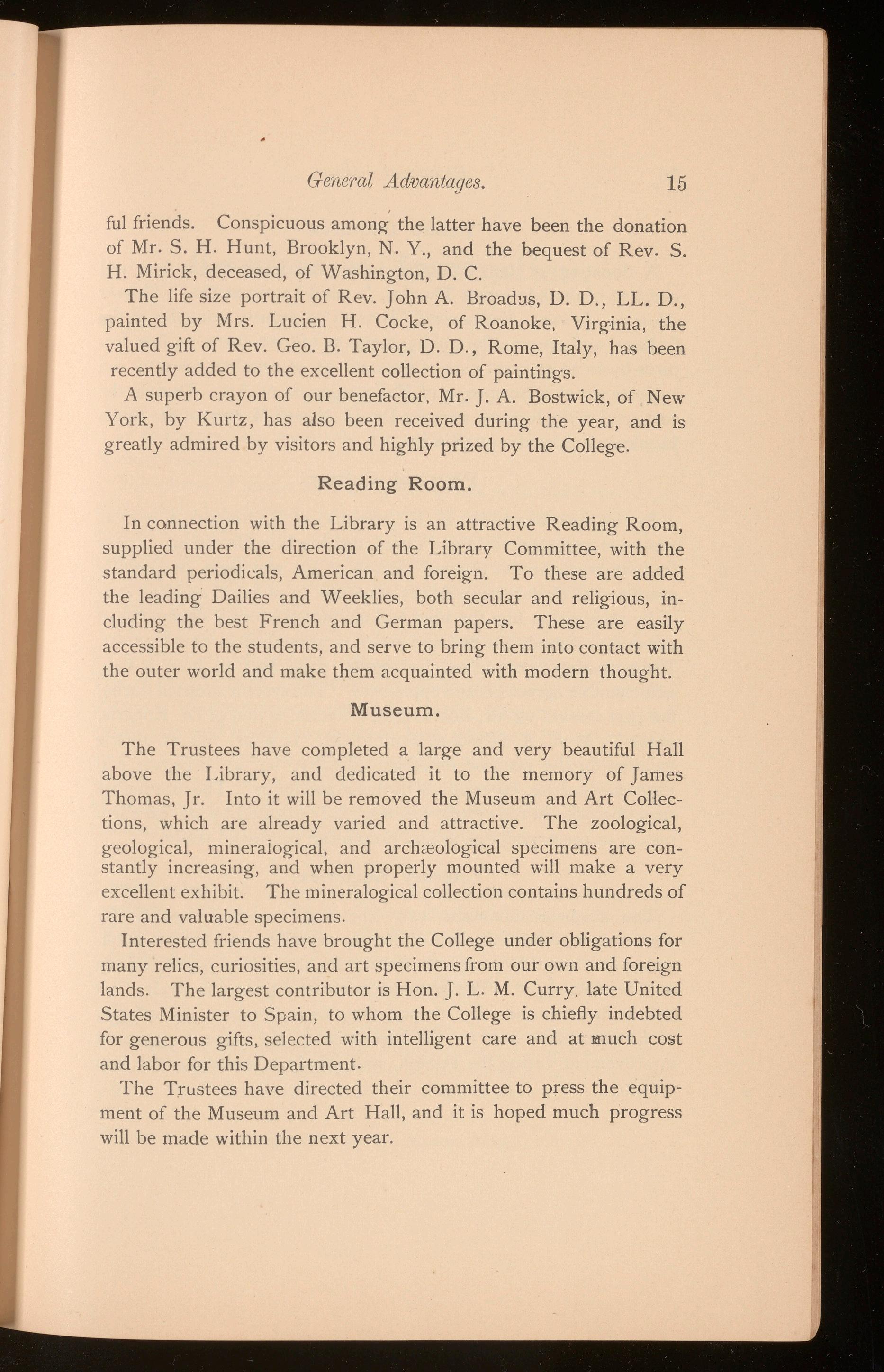 A conspicuous feature of the endowment is the "Bostwick Fund,'' so named from the liberality of Mr. J. A. Bostwick, of New York, who, within recent years, has given the College bonds and stocks whose face value is $50,000, and whose income has proved a great rf'lief to the necessities of the College. Mr. Bostwick leads the benefactors of the College by his unexampled kindness and generosity . He has endeared himself to our people, add linked his name imperishably with Christian education in Virginia and the South.