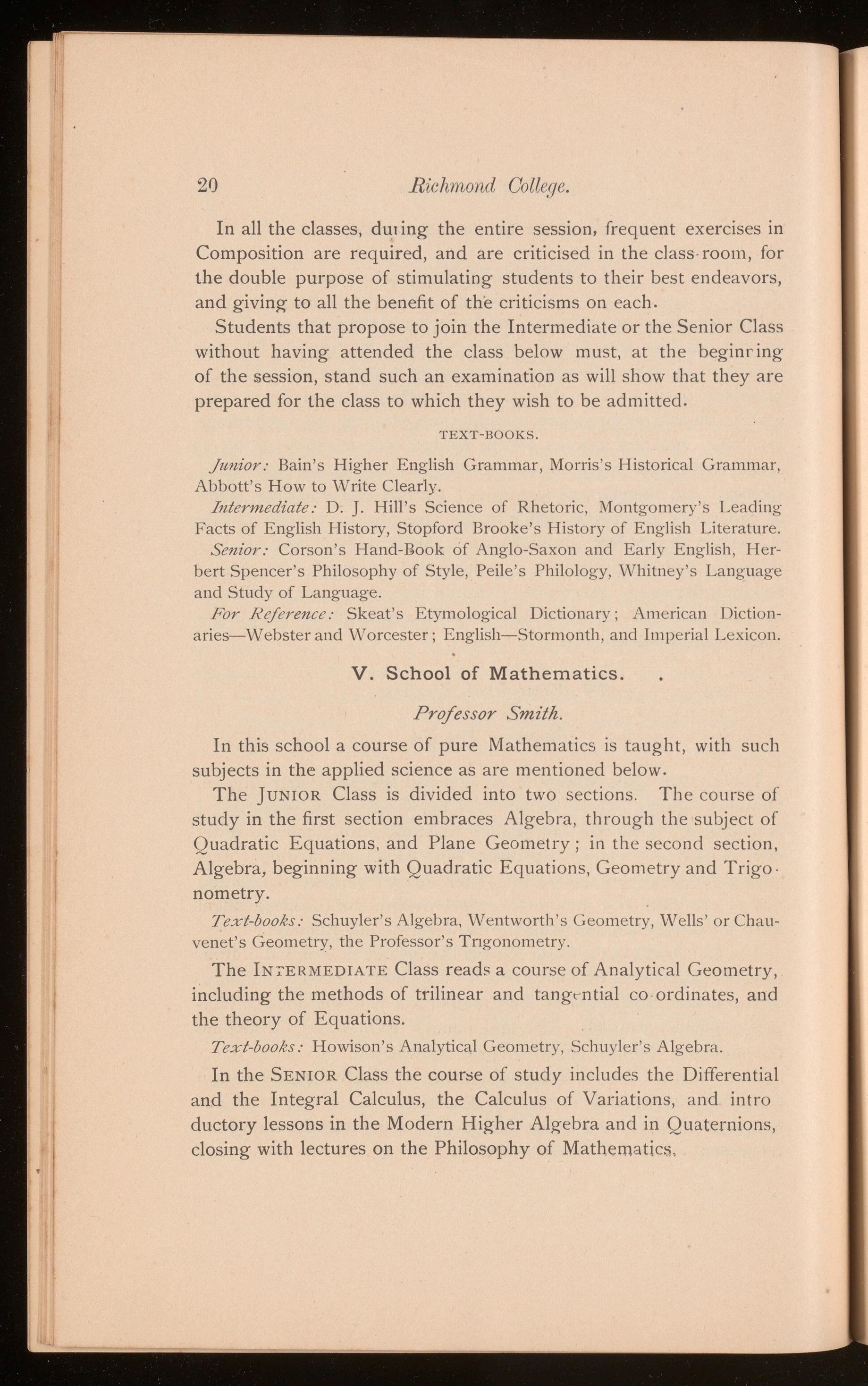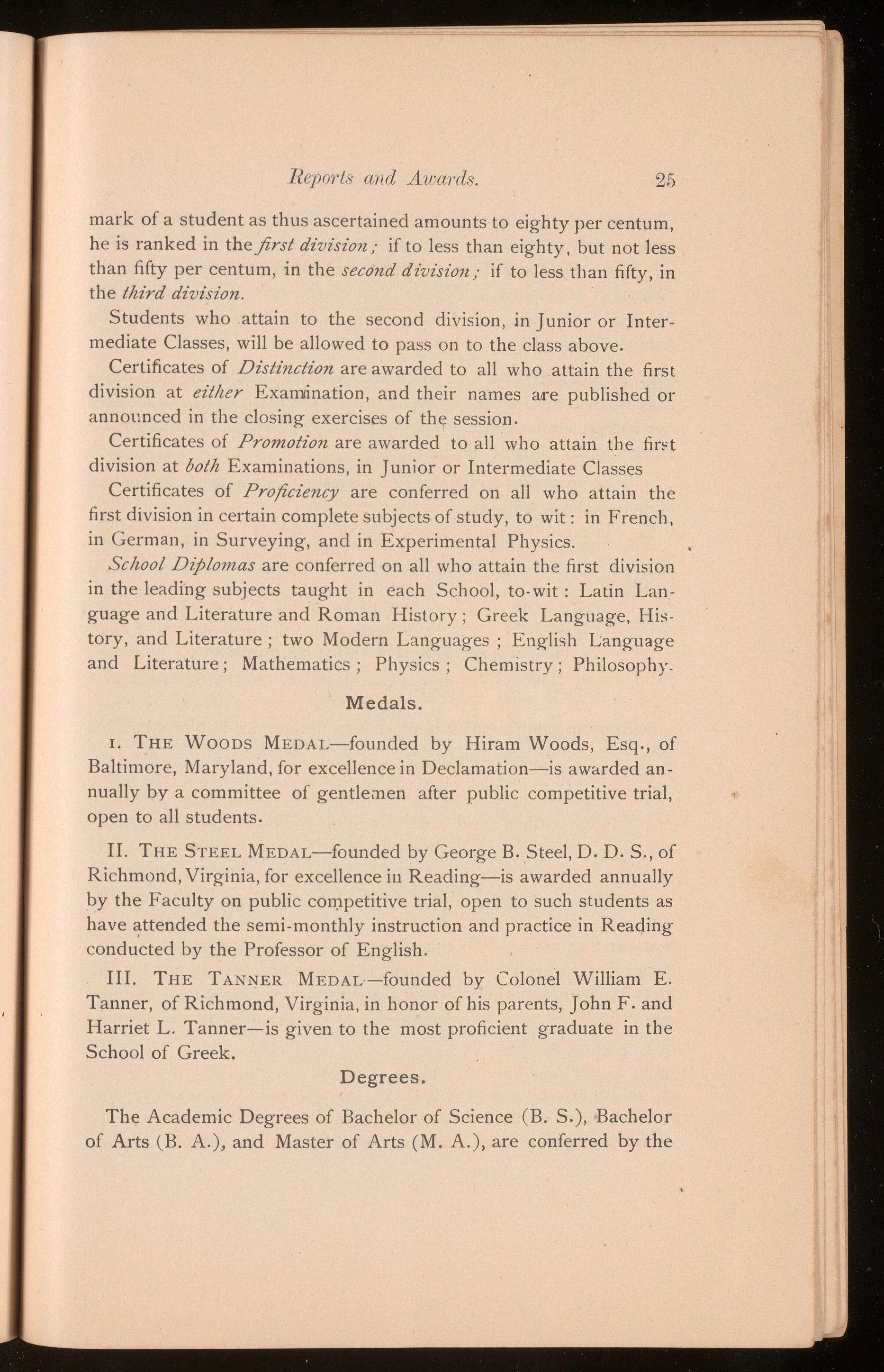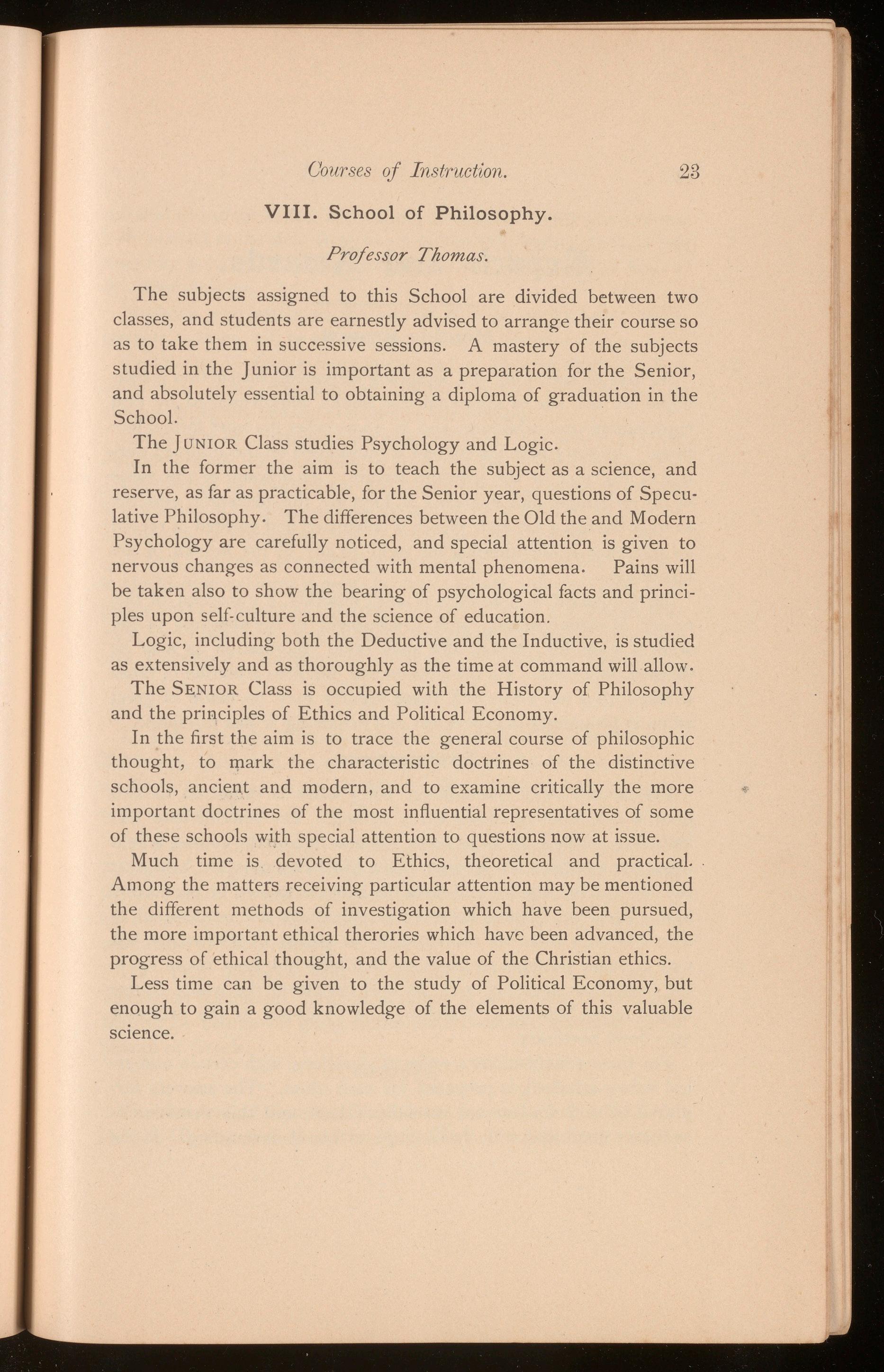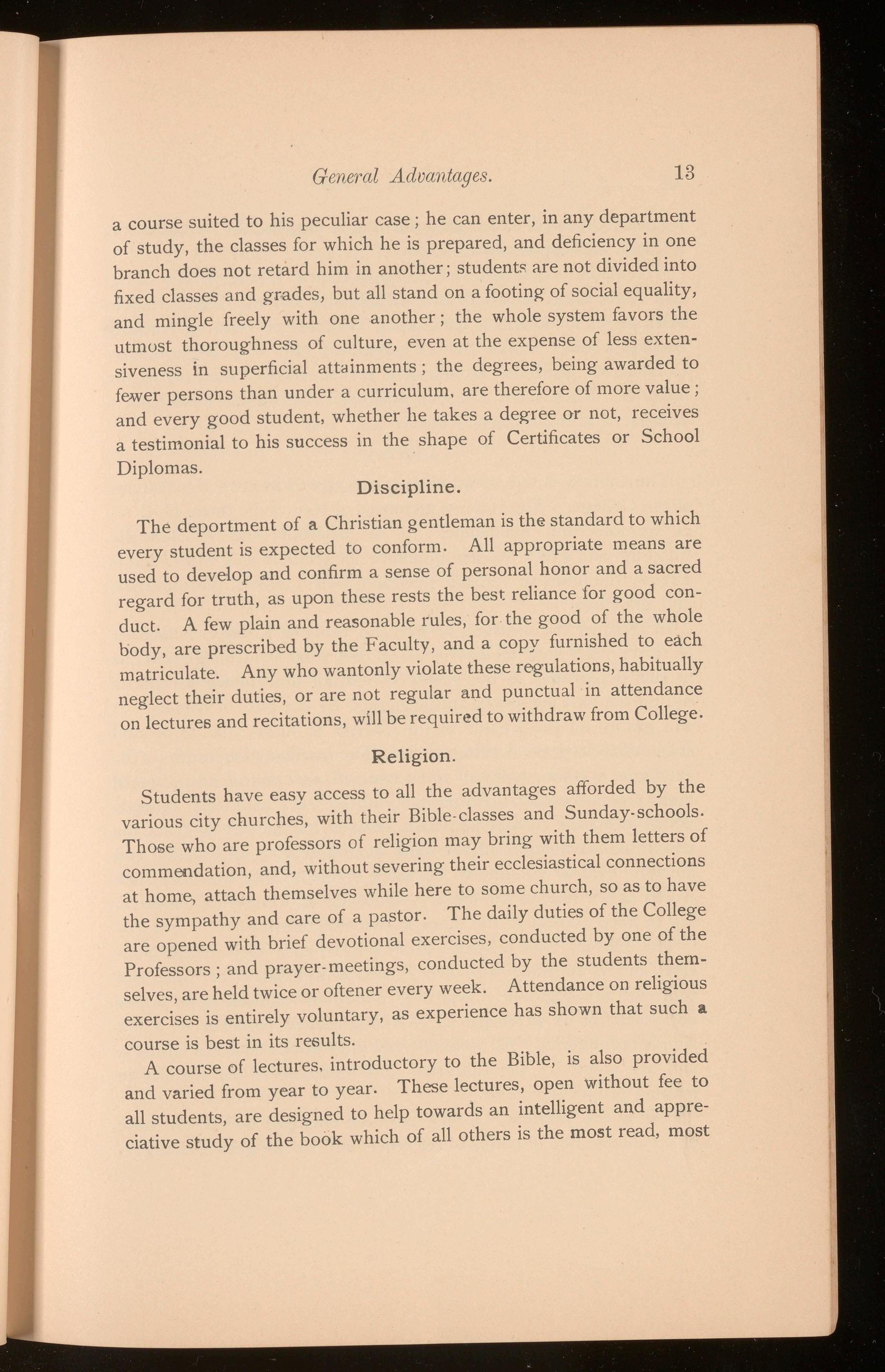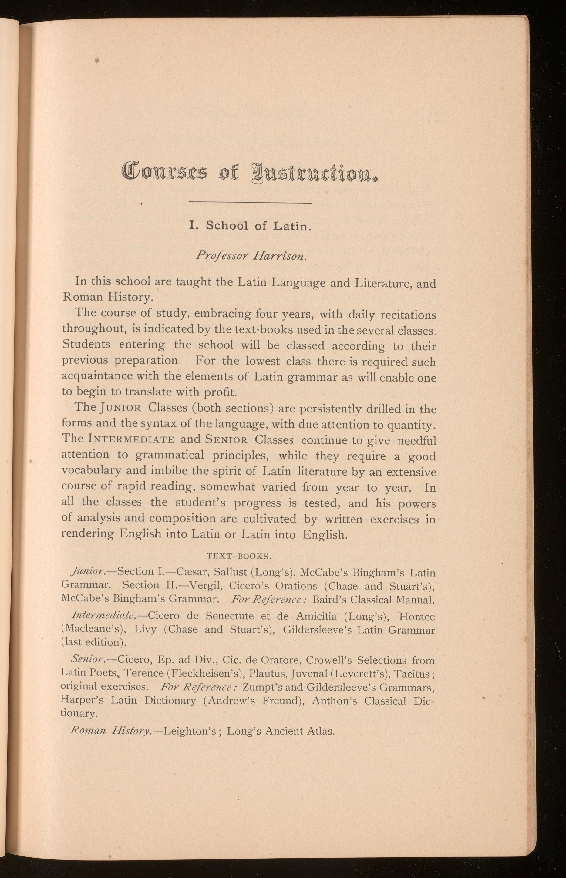 The system of independent schools allows the selection for every student of such studies as will be most valuable in qualifying him for his future pursuits, but while allowing such selection, the Faculty hold that the man is more than the occupation, and will always encourage a regular and complete course. To this end they reserve the right to prescribe the studies of any who may be found unprepared for classes higher than the Junior in Latin, English and Mathe matics.
