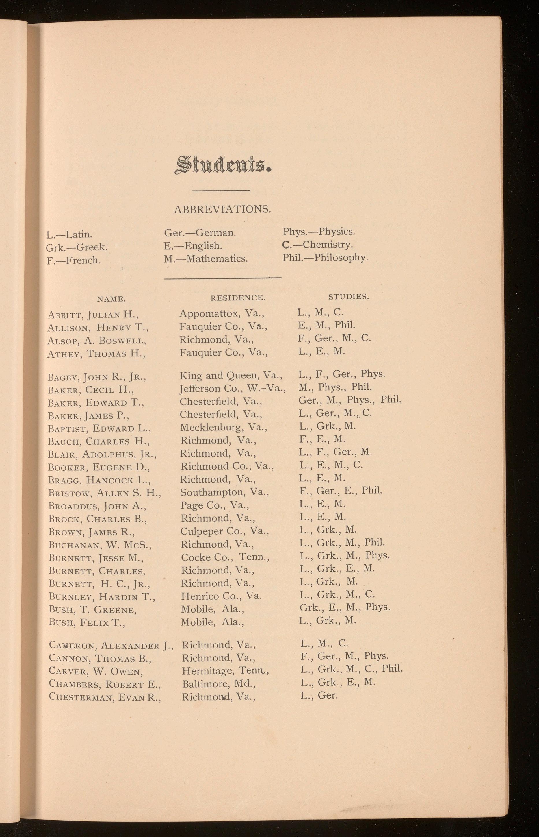BAGBY, JOHN R., JR., BAKER, CECIL H., BAKER, EDWARD T., BAKER, JAMES P., BAPTIST, EDWARD L., BAUCH, CHARLES H., BLAIR, ADOLPHUS, JR., BOOKER, EUGENE D., BRAGG, HANCOCK L., BRISTOW, ALLENS. H., BROADDUS, JOHN A., BROCK, CHARLES B., BROWN, ]AMES R., BUCHANAN, W. McS., BURNliTT, JESSE 1\1., BURNETT, CHARLES, BURNETT, H. c., JR., BURNLEY, HARDIN T., BUSH, T. GREENE, BUSH, FELIX T.,