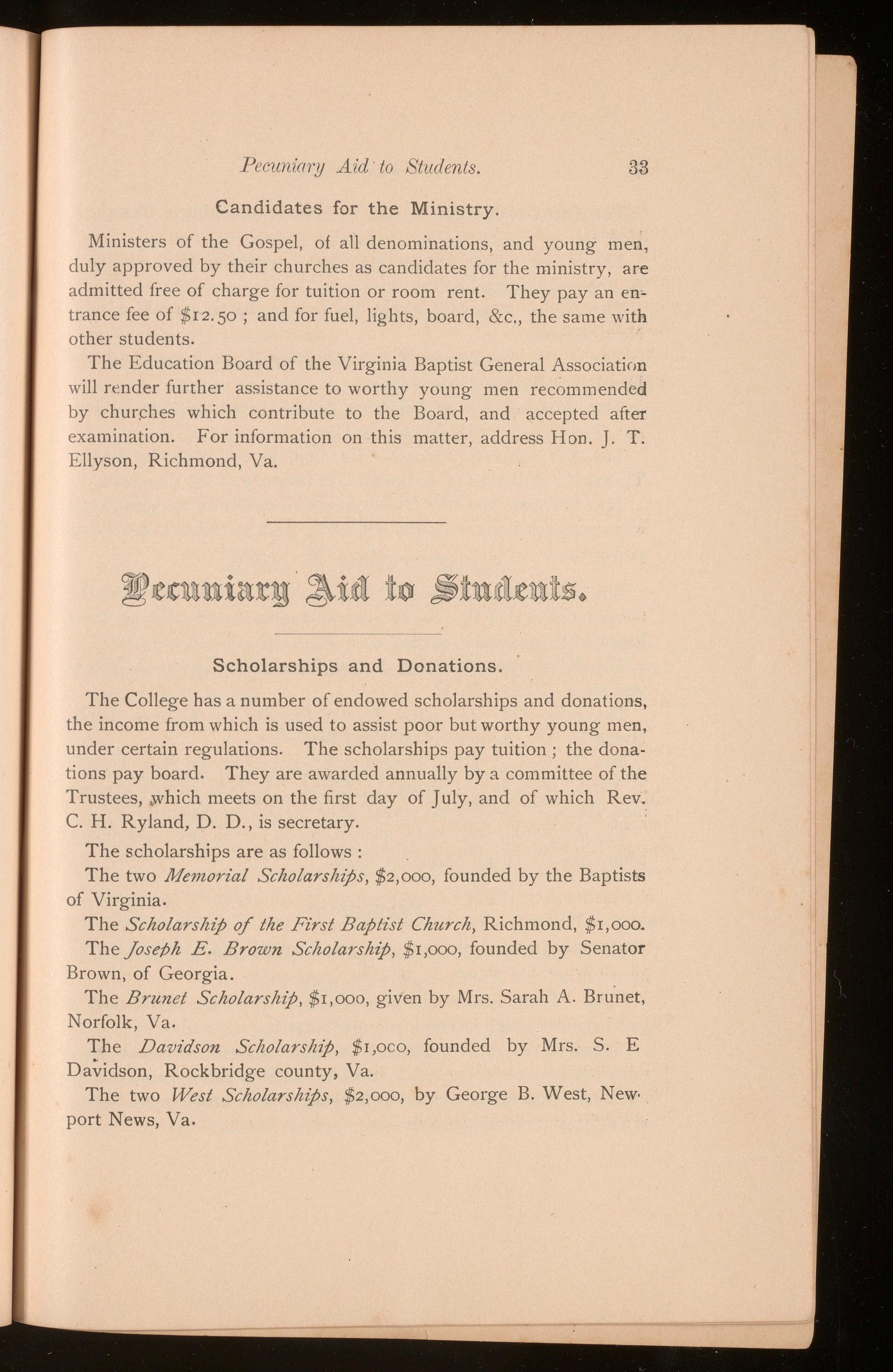 The College has a number of endowed scholarships and donations, the income from which is used to assist poor but worthy young men, under certain regulations. The scholarships pay tuition ; the donations pay board. They are awarded annually by a committee of the Trustees, MThichmeets on the first day of July, and of which Rev. C.H. Ryland, D. D., is secretary.