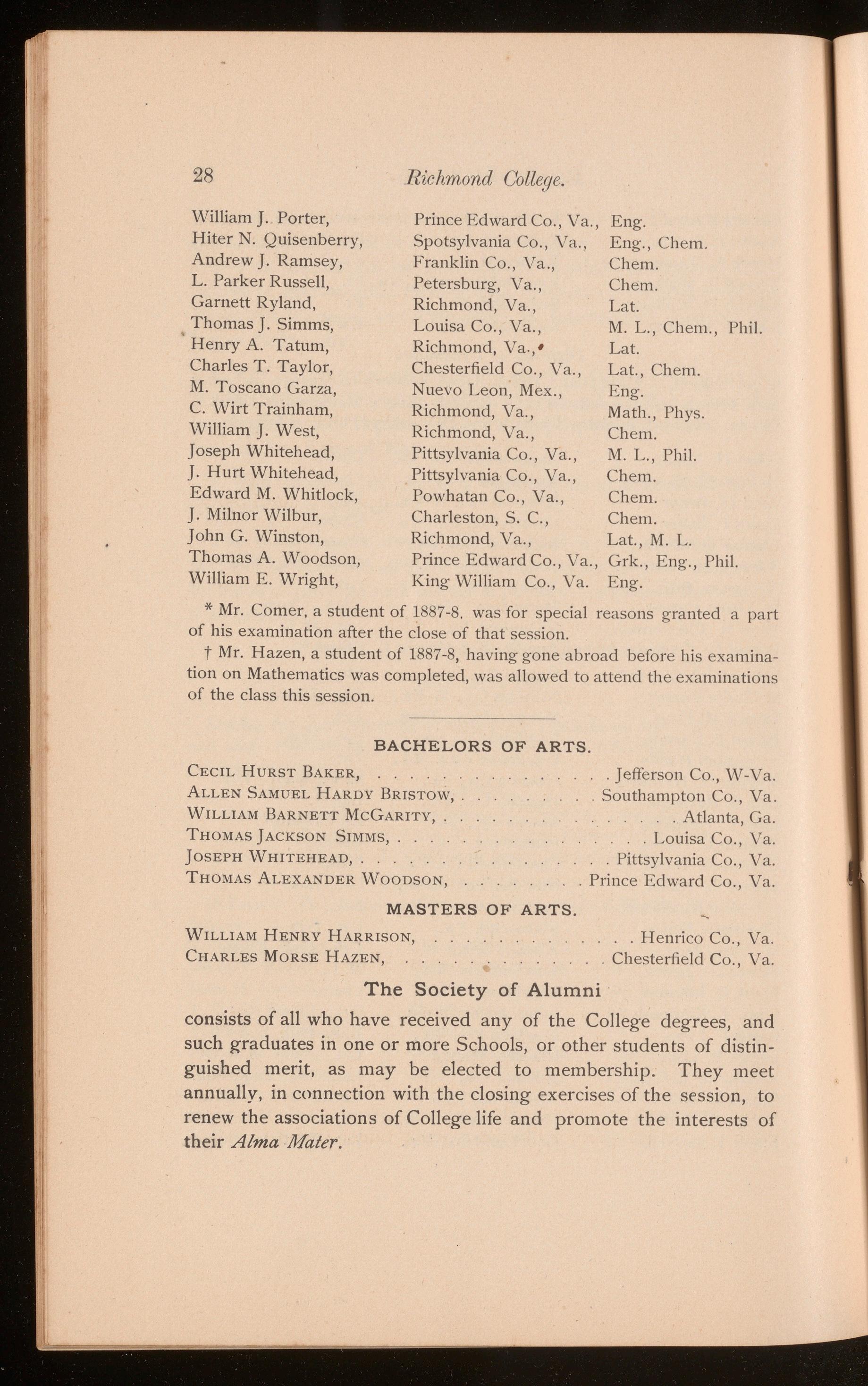 consists of all who have received any of the College degrees, and such graduates in one or more Schools, or other students of distinguished merit, as may be elected to membership. They meet annually, in connection with the closing exercises of the session, to renew the associations of College life and promote the interests of their Alma Mater.
