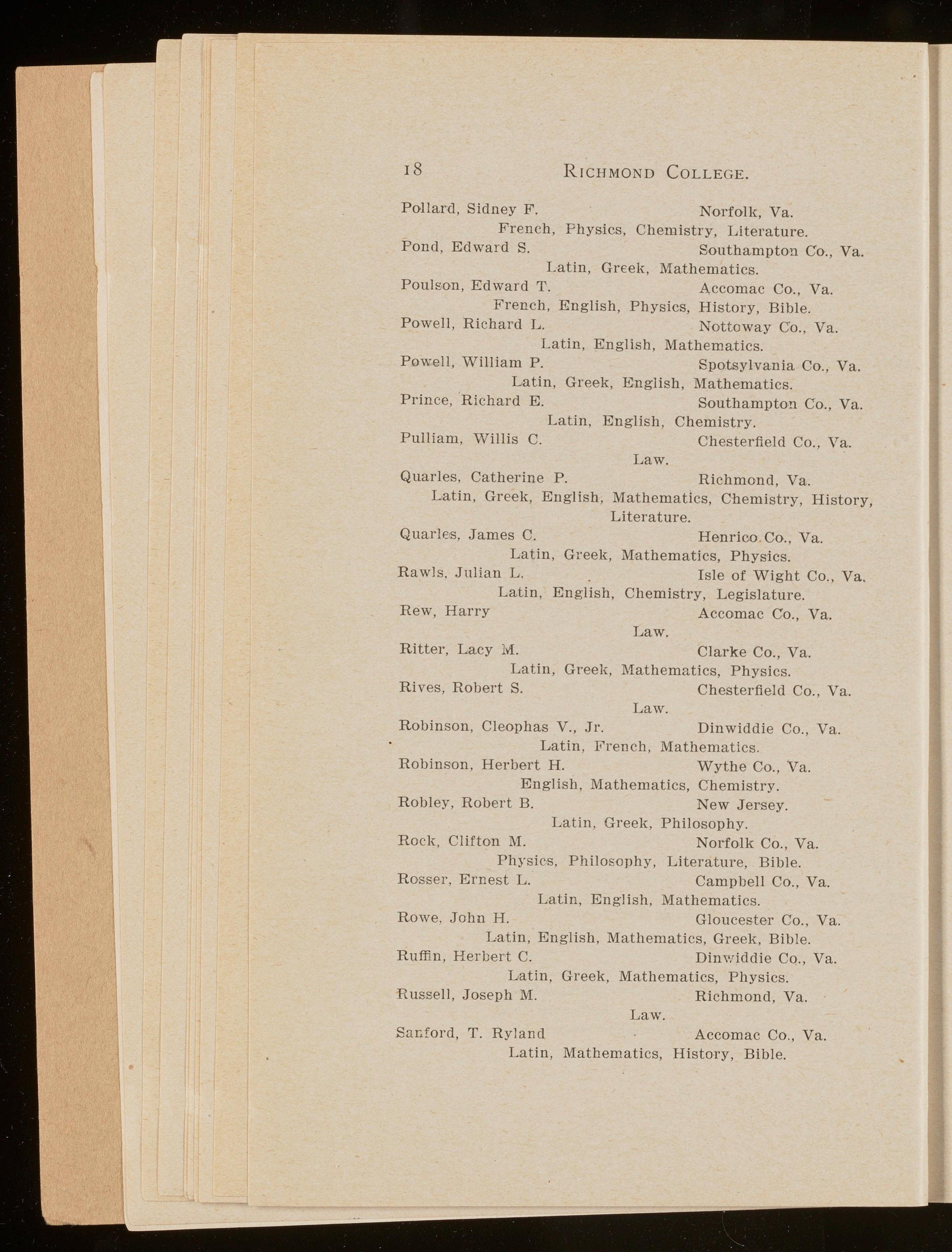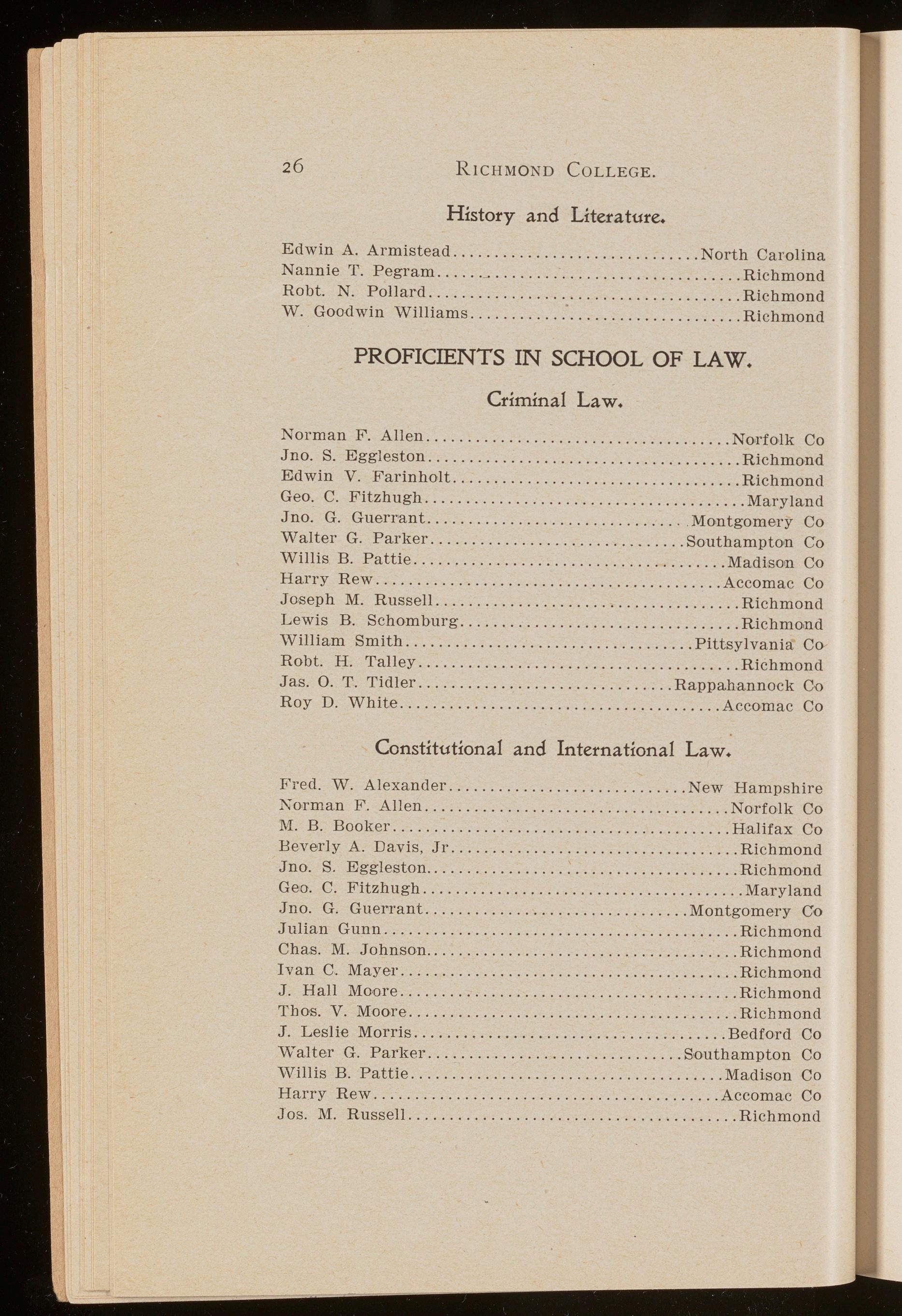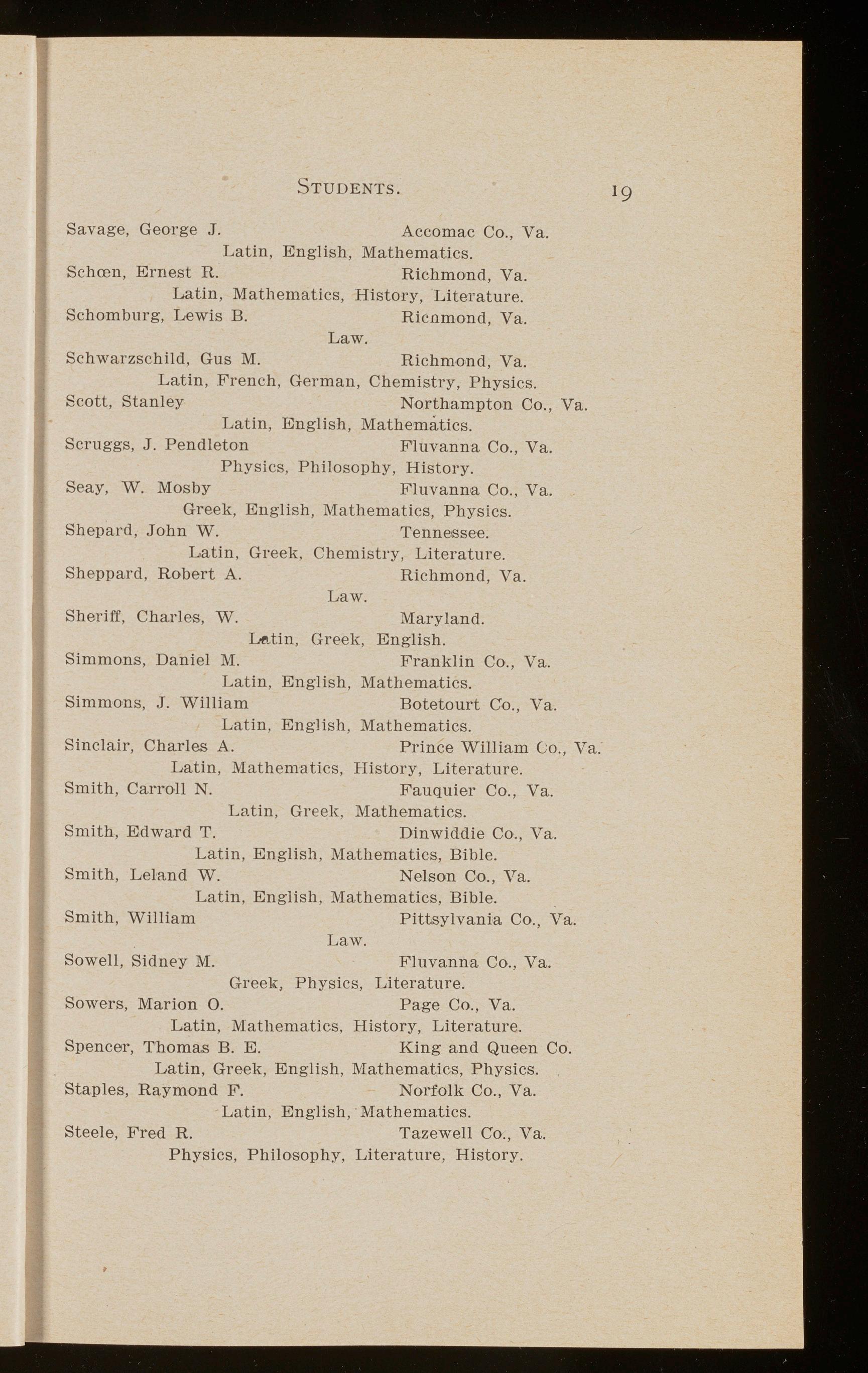 ENDOWMENT.-J. L. M. Curry, R. s. Bosher, T. C. Williams, Jr., H. L. Schmelz, J. T. Ellyson, J. T. Griffin, Geo. B. West, T. H. Ellett, B. A. Hancock. lNBTRUCTION.-W. R. L. Smith, J. R. Garlick, J. Ryland, J. M. Pilcher, J. T. Ellyson. F1NANCE.-John C. Williams, H. R. Pollard, Thos. C. Williams, Jr., J. T. Ellyson, John T. Griffin, B. A. Han- cock. GROUNDSAND BUILDINGS.-J. J. Montague, R. s. Bosher, H. w. Davis, R. H. Pitt, A. R. Courtney. LAw ScHOOL.-T. C. Williams, Jr., C. V. Meredith, C. R. Sands, A. J. Montague, and Professor Roger Gregory. Arn FUNDS (Scholarships and Donations).-Josiah Ryland, Geo. Swann, Geo. Cooper, J. M. Pilcher, R. H. Pitt. LlBRARY.-Geo. Cooper, H. R. Pollard, Geo. B. Steel, W. R. L. Smith, Professors Thomas and Kellogg. ACADEMIES.-J. R. Bagby, Geo. w. Beale, C. F. James, Geo. B. West, F. C. McConnell. NOMINATIONS.-W. R. Barksdale, T. s. Dunaway, I. B. Lake, H. L. Schmelz, J. H. Hargrave, A. E. Owen.