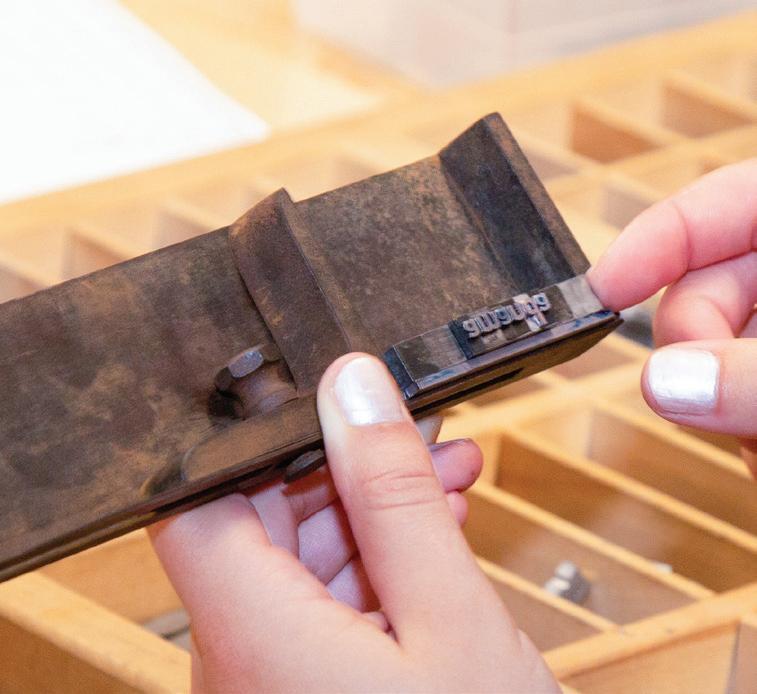 Sarah Wirth, ’26, bottom, typesets the cover copy for this issue with the help of Jen Thomas, program director of the Book Arts Studio in Boatwright Memorial Library. They are using a Vandercook No. 4 proof press manufactured in 1950 and purchased with funds donated by the Friends of Boatwright Memorial Library. The “101” and “of” blocks are wood type that probably dates to 1828.