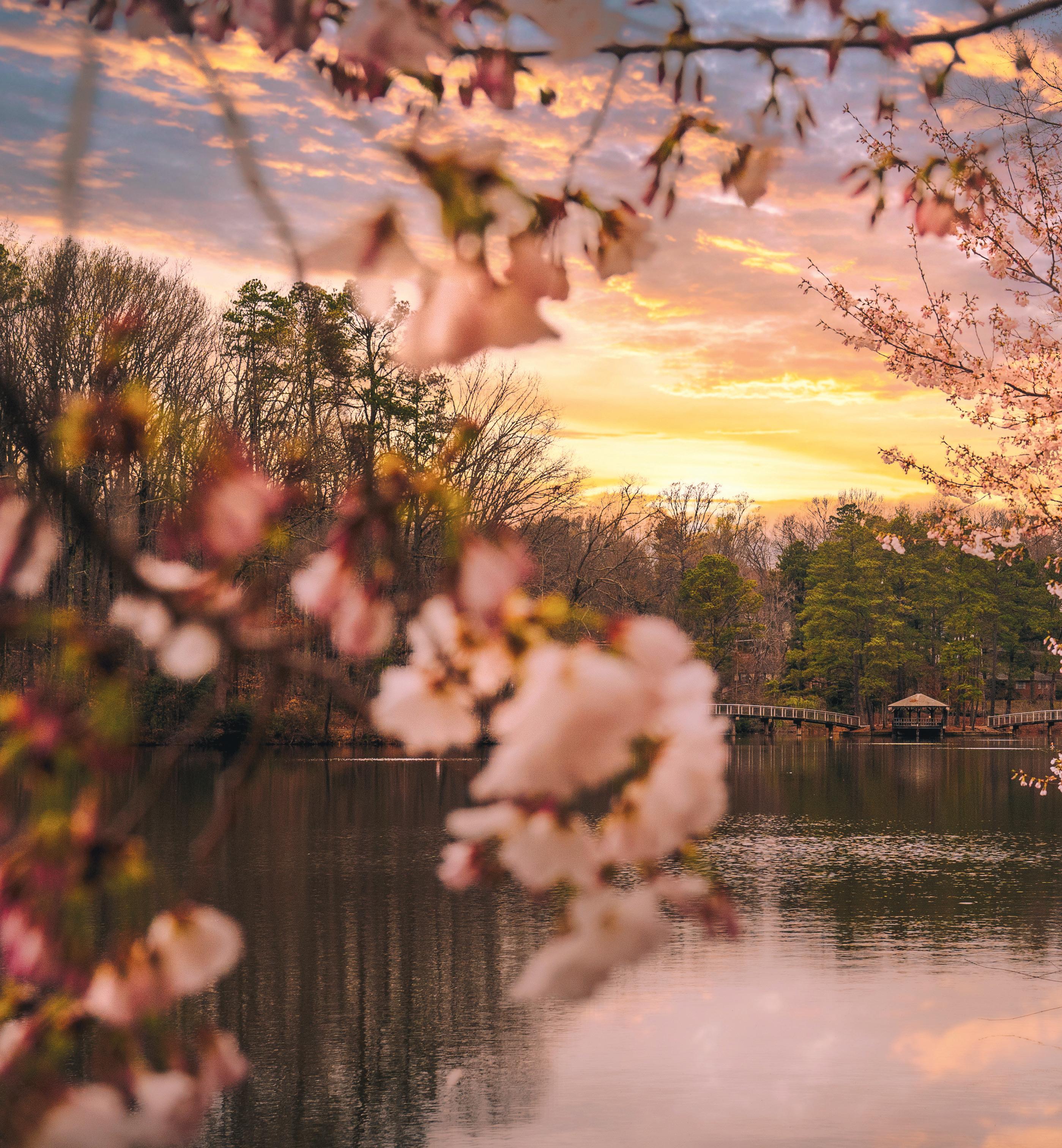 The late afternoon sun casts a glow across Westhampton Lake as the cherry trees blossom in the spring.